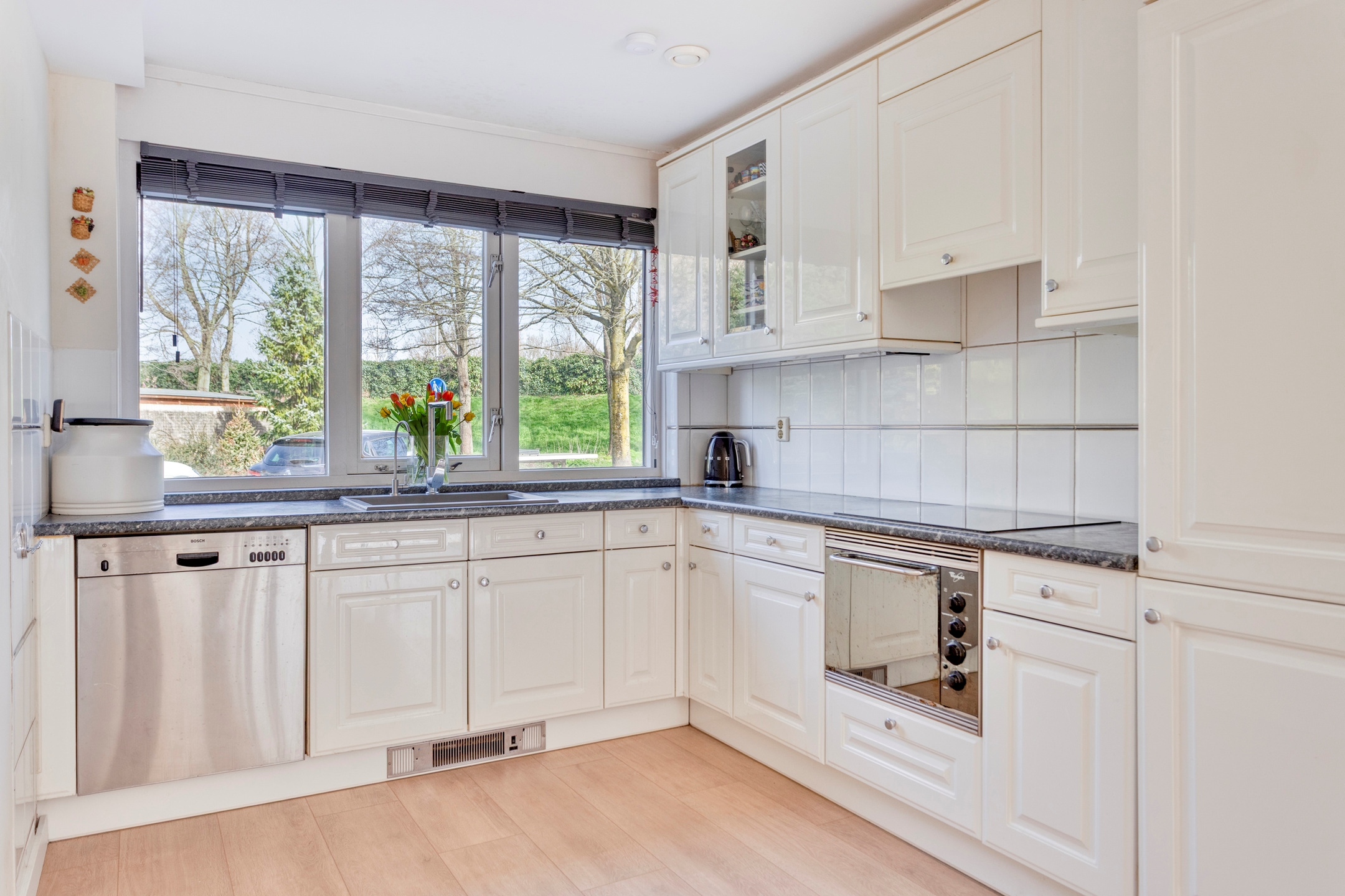 Keuken, een open keuken gelegen aan de voorzijde van de woning met uitzicht op een groenstrook. Een keukenblok in L-vormige opstelling met een inductiekookplaat met afzuigkap, oven, vaatwasser, koel/vriescombinatie en close-in boiler.