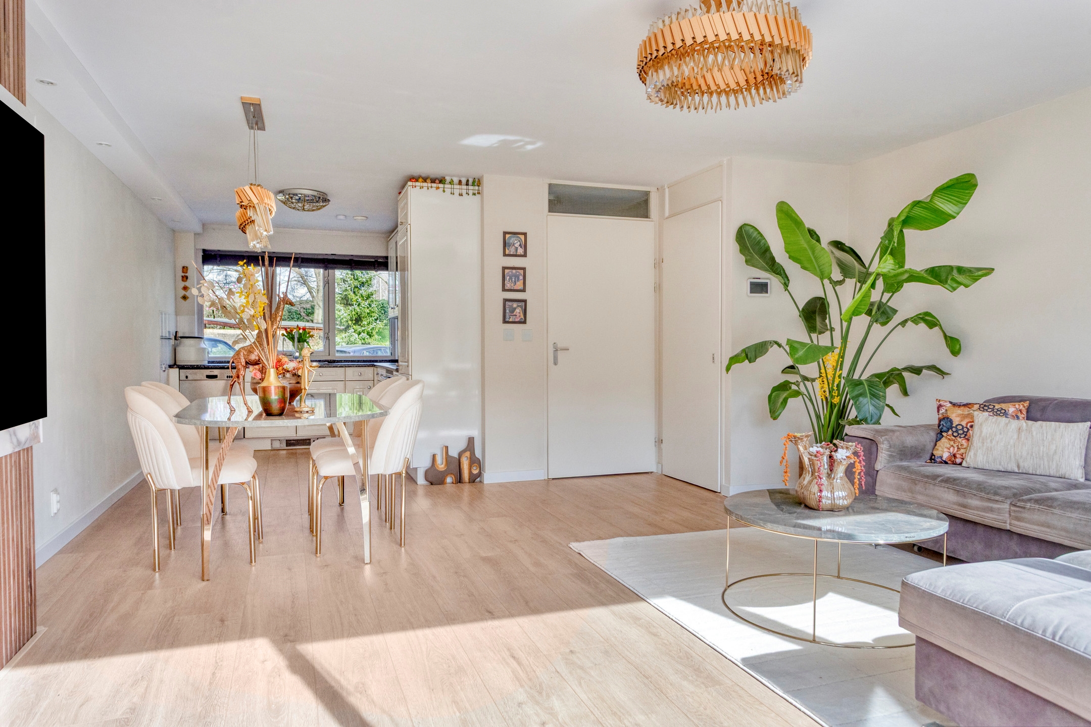 Woonkamer, een lichte tuingerichte woonkamer, voorzien van een fraaie cinema wall met elektrische sfeerhaard, airconditioning (verwarmen/koelen) en toegang tot de open keuken, kast (onder de trap) en de achtertuin.