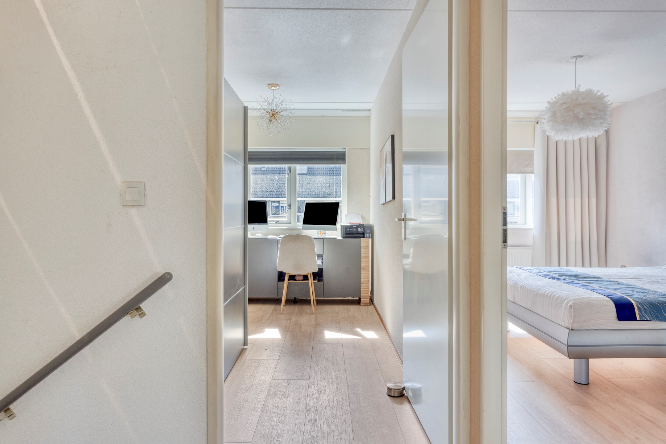 Overloop, met toegang tot 3 slaapkamers, de badkamer en de trapopgang naar de tweede verdieping.