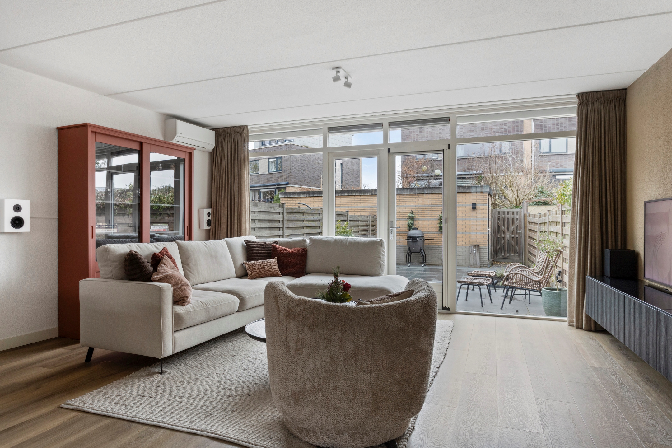 Woonkamer, een opvallend lichte en tuingerichte woonkamer voorzien van airconditioning, met toegang tot de open keuken en achtertuin middels openslaande deuren.