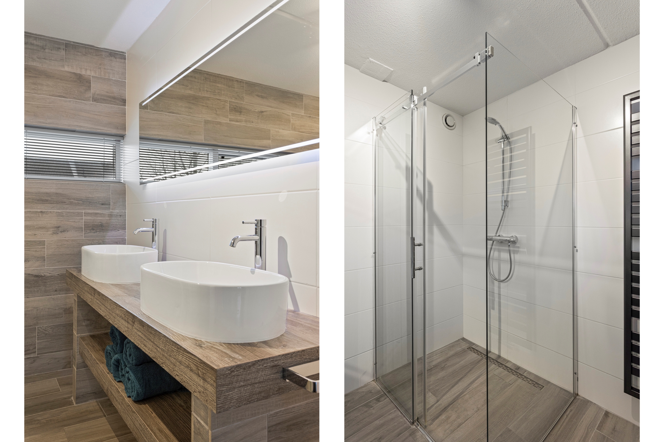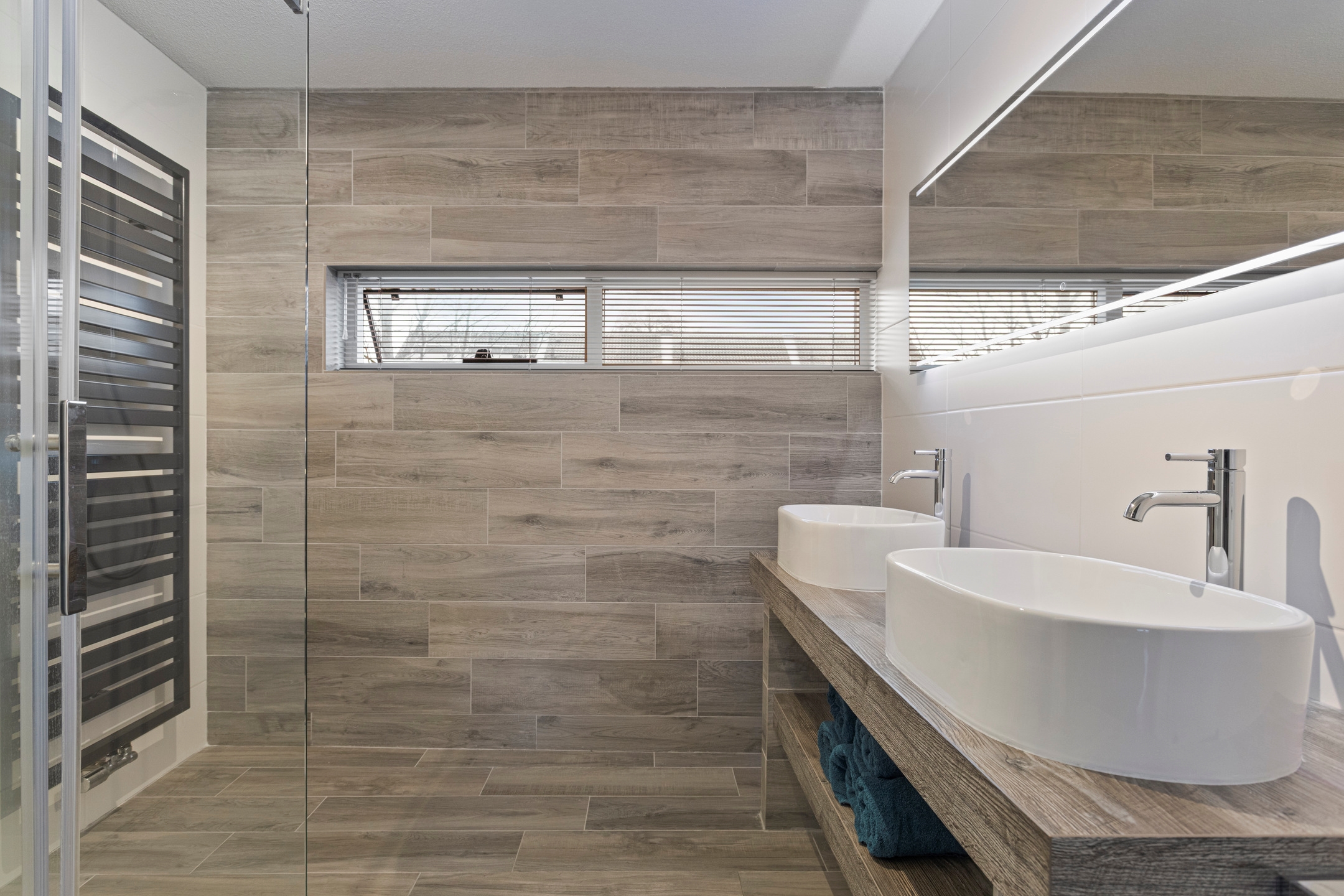 Badkamer, een moderne en ruime badkamer gelegen aan de voorzijde, voorzien van een inloopdouche met thermostaatkraan, 2 waskommen met mengkranen en een onderkast, brede spiegel met verlichting, badkamerradiator, mechanische ventilatie en een te openen raam.
