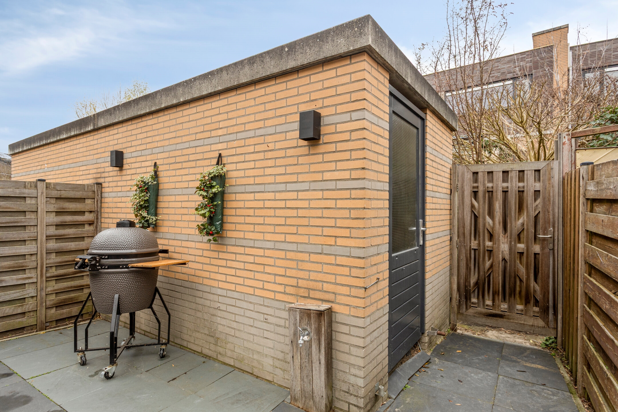 Achtertuin, gelegen op het noordwesten, voorzien van bestrating, een groene border, bevat een stenen berging, elektrische zonwering, buitenkraan en een achterom.