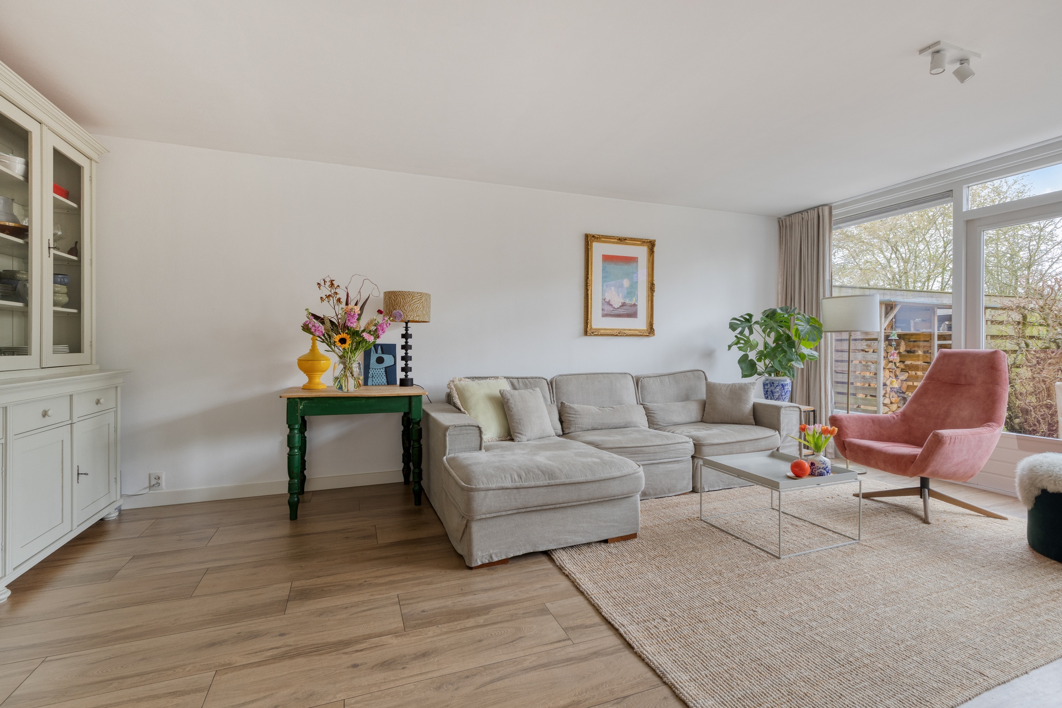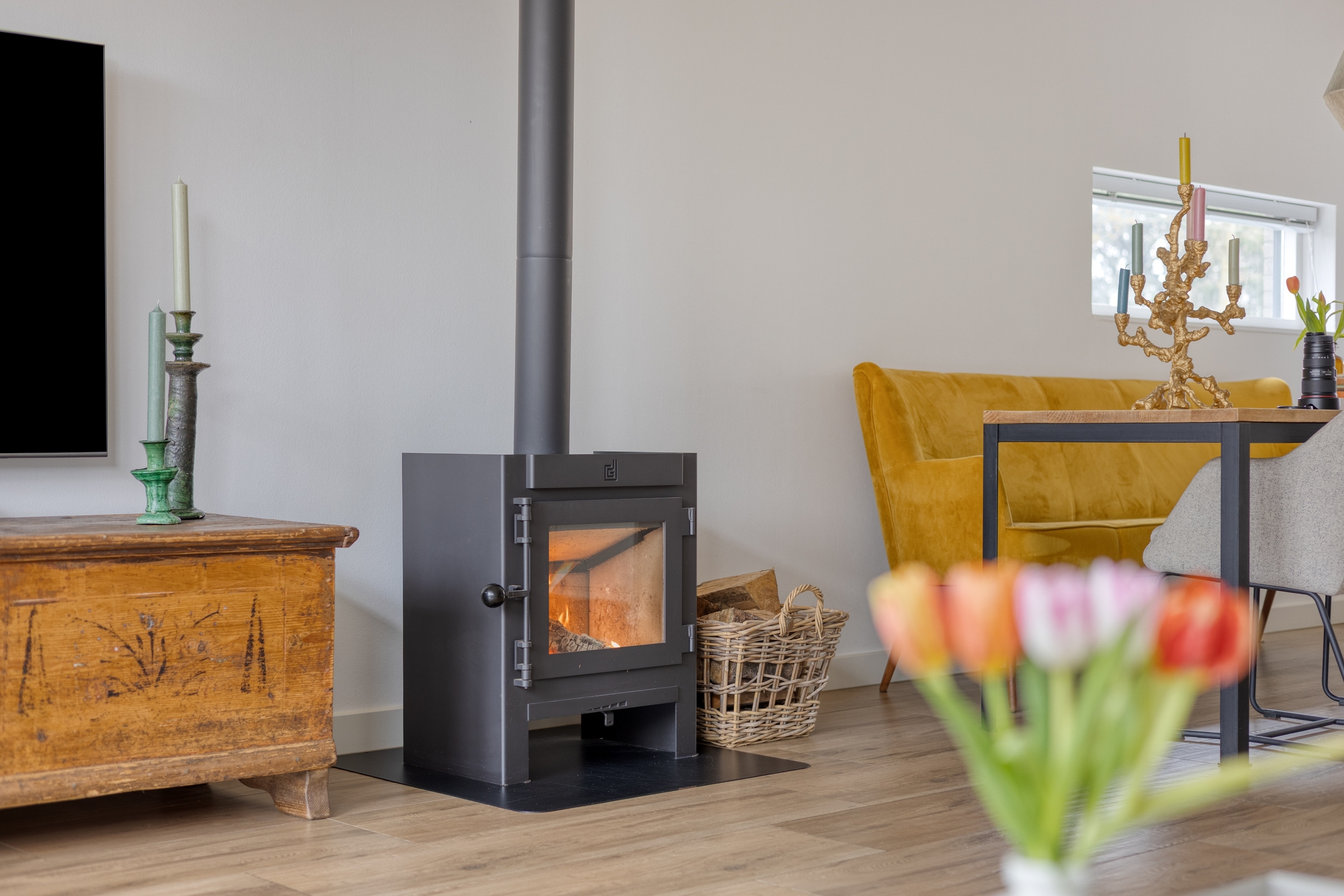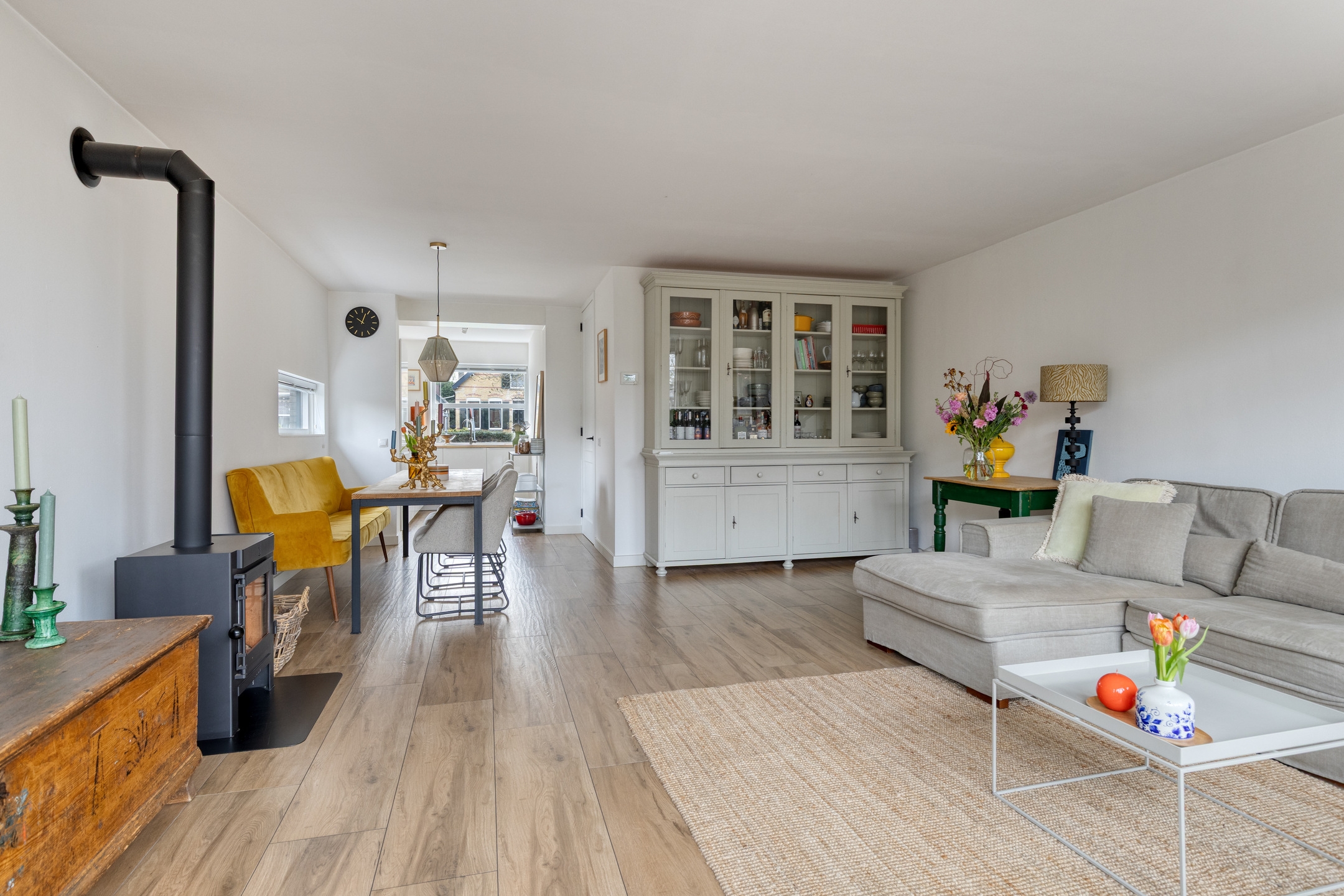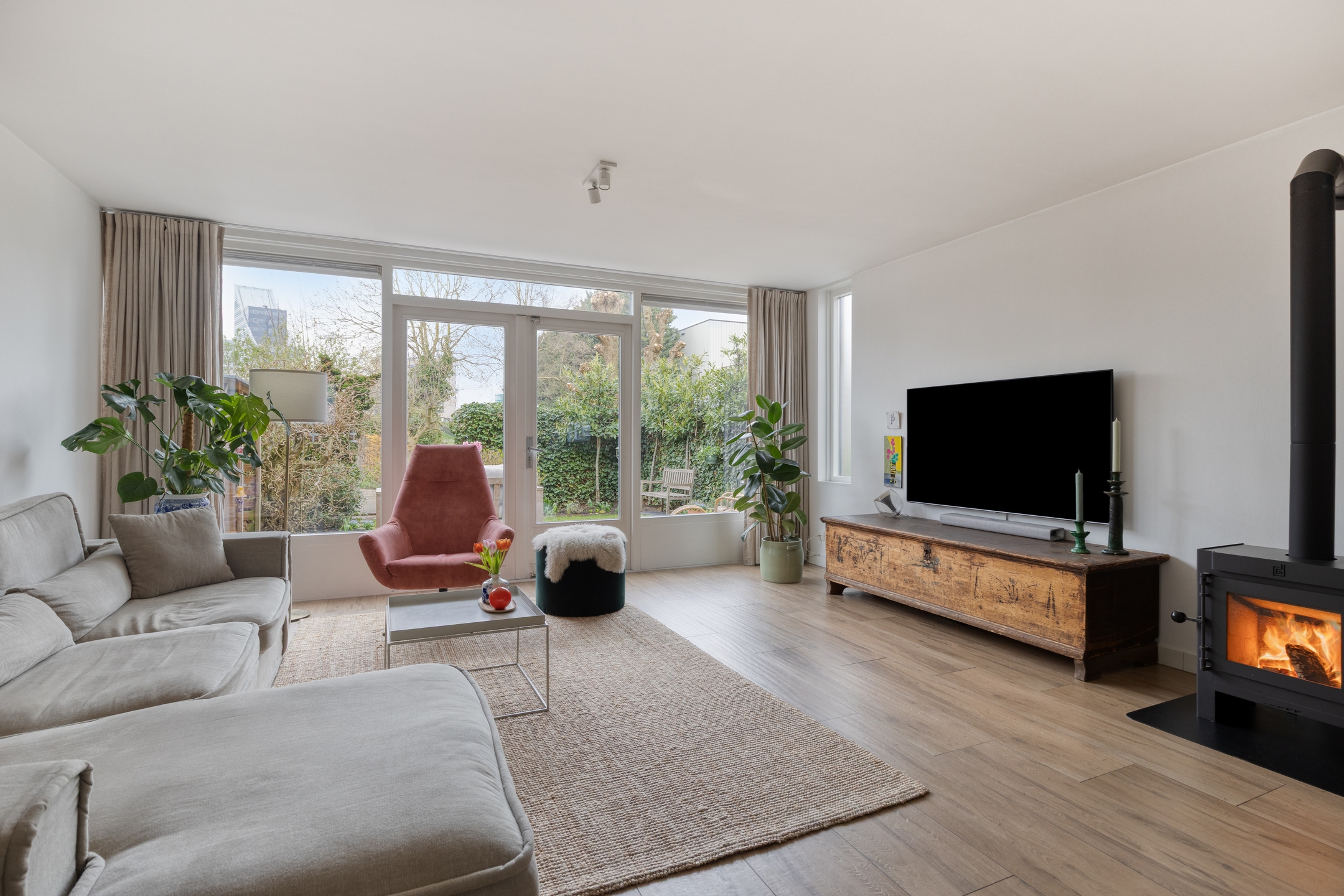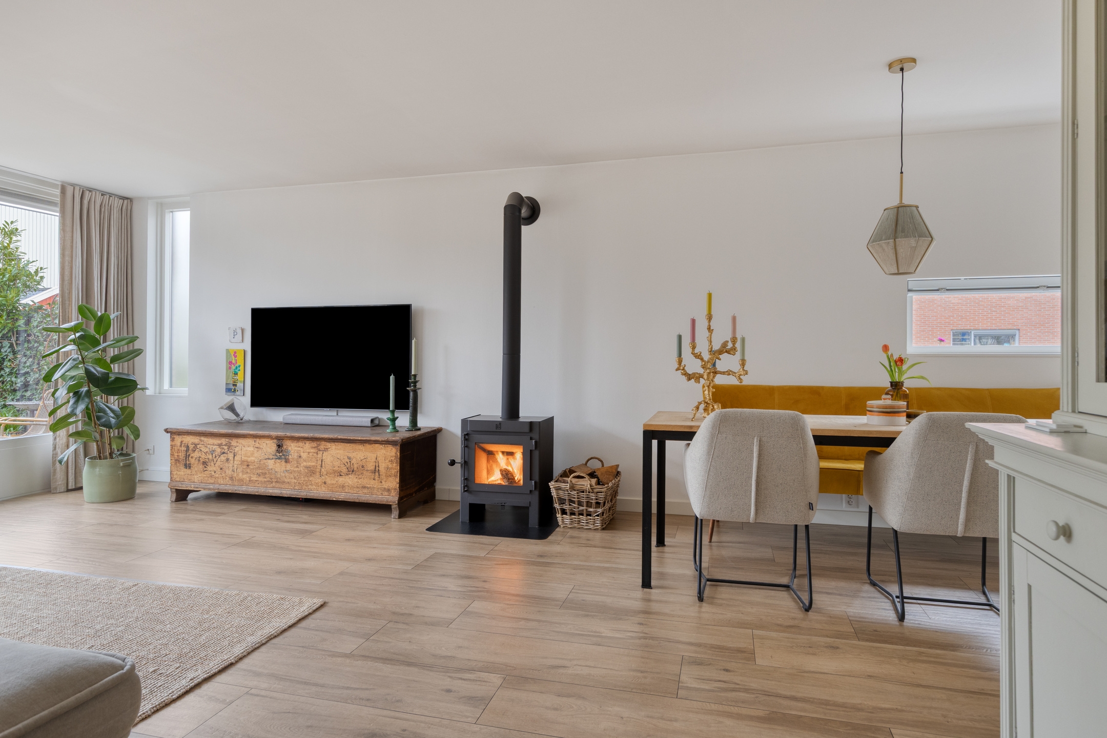 - Ruime woonkamer met sfeervolle houtkachel