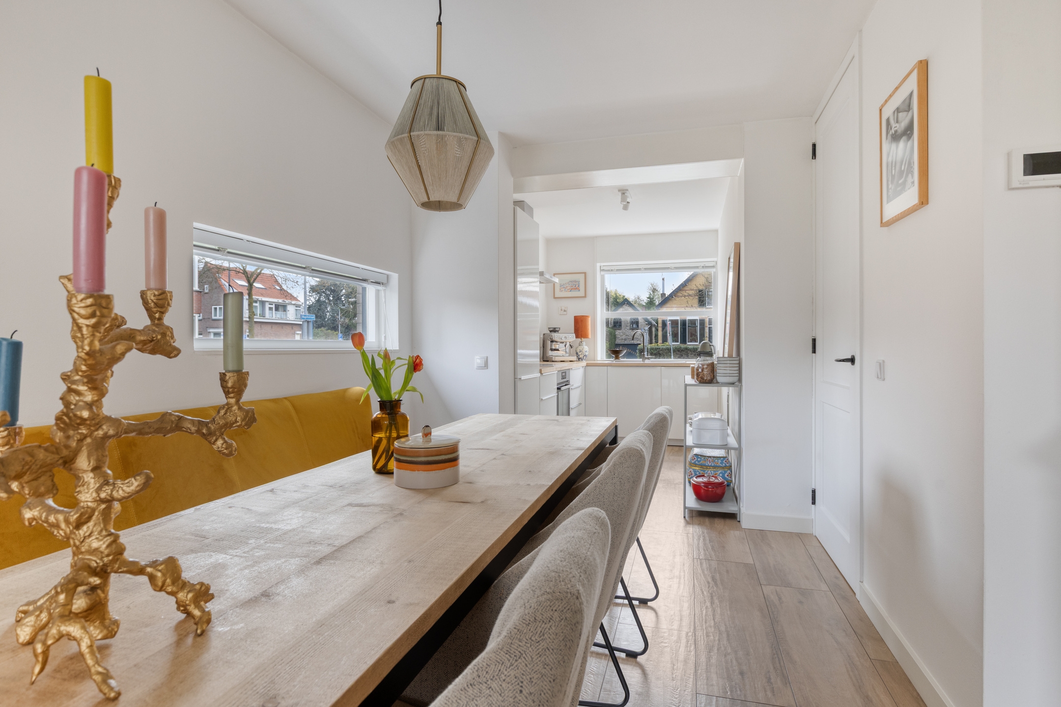 De begane grond is voorzien van een fraaie houtlook tegelvloer met vloerverwarming.