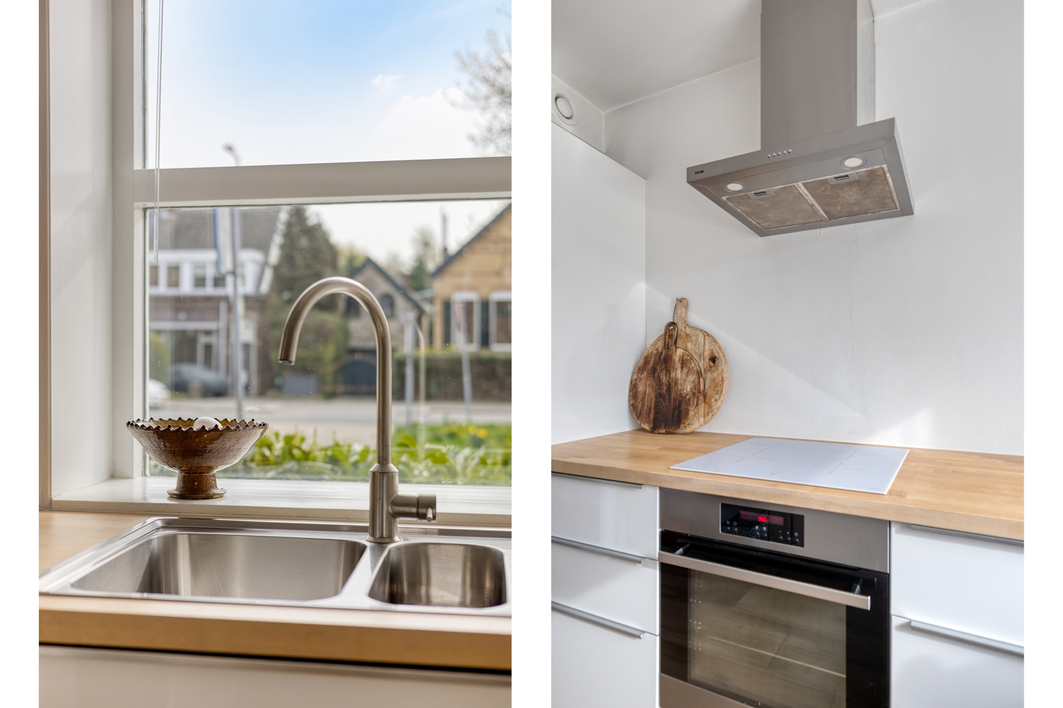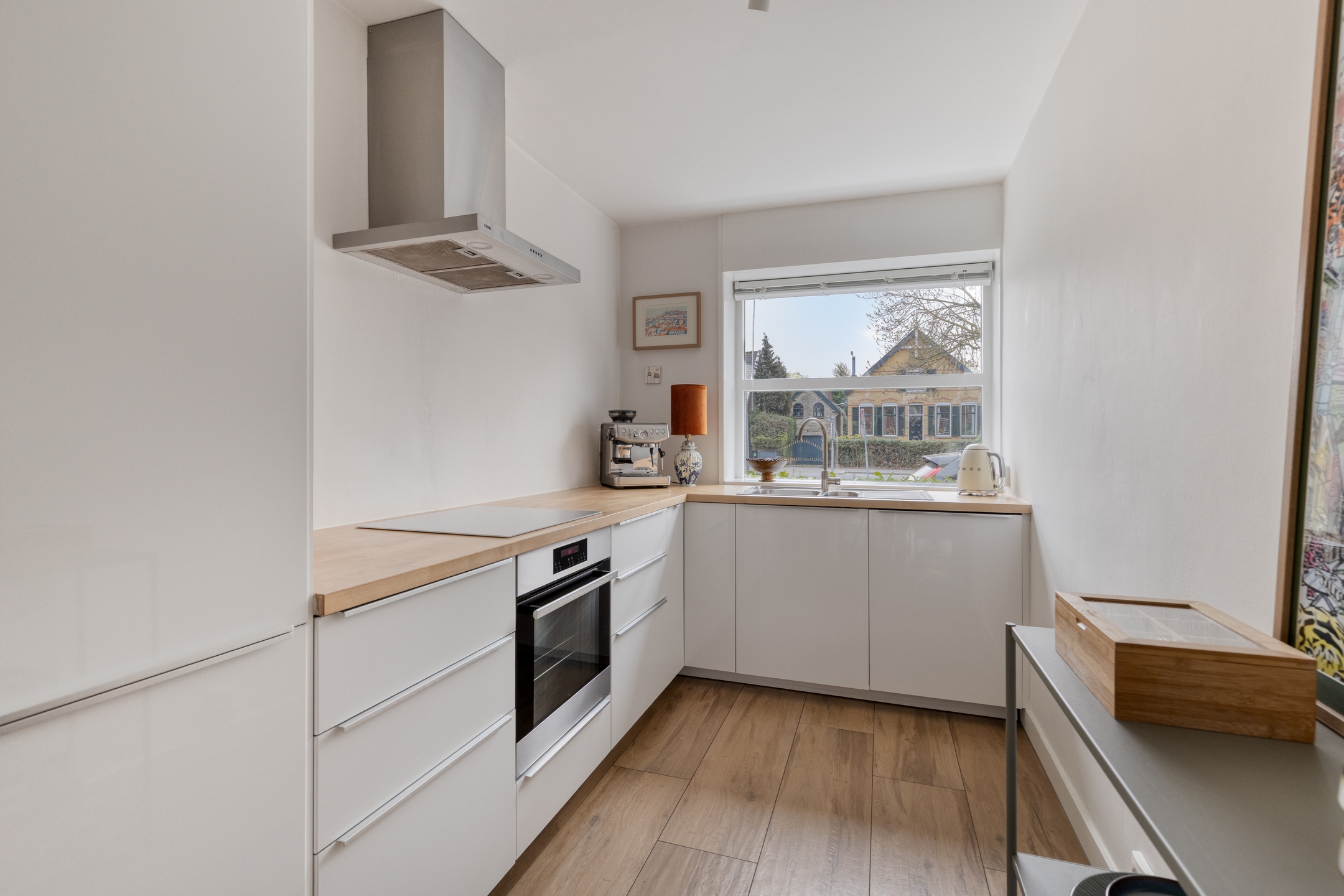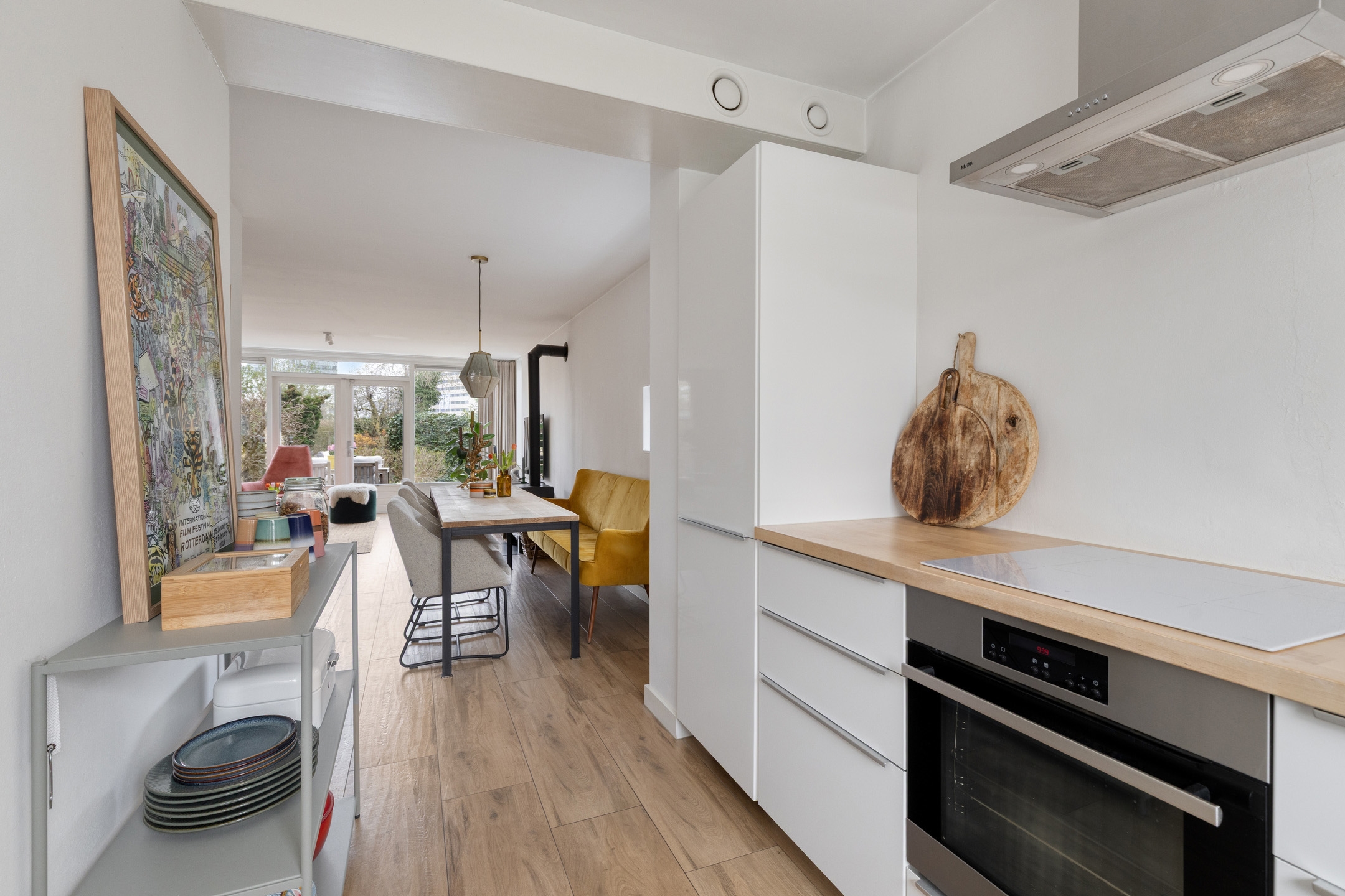 Keuken, gelegen aan de voorzijde en voorzien van een keukenblok in L-vormige opstelling met een inductiekookplaat, afzuigkap, oven, vaatwasser en een koel/vriescombinatie.