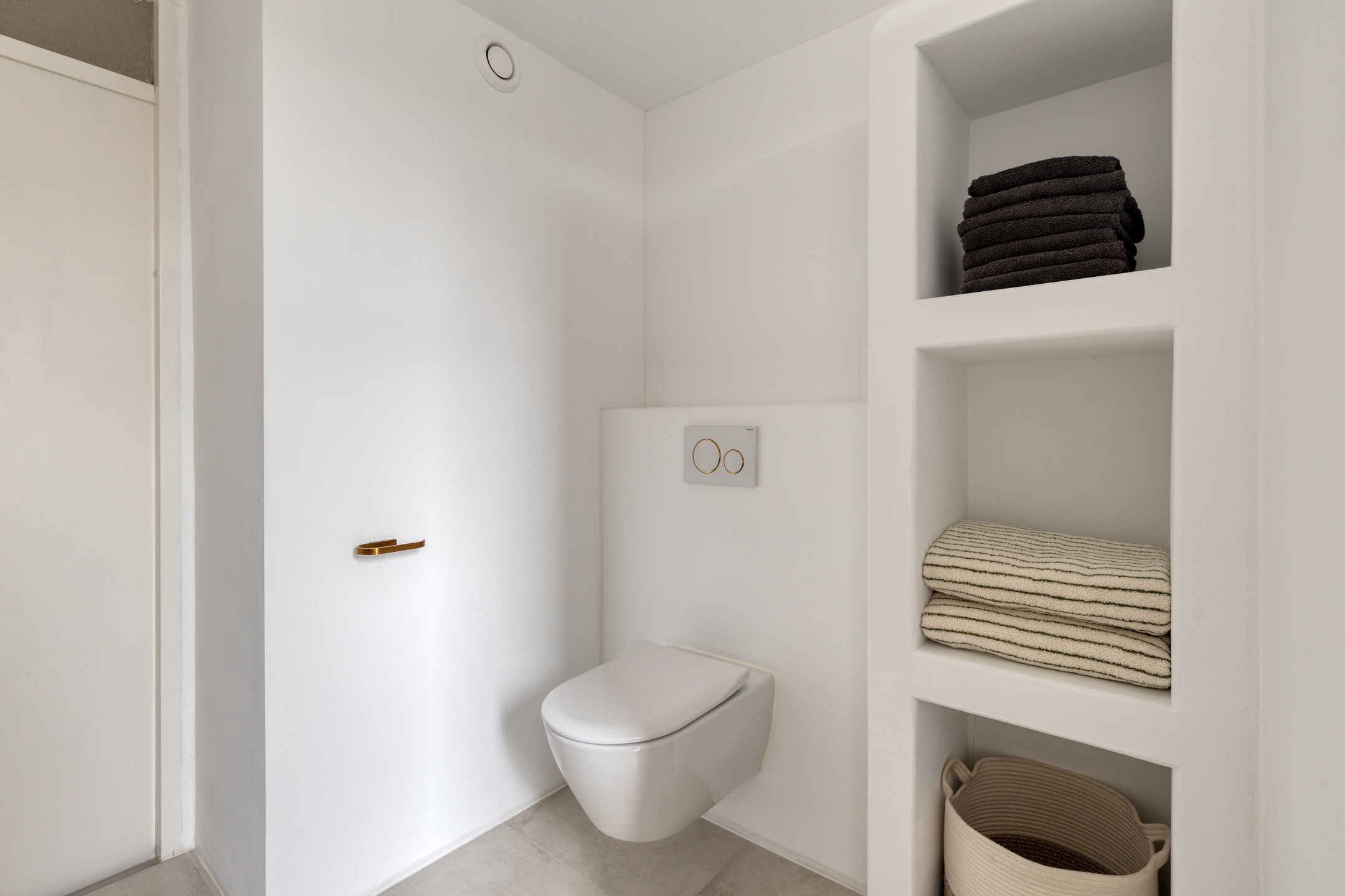Toilet, geheel betegeld, voorzien van een hangend closet, fonteintje en mechanische ventilatie.
