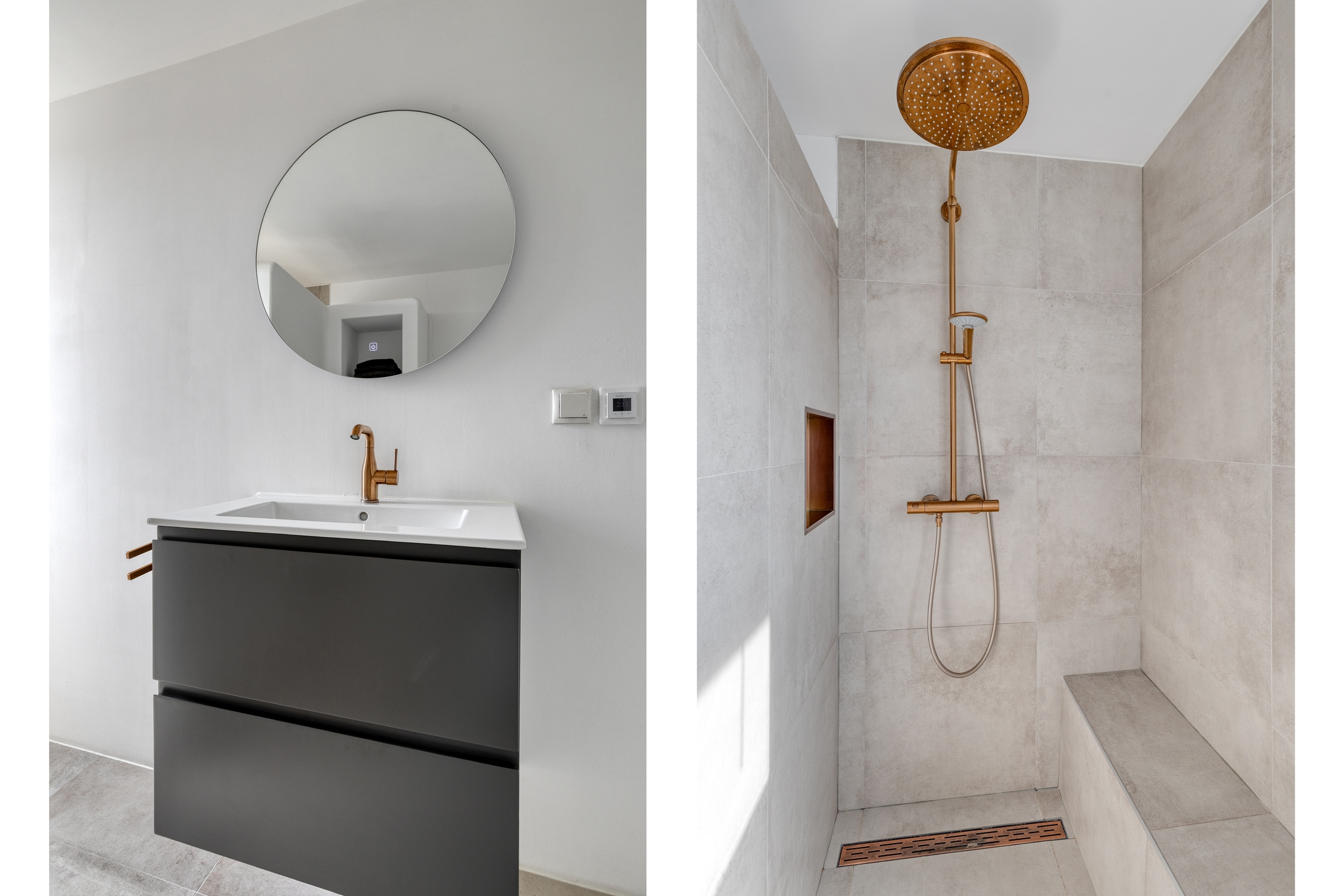 Badkamer, gelegen aan de voorzijde en voorzien van een ruime inloopdouche met thermostaatkraan, rainshower en handdouche, wastafel met onderladen en spiegel met verlichting en verwarming, een tweede toilet (hangend closet), mechanische ventilatie en een te openen raam. De vloer is afgewerkt met tegels en elektrische vloerverwarming.