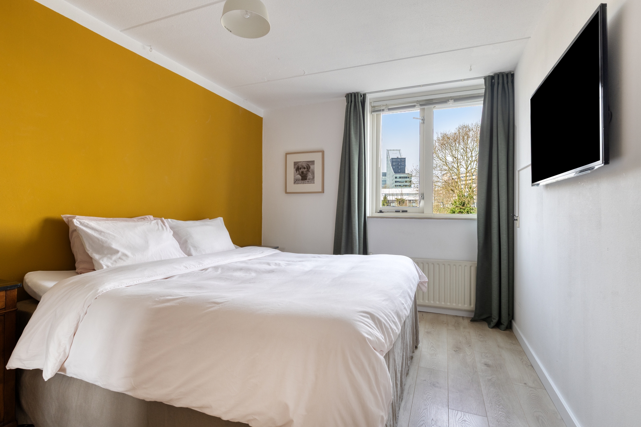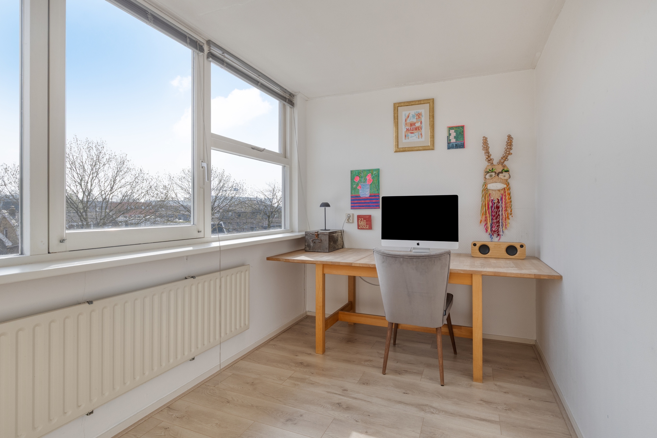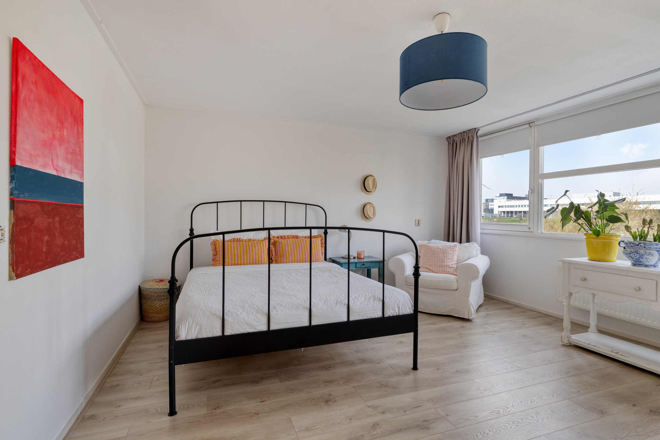 Slaapkamer 1, een ruime kamer aan de achterzijde, met fraai uitzicht op het groen van de volkstuinvereniging.