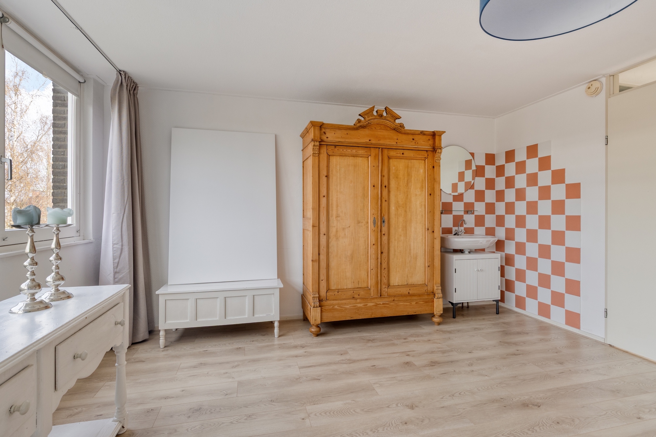 Slaapkamer 4, een royale kamer aan de achterzijde, voorzien van een wastafel met spiegel.
