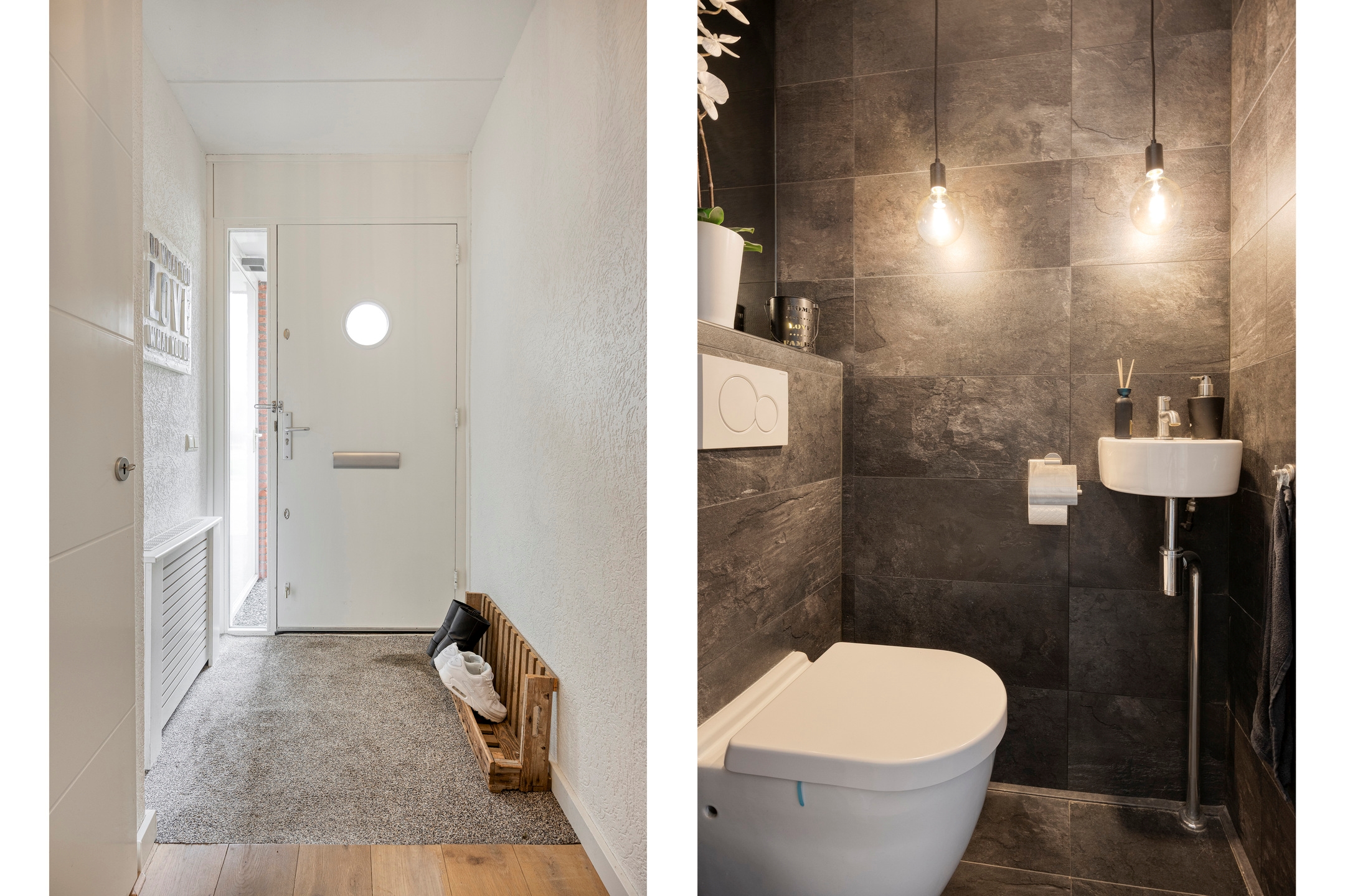 Entree/hal, met garderobe onder de trap en toegang tot de woonkamer, toilet, meterkast en trapopgang naar de eerste verdieping.