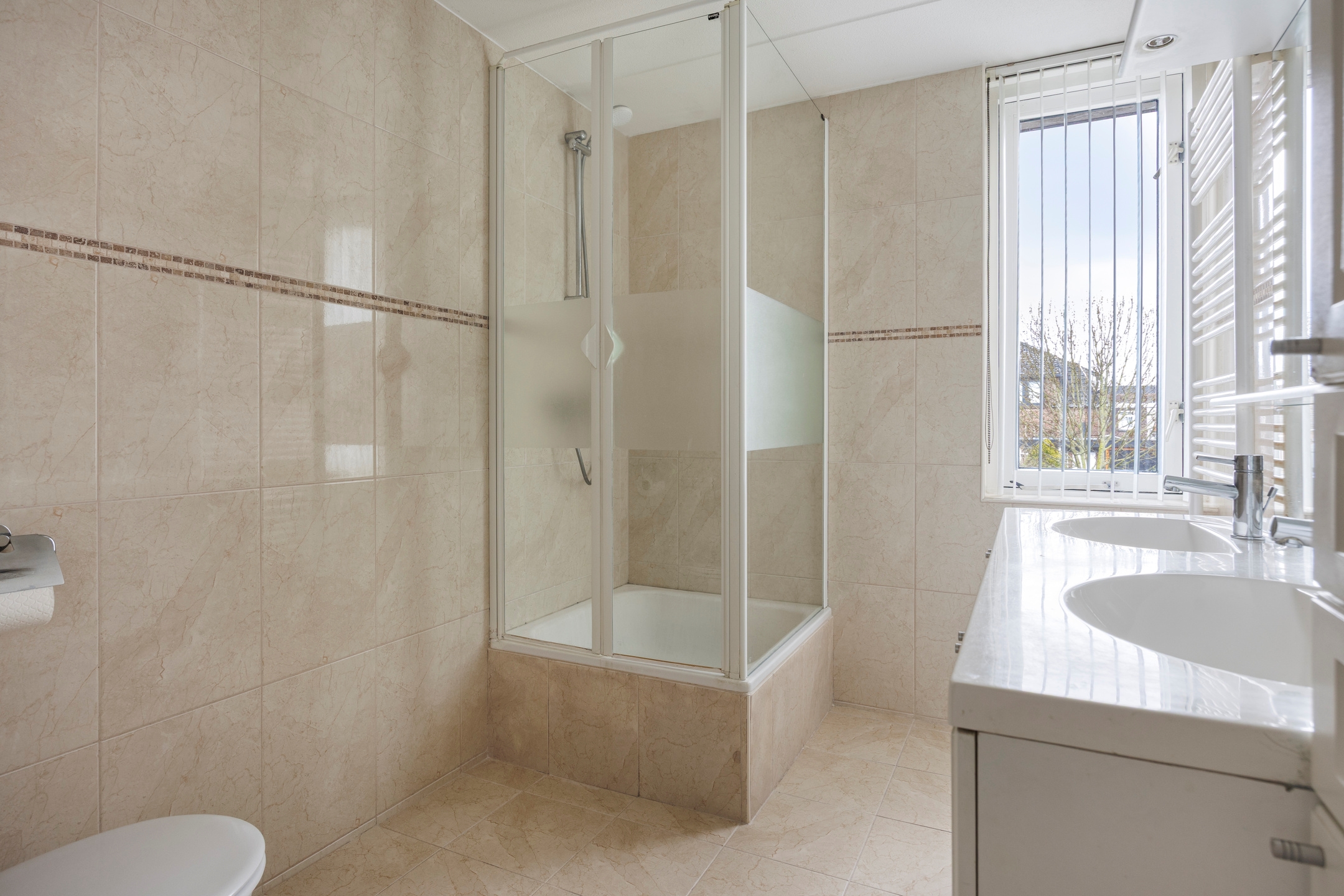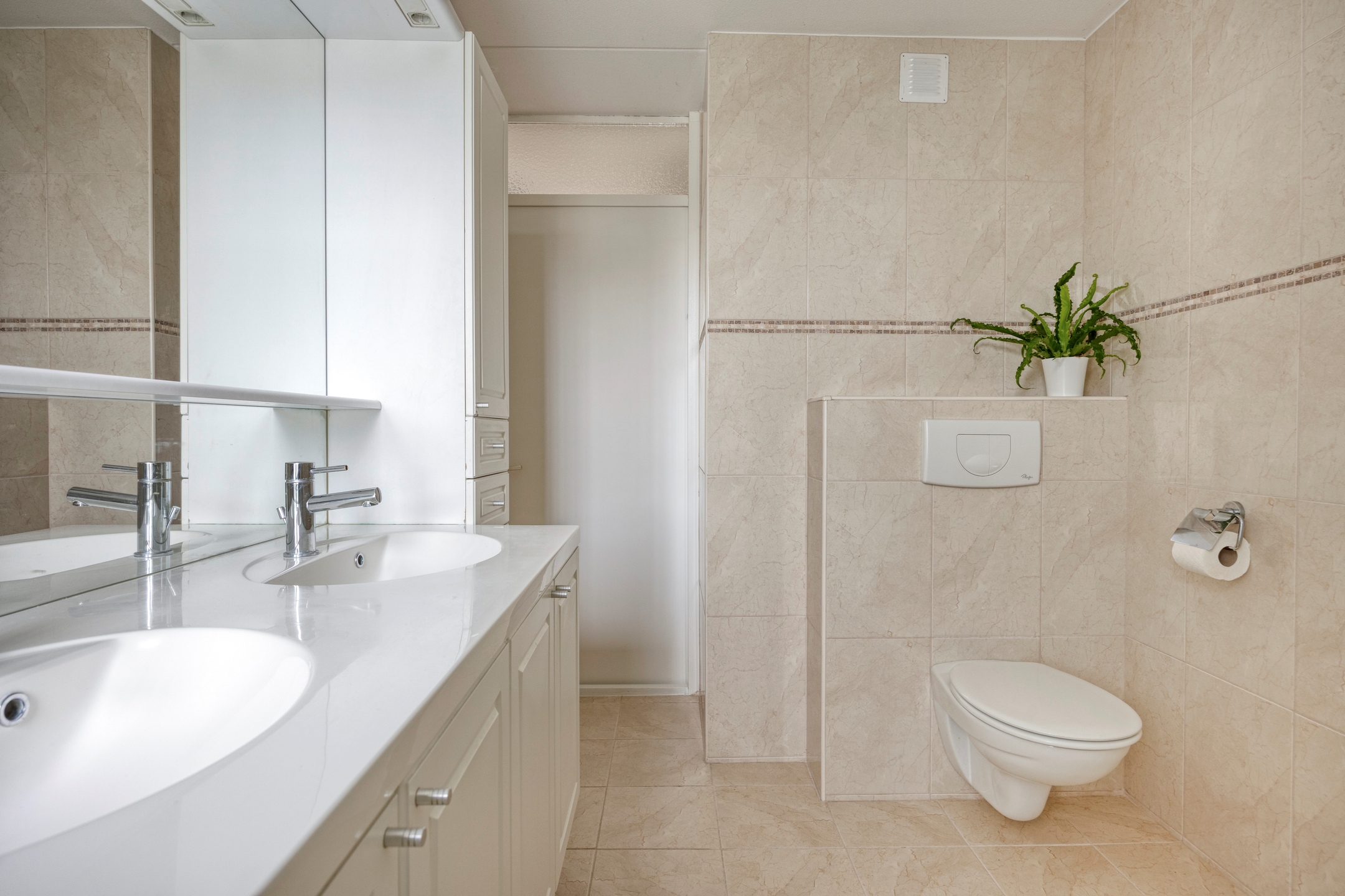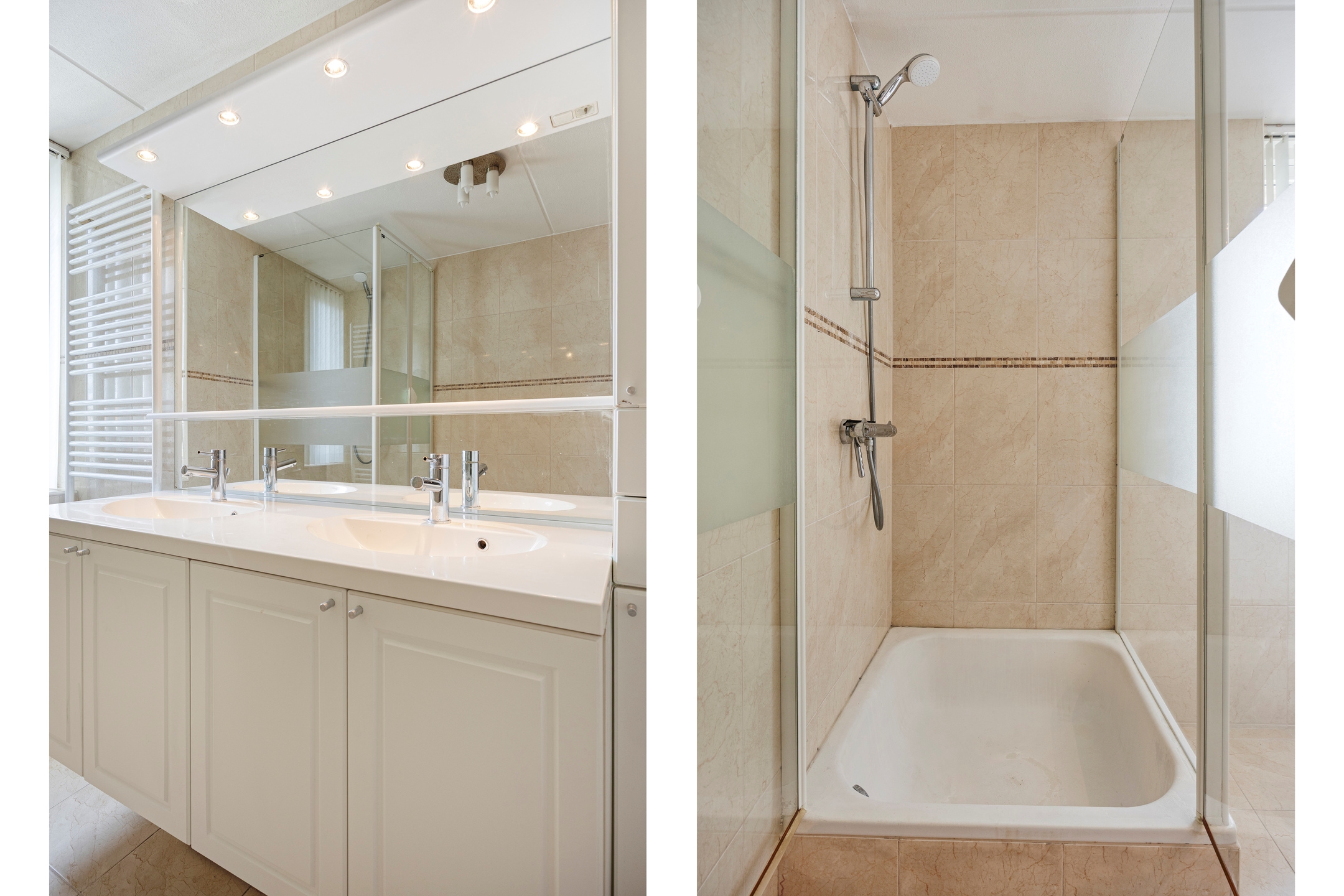 Badkamer, een ruime en geheel betegelde badkamer, voorzien van een douchecabine met thermostaatkraan, dubbele wastafel met onderkasten, kolomkasten en grote spiegel met verlichting, een tweede hangend toilet, badkamerradiator, mechanische ventilatie en een te openen raam.