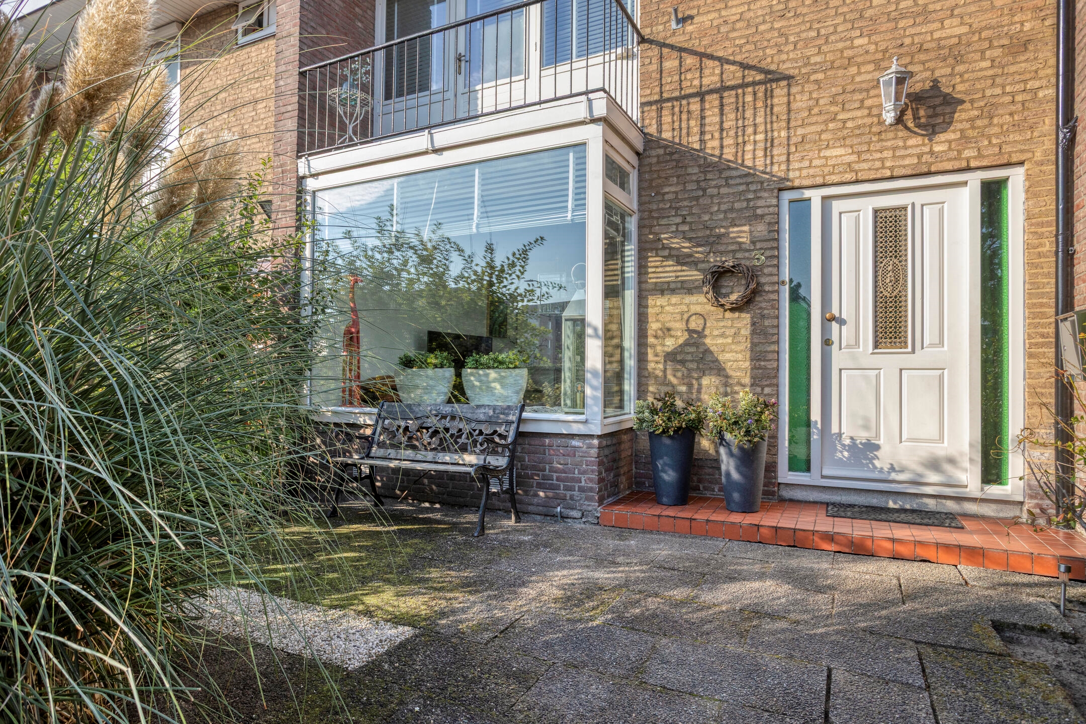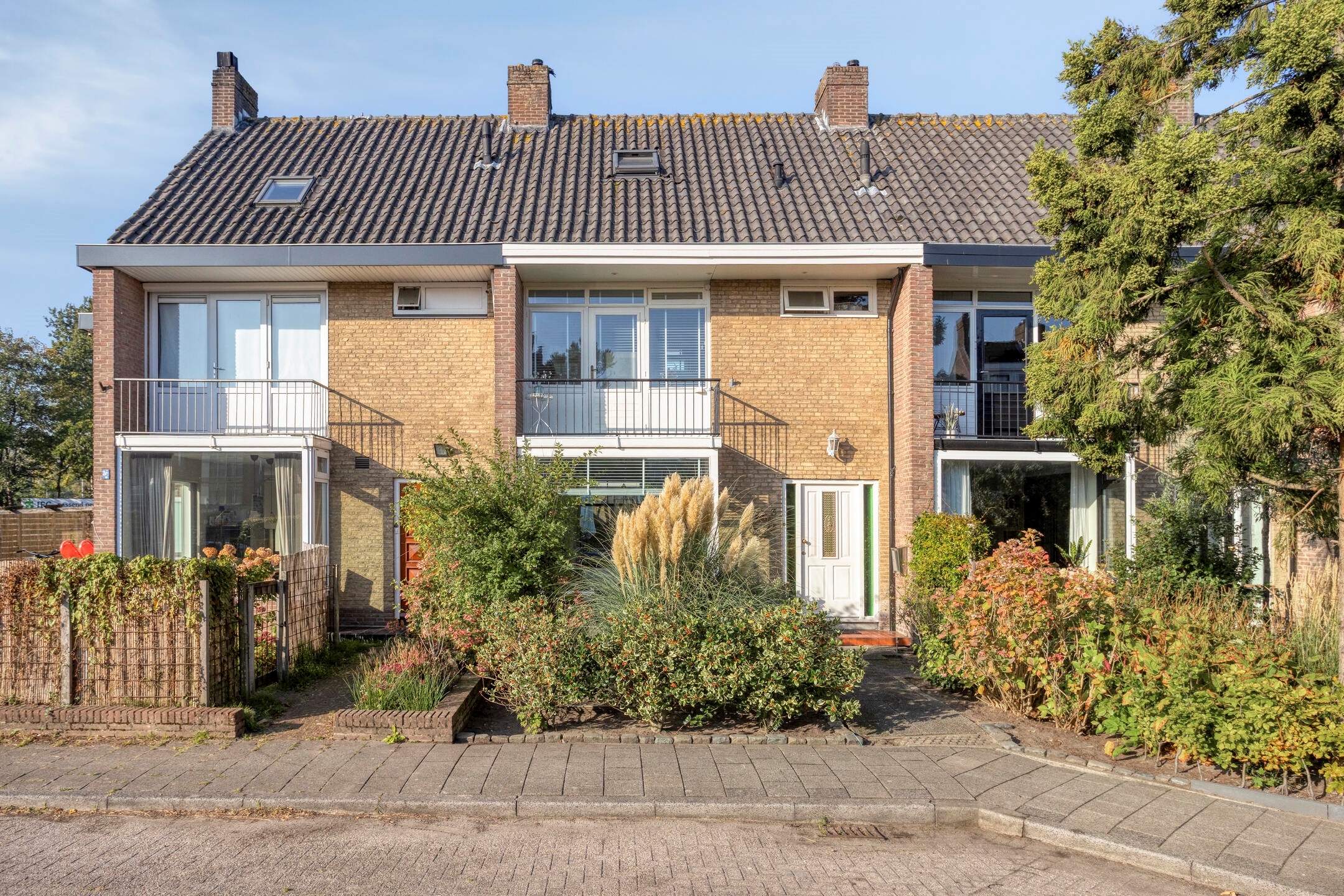Voortuin, voorzien van sierbestrating en groen.