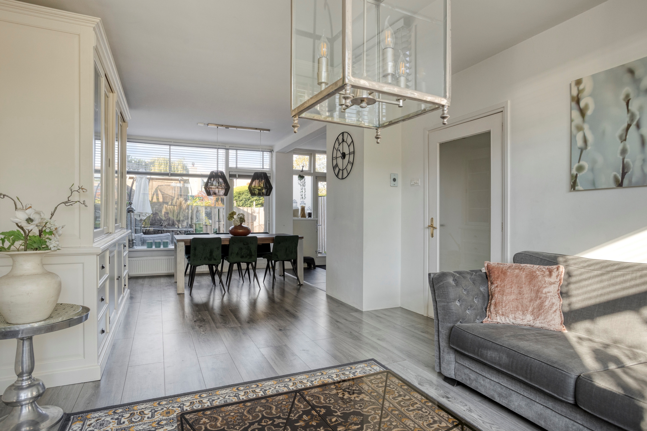 De doorzon woonkamer met erker aan de voorzijde is ruim en licht. Vanuit de woonkamer is er toegang tot de keuken.