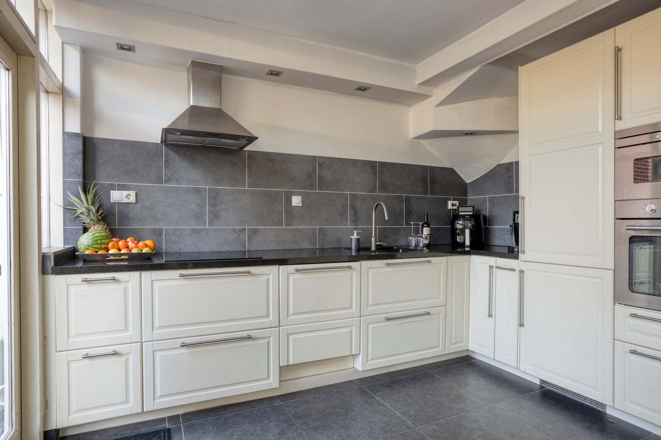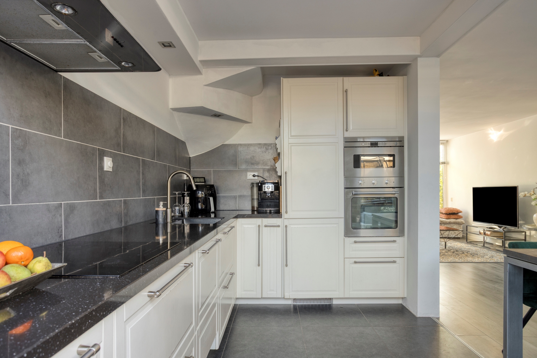 Keuken, gelegen aan de achterzijde, voorzien van een tegelvloer en een keukenblok in L-vormige opstelling met een fraai graniet werkblad. Verder is de open keuken uitgerust met een inductiekookplaat met rvs-afzuigkap, koel-vriescombinatie, vaatwasser, oven en een magnetron.