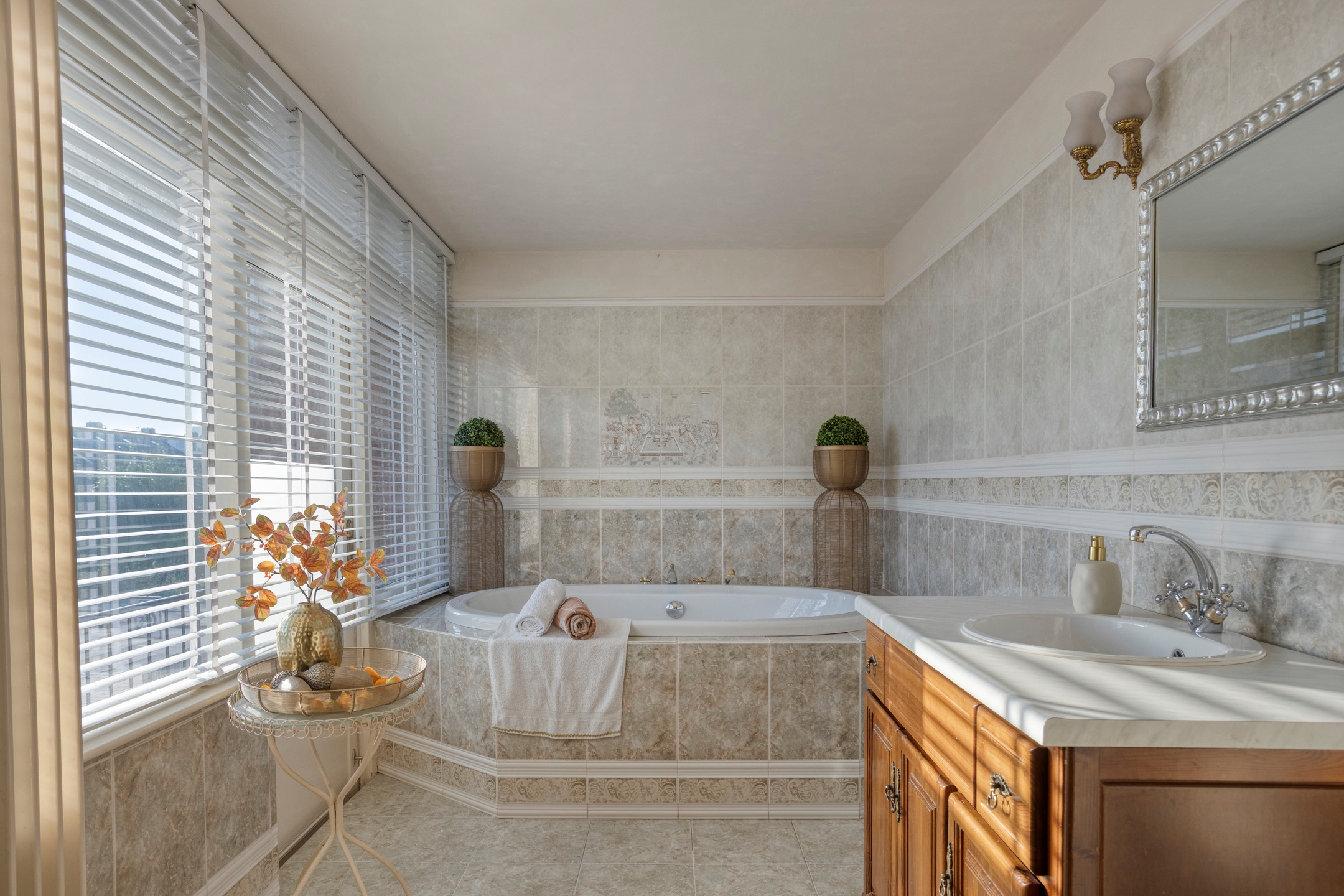 Uitgebouwde luxe badkamer, gelegen aan de voorzijde met toegang tot het balkon. De badkamer is grotendeels betegeld met vloerverwarming en voorzien van een grote jacuzzi en douchecabine met massagedouche en stoomcabine.