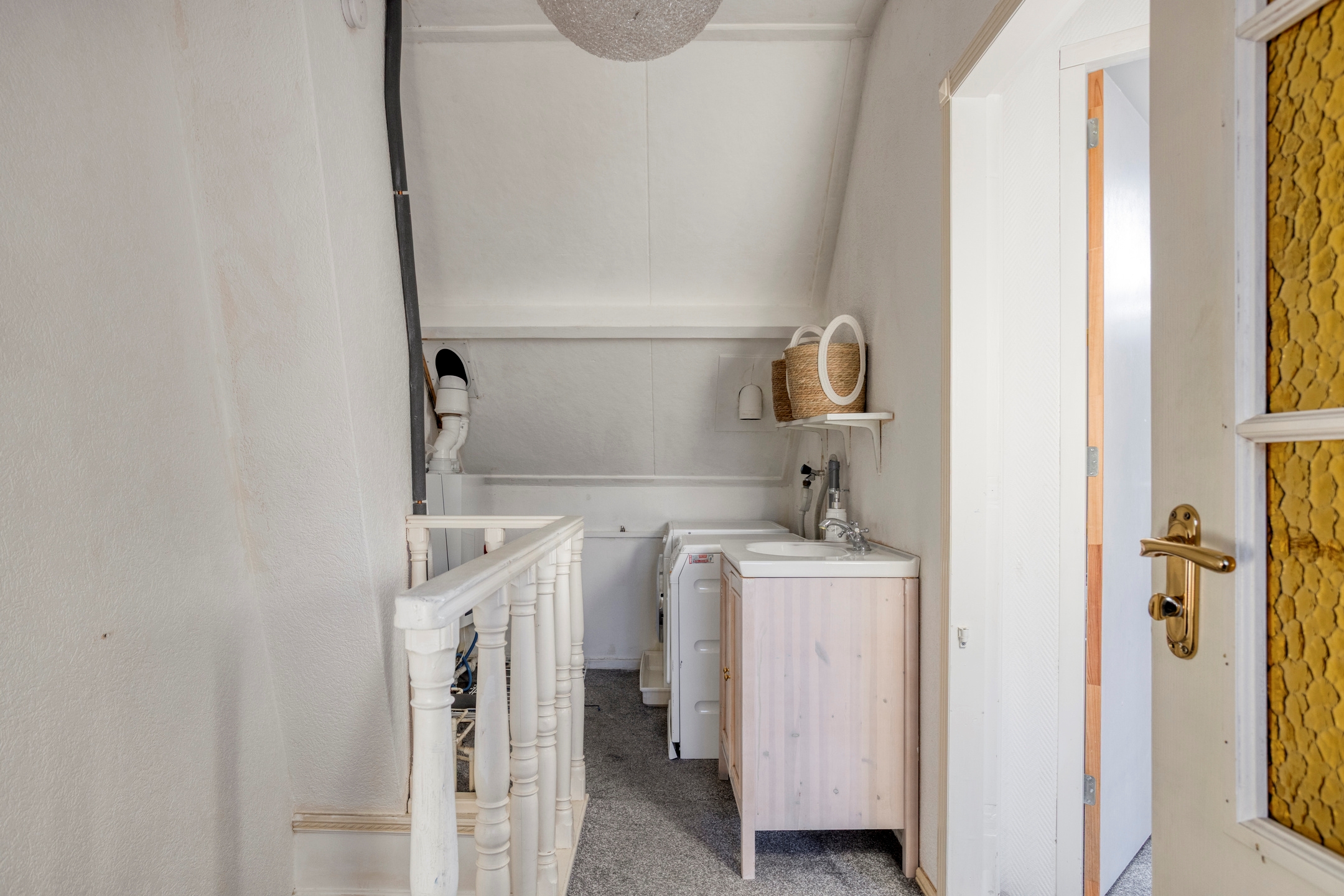 Overloop, met wastafel, wasmachine- en droger aansluiting en cv-ketel, biedt toegang tot twee slaapkamers, een (thuis)werkkamer en bergruimte achter het knieschot.