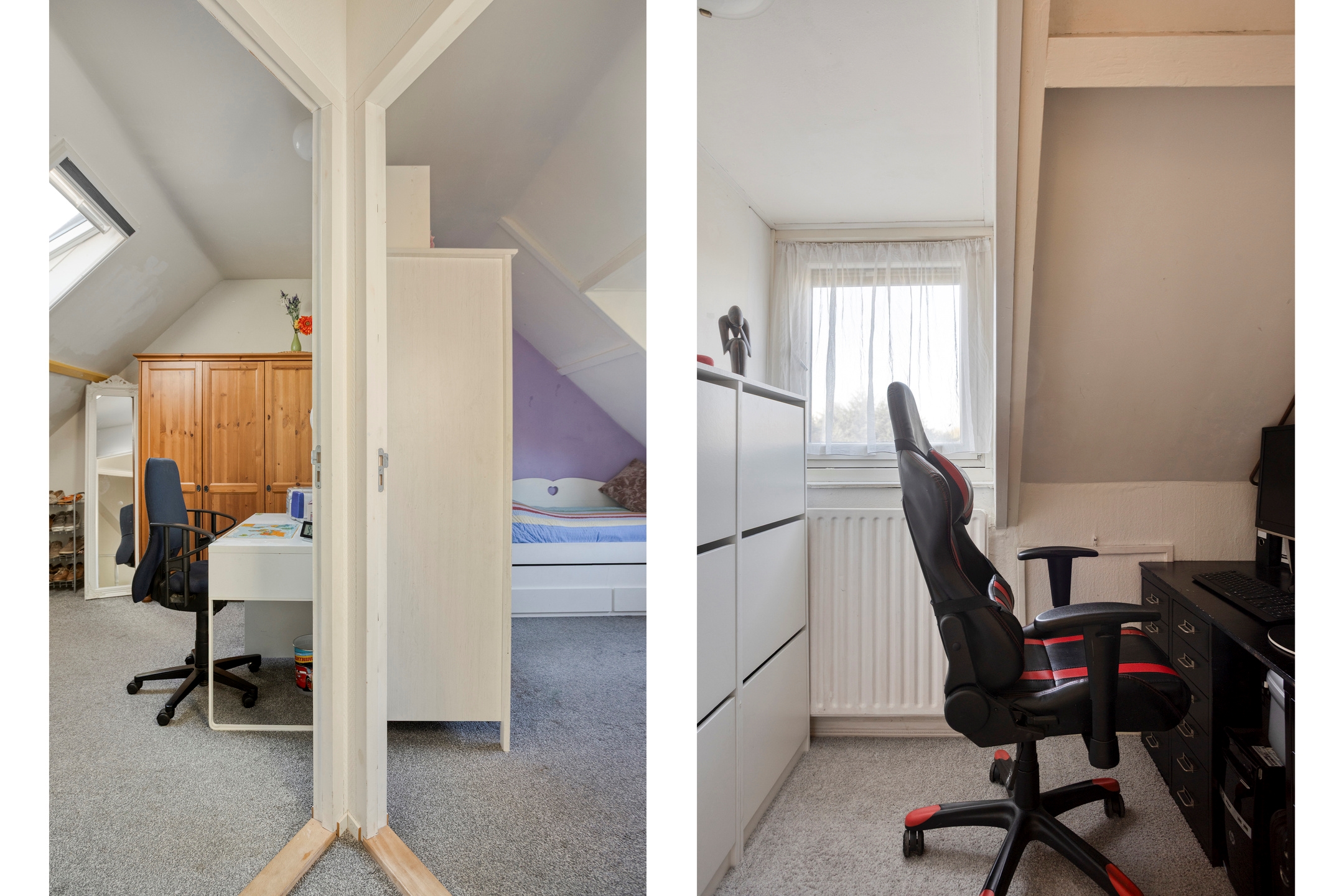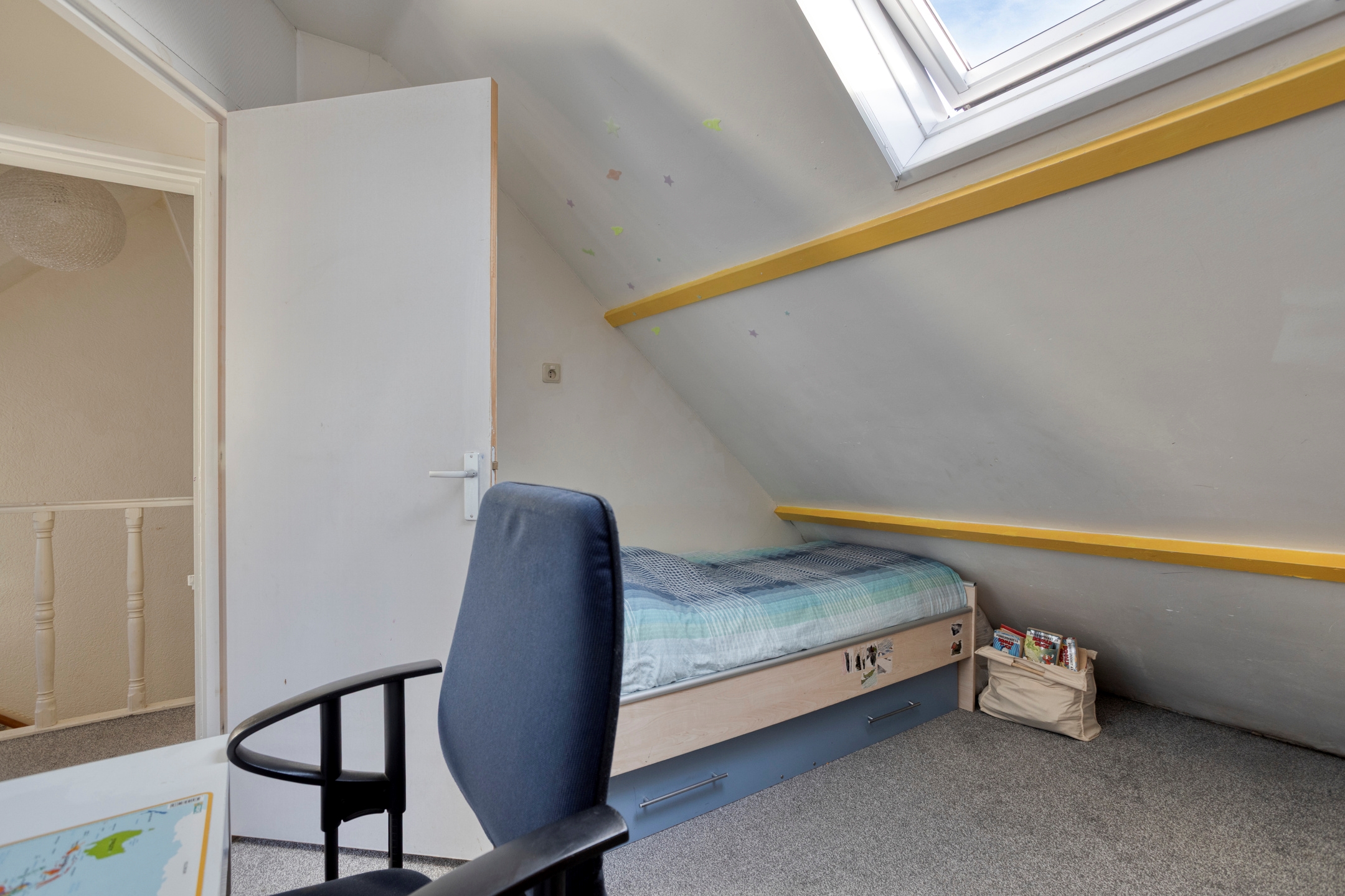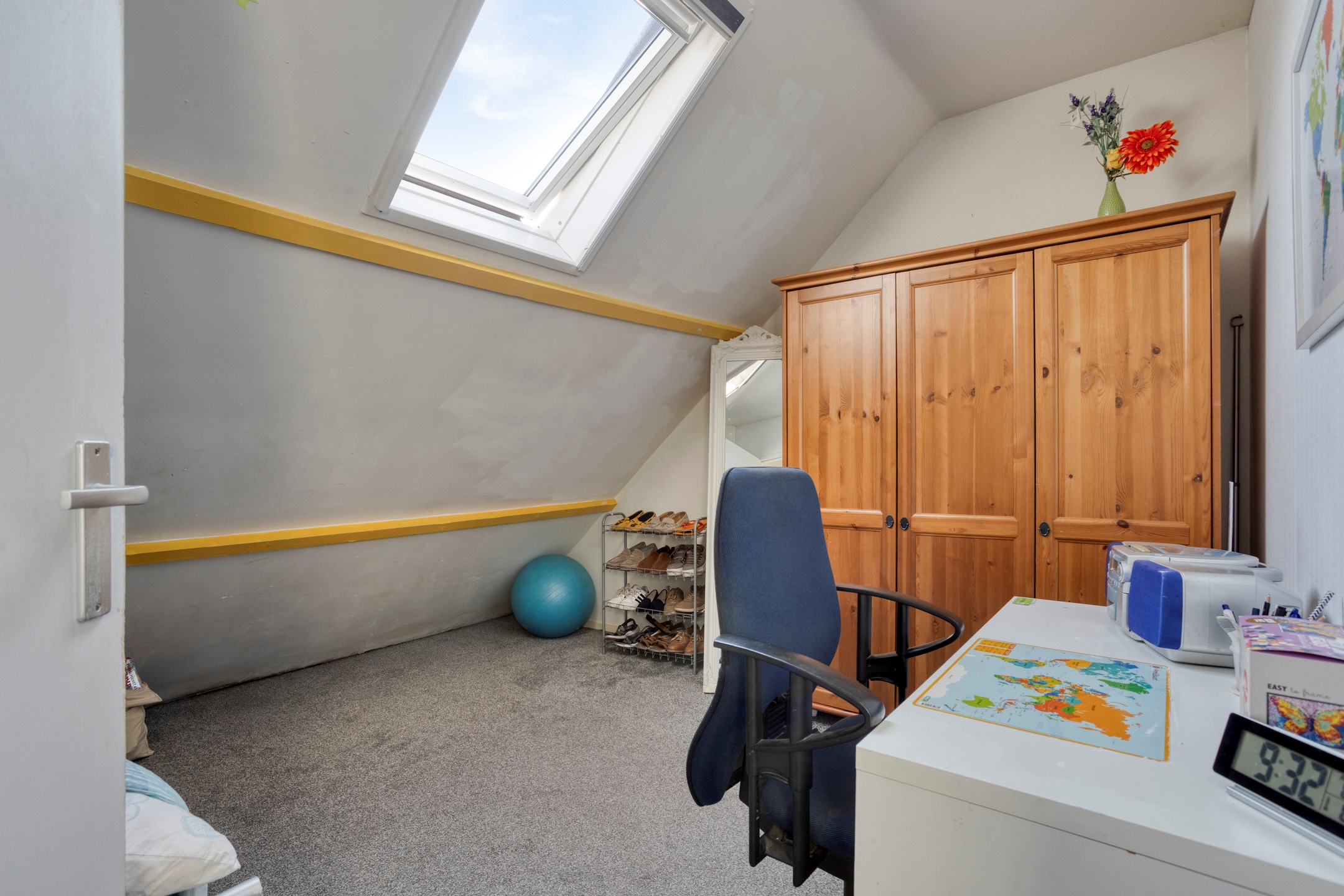 Slaapkamer 4, gelegen aan de voorzijde, voorzien van een Velux dakraam met ook hier bergruimte achter het knieschot.