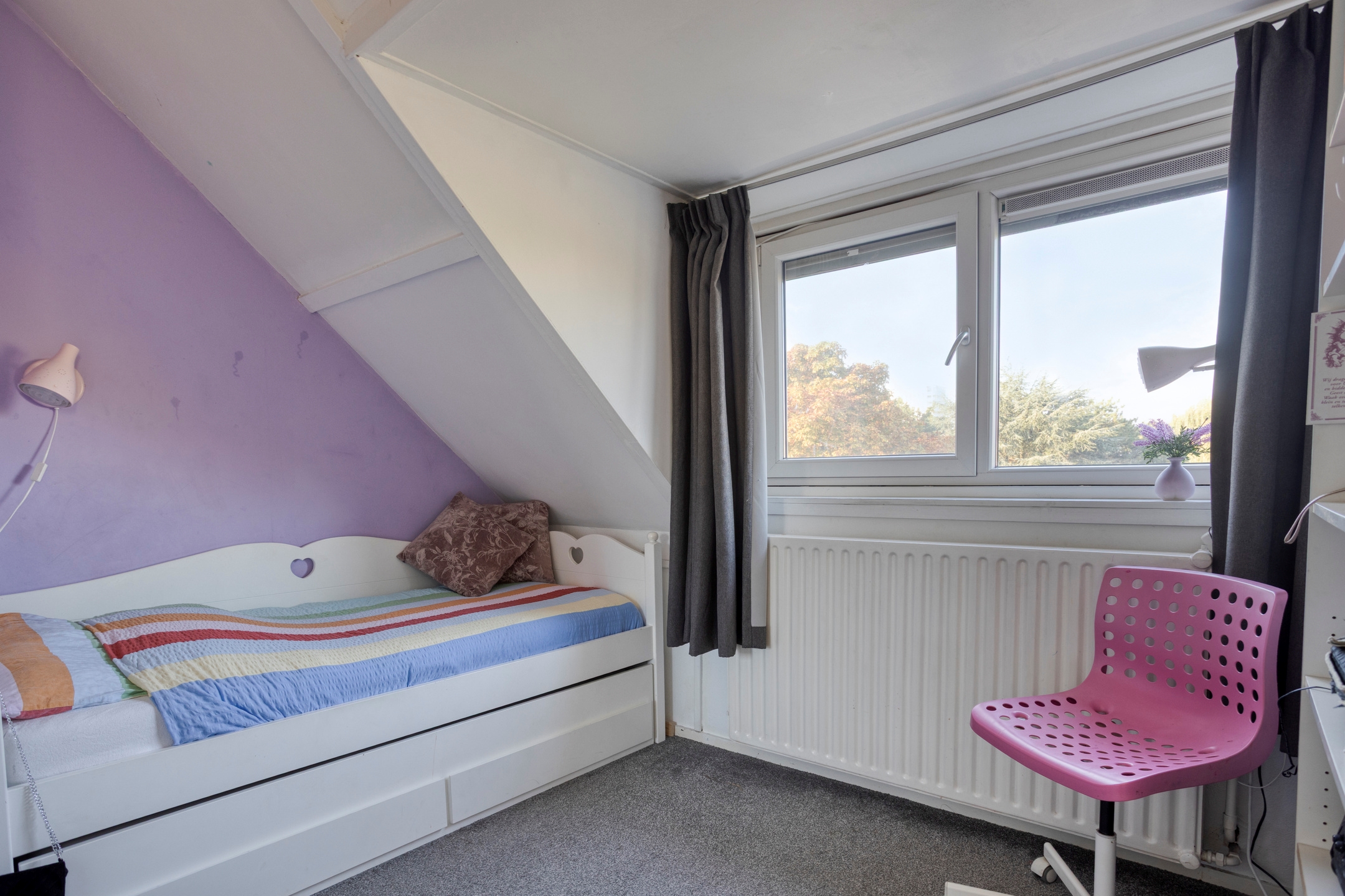 Slaapkamer 3, gelegen aan de achterzijde, voorzien van een kunststof dakkapel met elektrische rolluiken en bergruimte achter het knieschot.