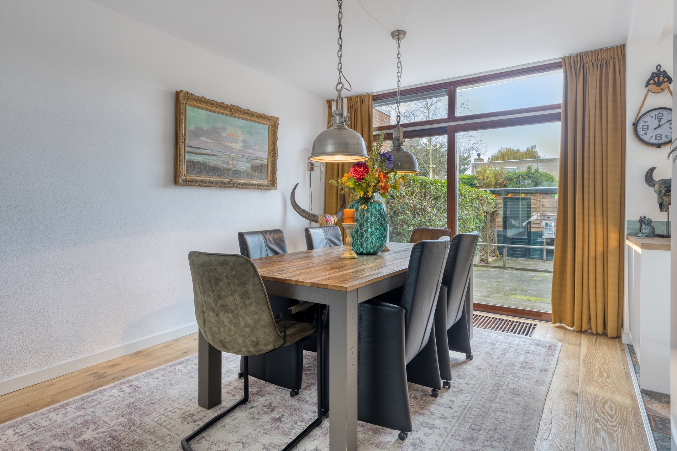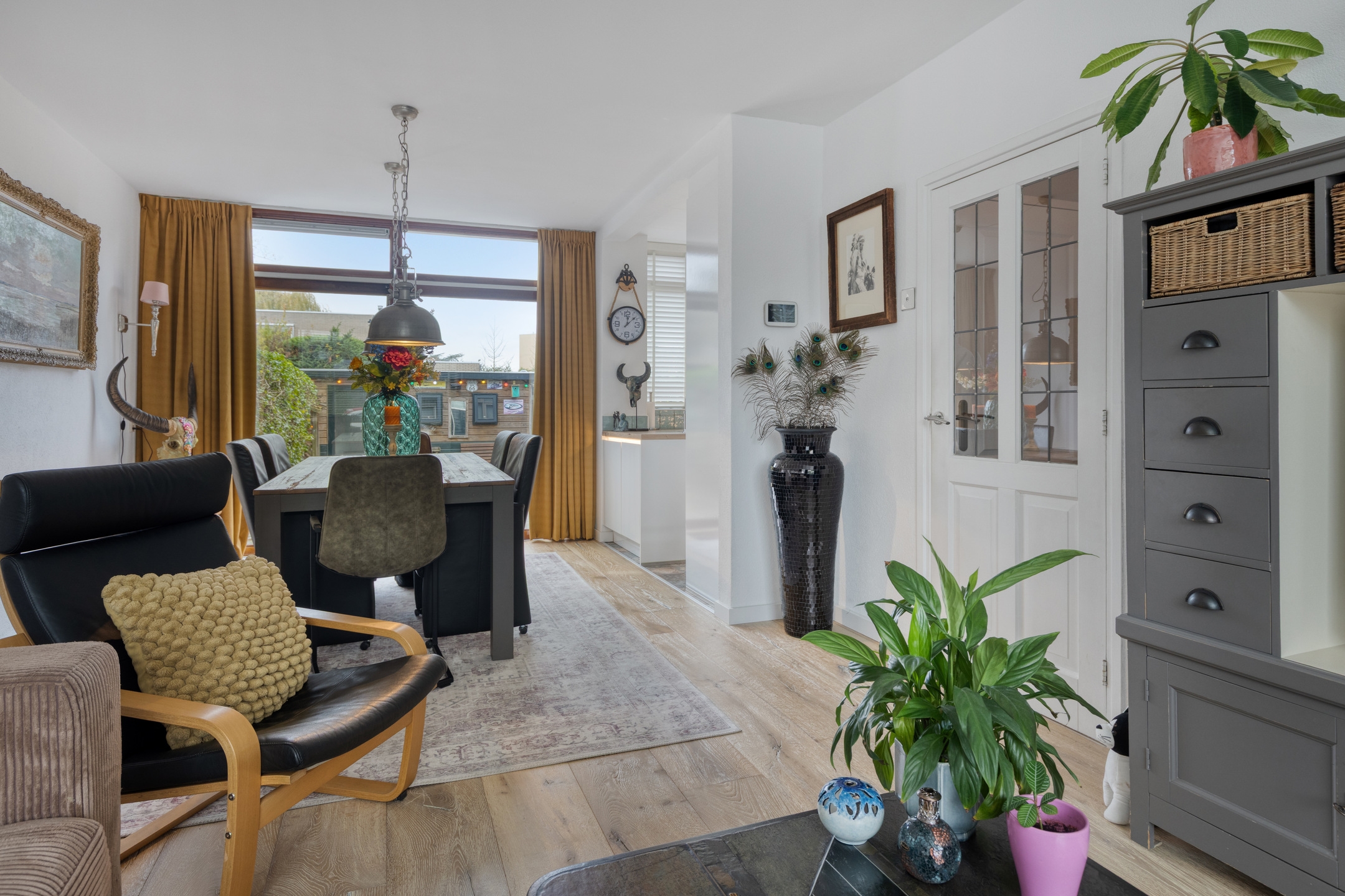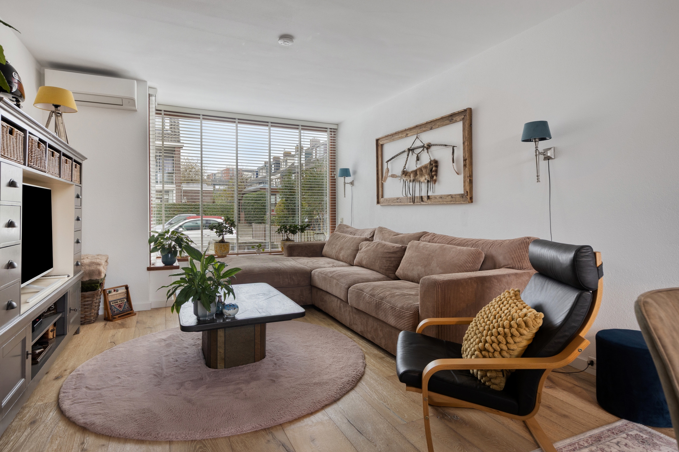 Woonkamer, een heerlijke opvallend lichte (doorzon) woonkamer met een erker aan de voorzijde, voorzien van airconditioning en afgewerkt met fraaie eiken vloerdelen. Aan de achterzijde biedt een hardhouten schuifpui toegang tot de achtertuin. Daarnaast is er toegang tot de keuken, eveneens gelegen aan de achterzijde.