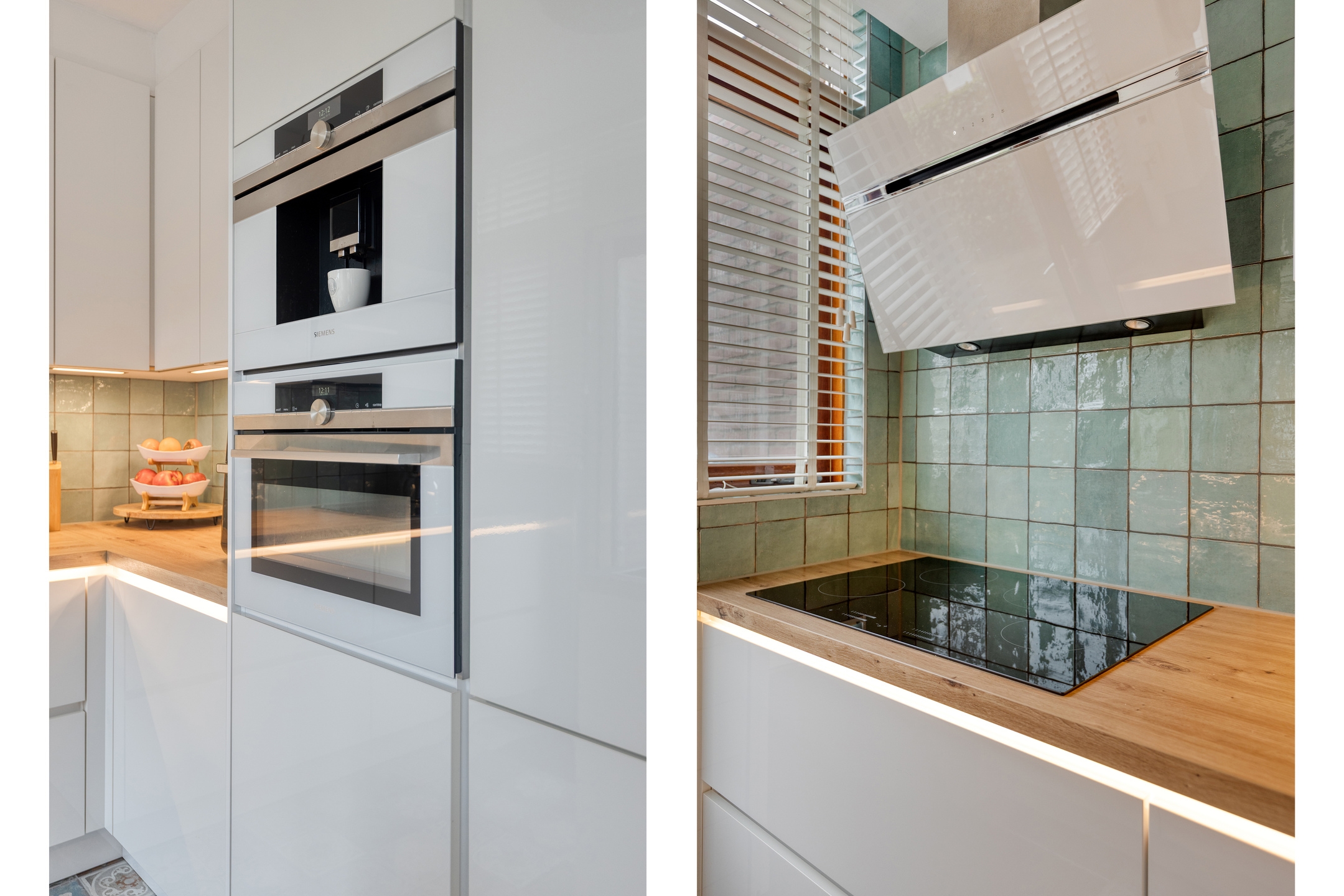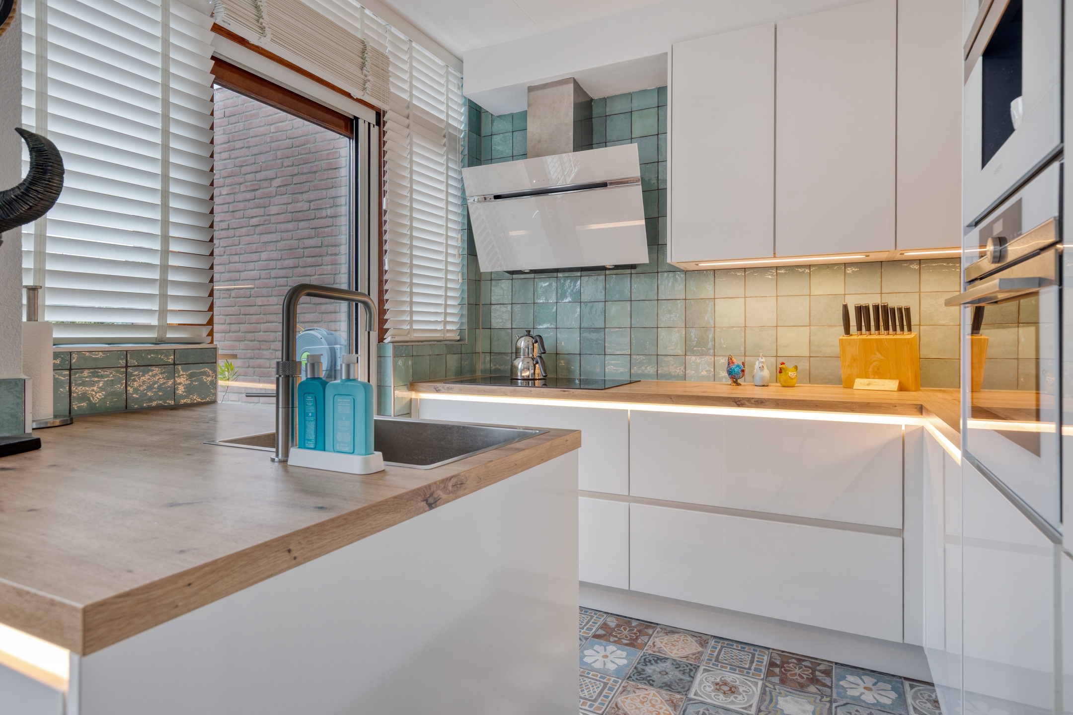 Het L-vormig keukenblok bevat een inductiekookplaat met design afzuigkap, combioven, grote koel-/vriescombinatie, koffiemachine, brede laden, veel kasten en een carrouselkast. Het spoel-/kasteneiland bevat een gootsteen, vaatwasser en Quooker. De vloer is ook hier voorzien van sfeervolle tegels (hetzelfde als in de gang) èn elektrische vloerverwarming.