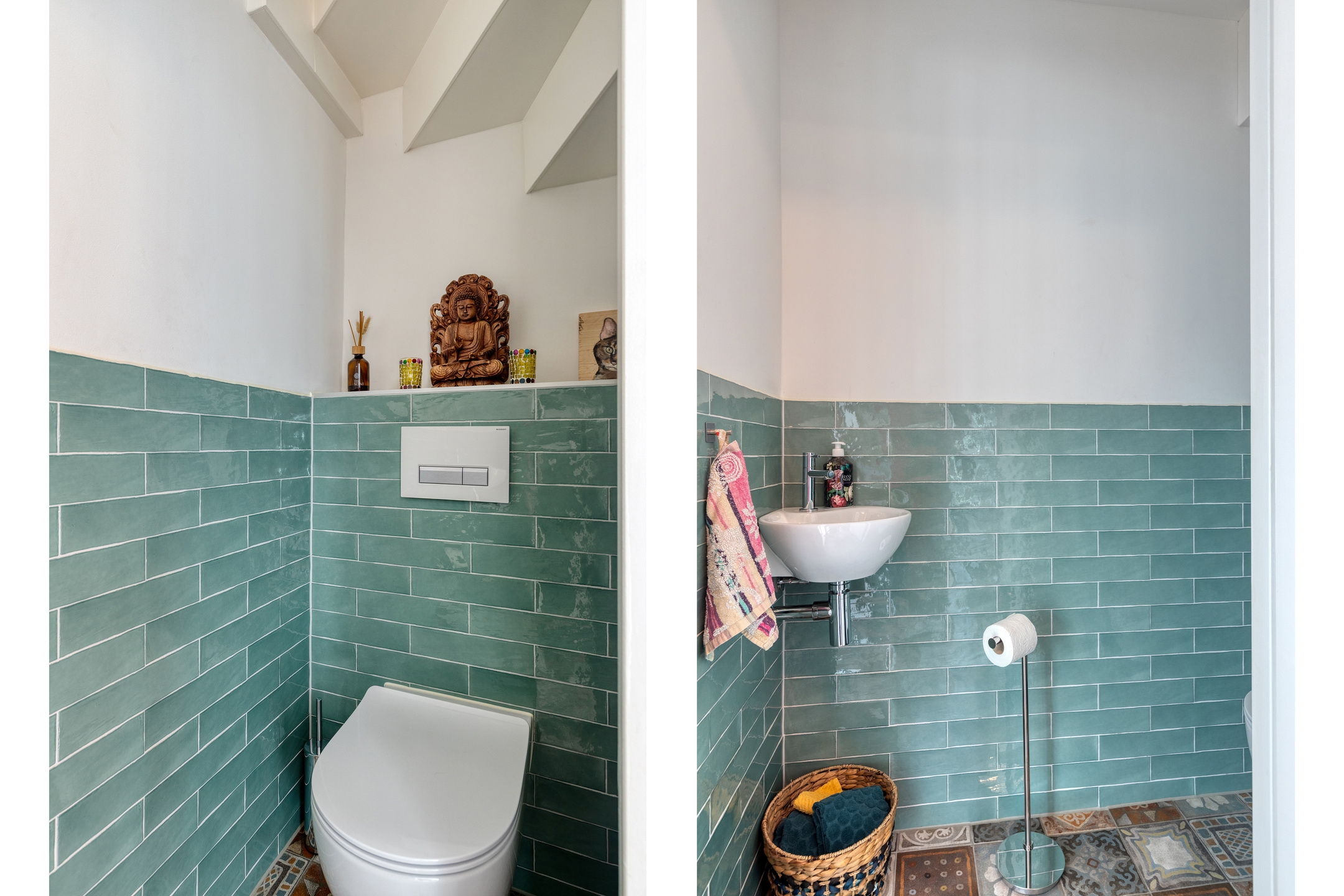 Toilet, een ruime en moderne en gedeeltelijk betegelde ruimte, voorzien van een hangend closet met Geberit duofresh geurzuivering en een hoekfonteintje.