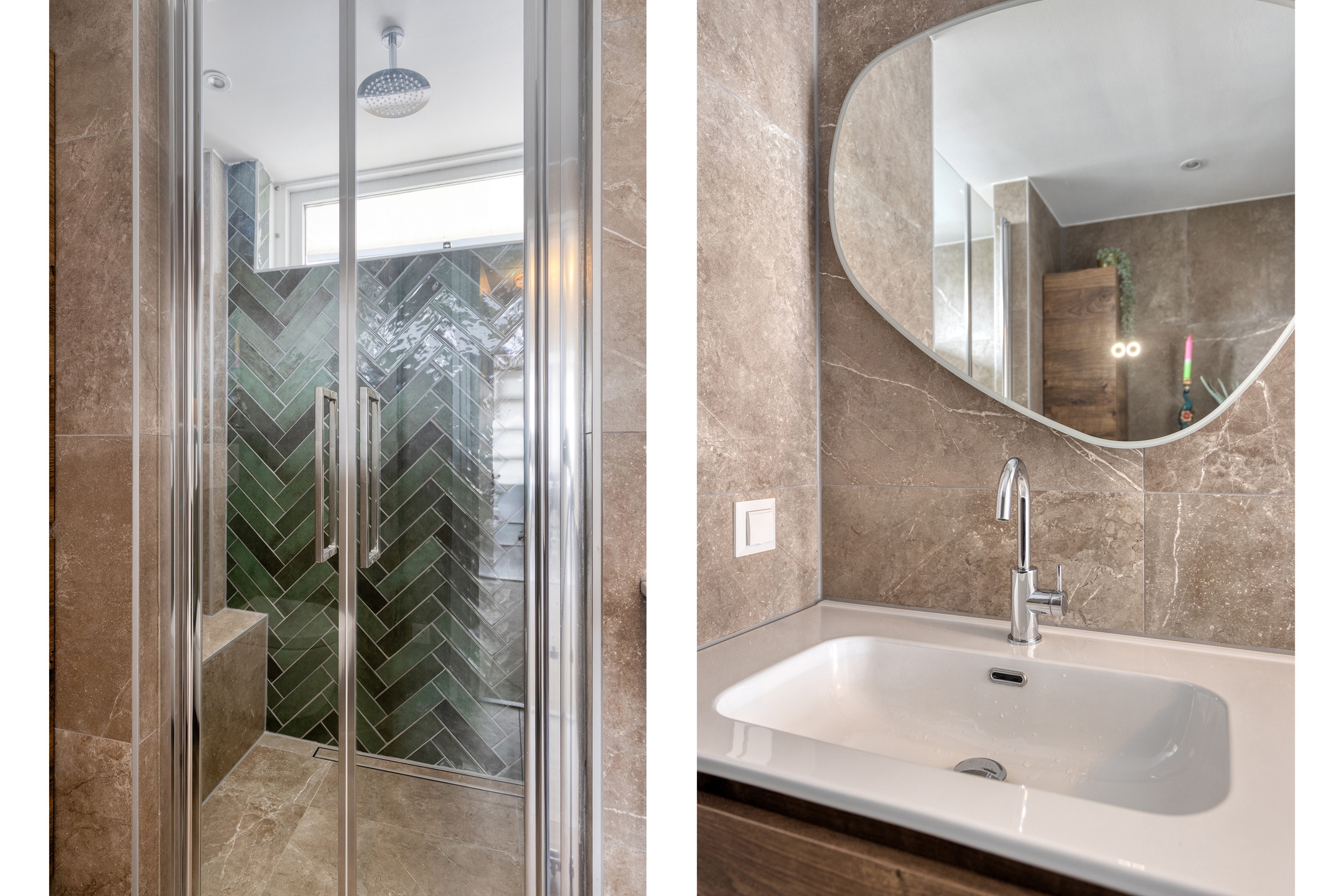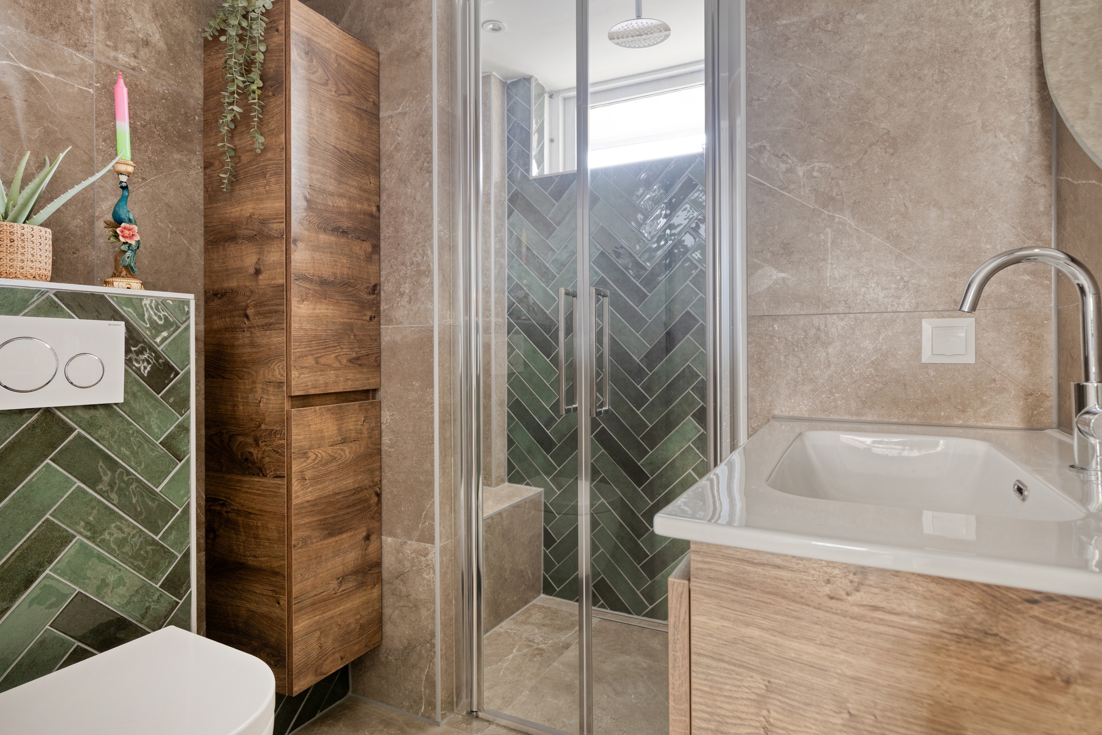Badkamer (2024) , een moderne en geheel betegelde ruimte, voorzien van een ruime inloopdouche met inbouwkraan, rainshower en handdouche, wastafel met onderladen en spiegel met verlichting, een kolomkast, een tweede toilet (hangend closet) en elektrische vloerverwarming.