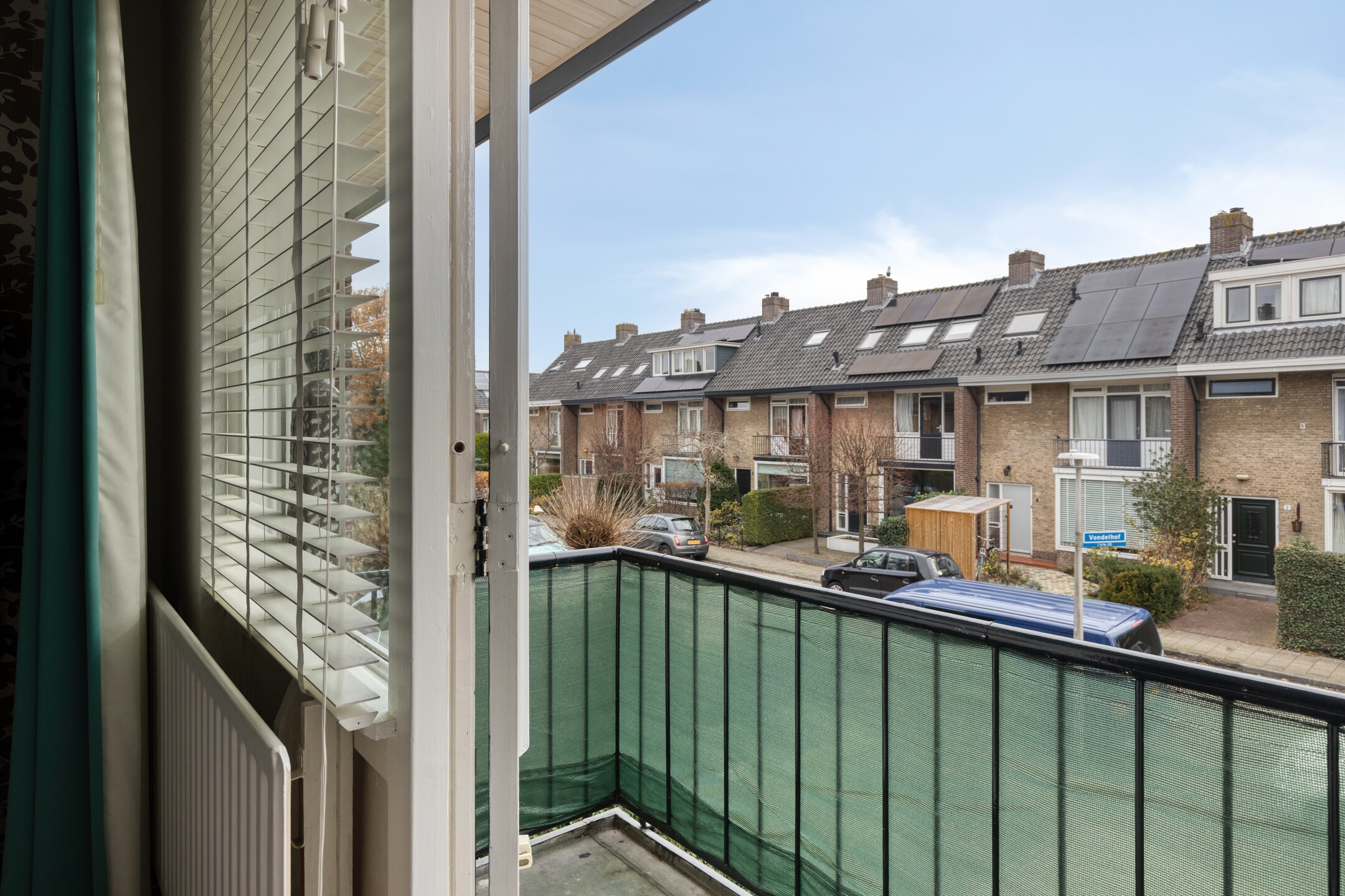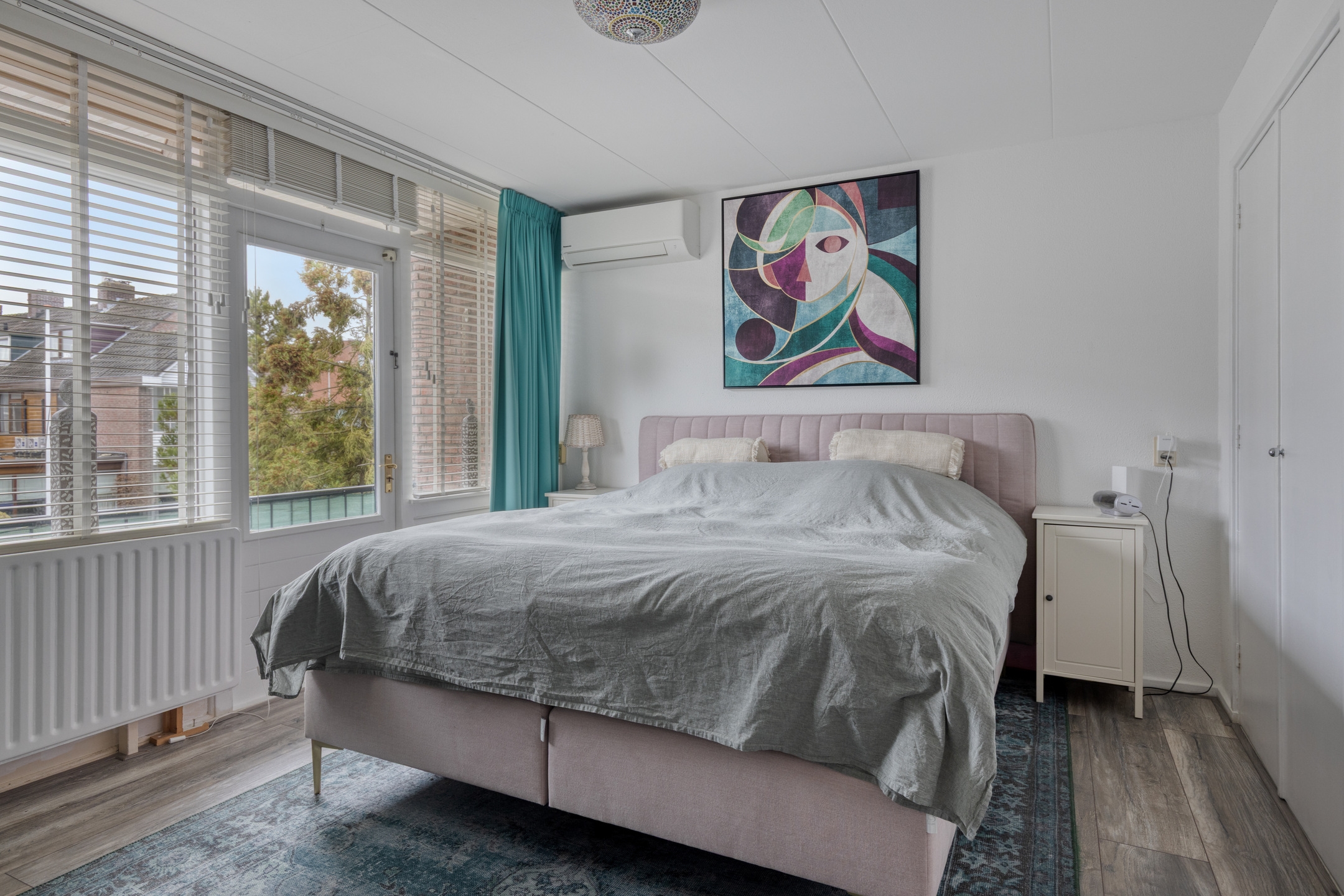 Slaapkamer 1, een ruime kamer gelegen aan de voorzijde, voorzien van een vaste kast, airconditioning, laminaat vloerafwerking en toegang tot het balkon.