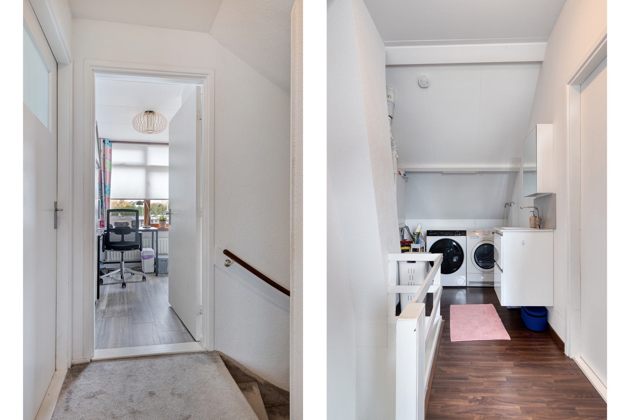 Overloop, biedt toegang tot slaapkamer 4, de opstelling cv-ketel, wasmachine- en drogeraansluiting, is voorzien van een wastafel met onderladen en spiegelkast en bevat bergruimte achter de knieschotten aan de voor- en achterzijde.