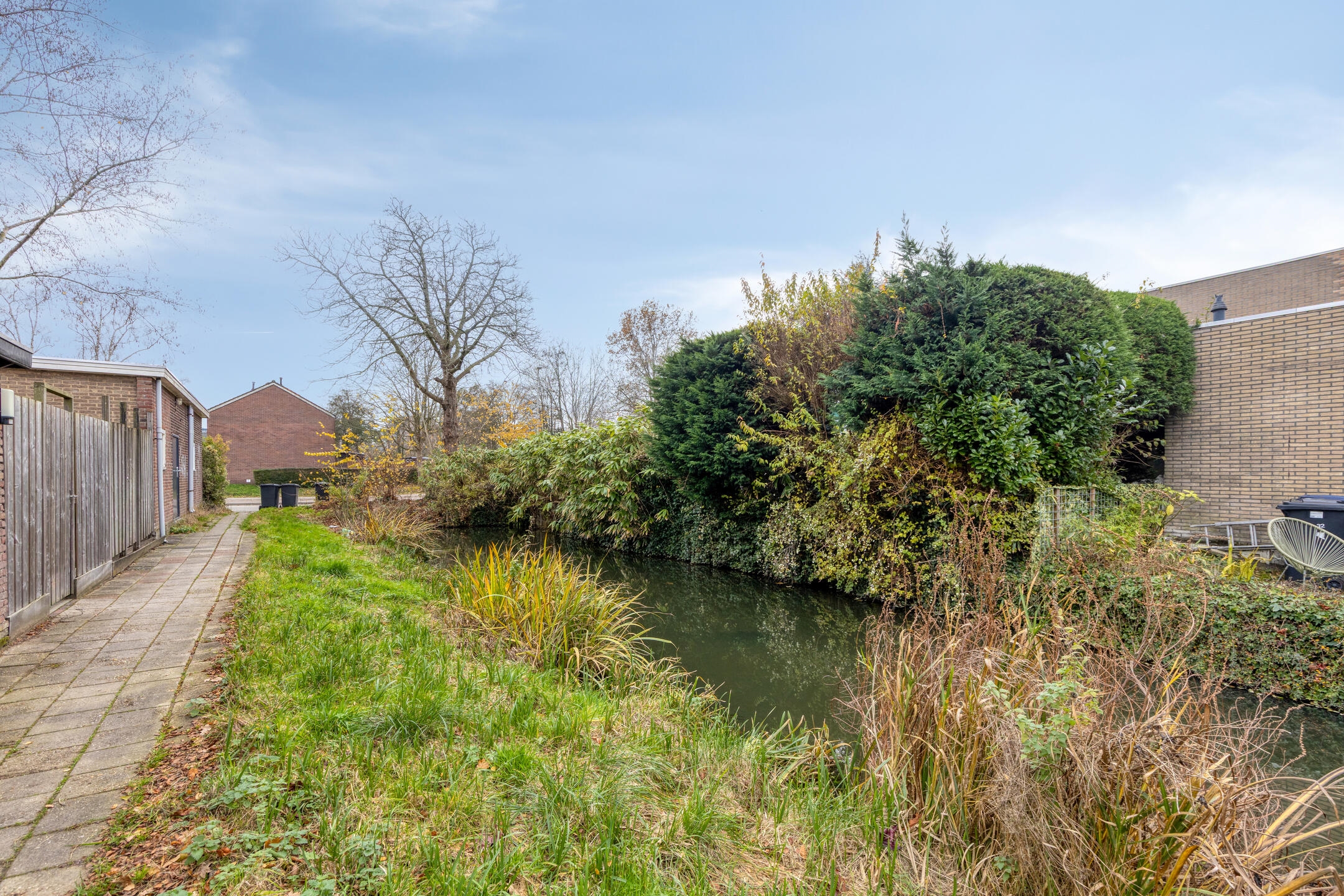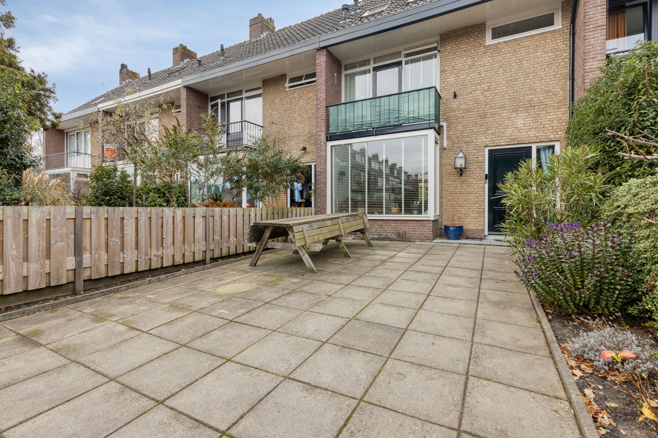 Achtertuin, gelegen op het zuidwesten, voorzien van bestrating, een houten berging met overkapping, elektrische zonwering, buitenkraan en een achterom.
