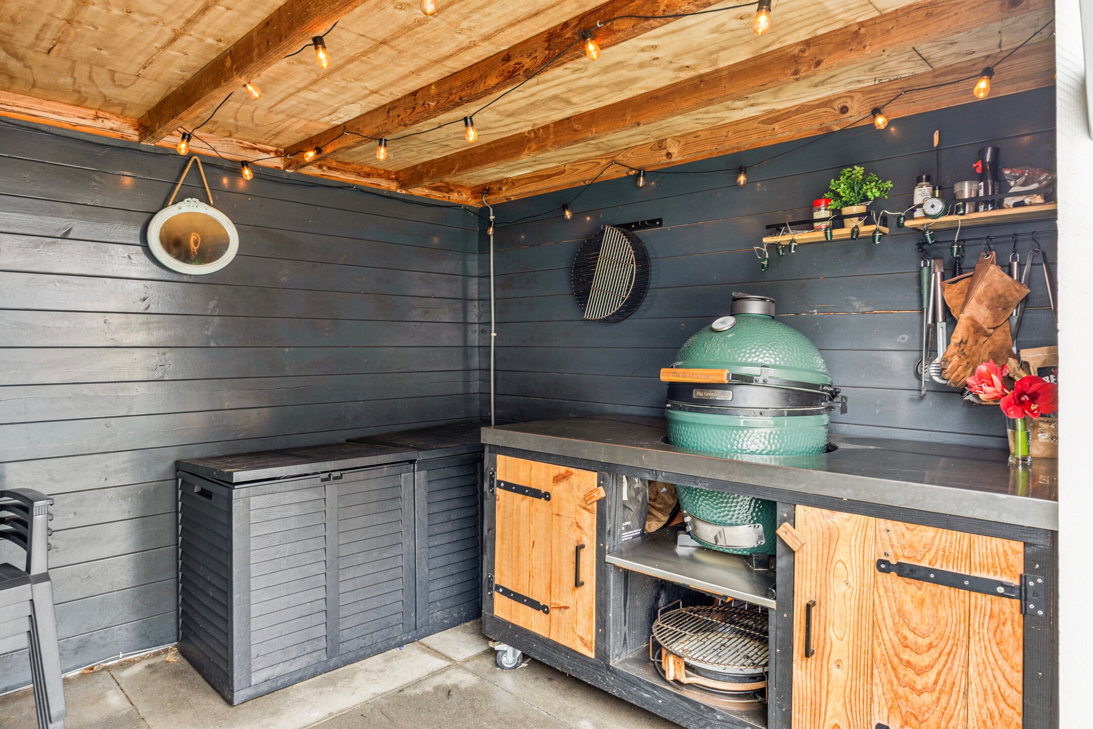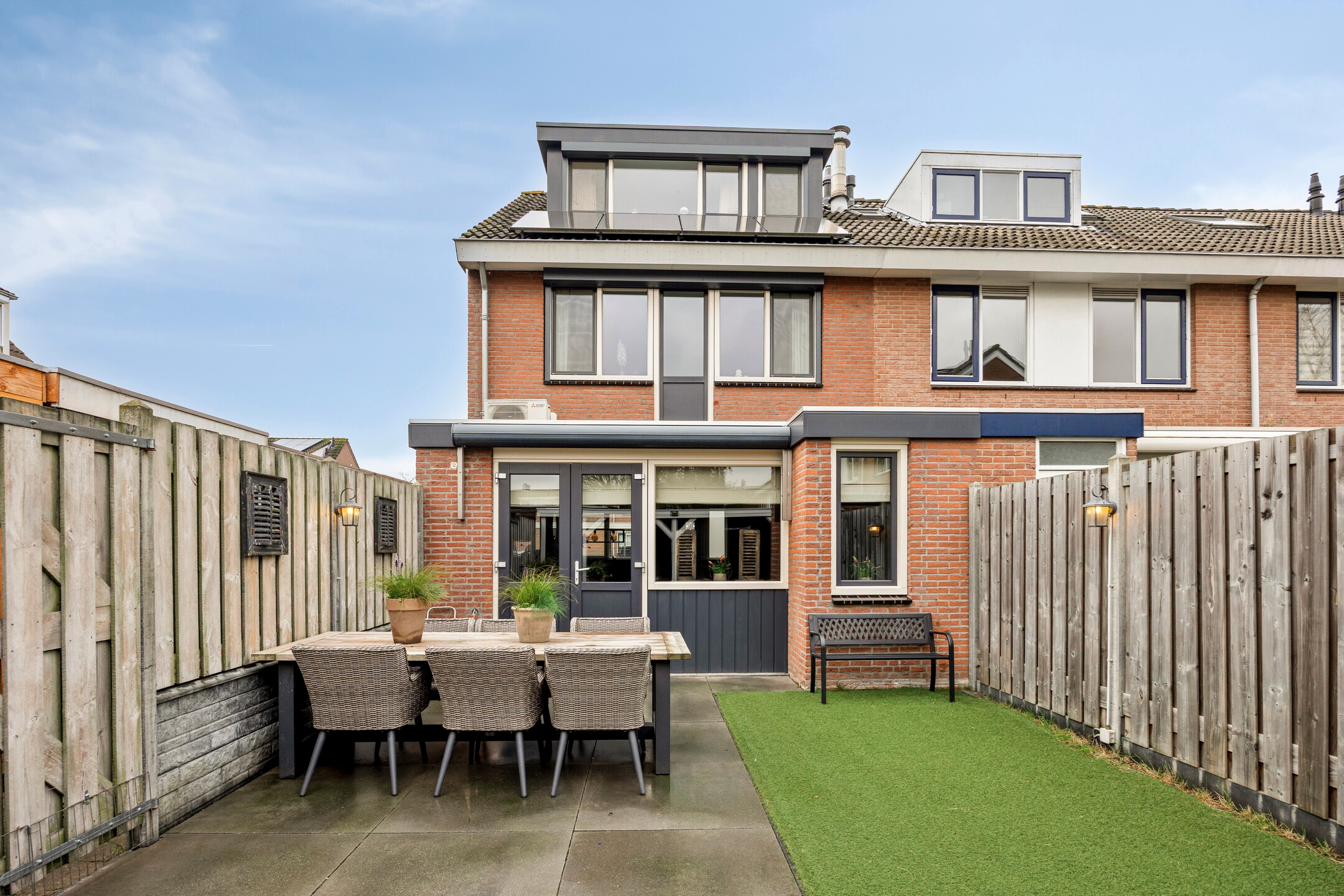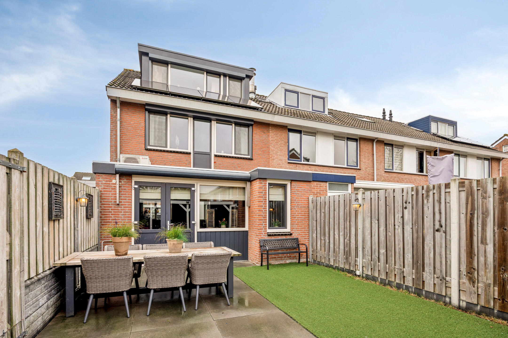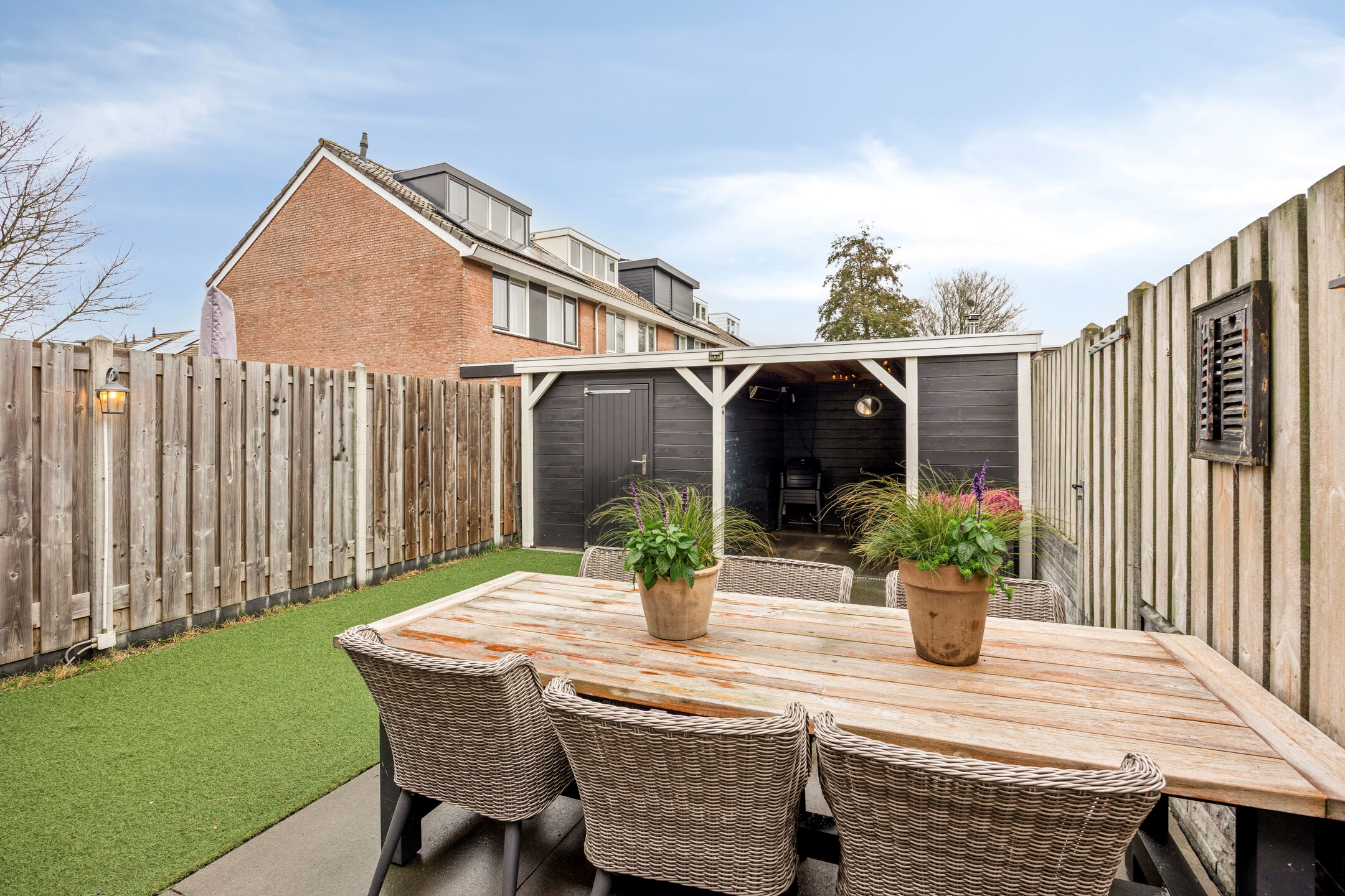 Achtertuin, voorzien van bestrating en kunstgras, een houten veranda met schuur, elektrische zonwering, elektra, buitenkraan, en een zij-uitgang.