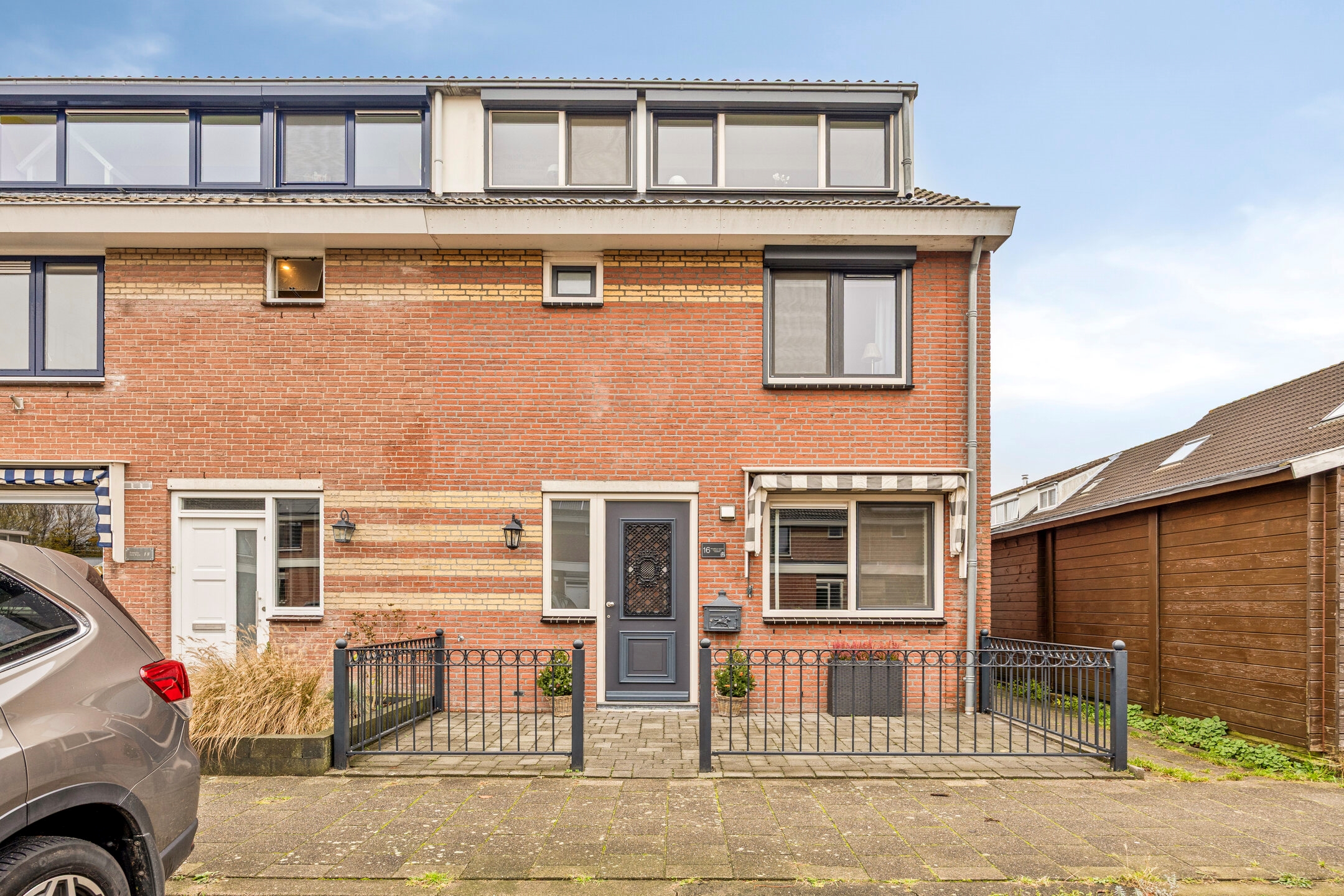 Voortuin, voorzien van sierbestrating, een ijzeren hekwerk, buitenkraan en zonwering (markies).