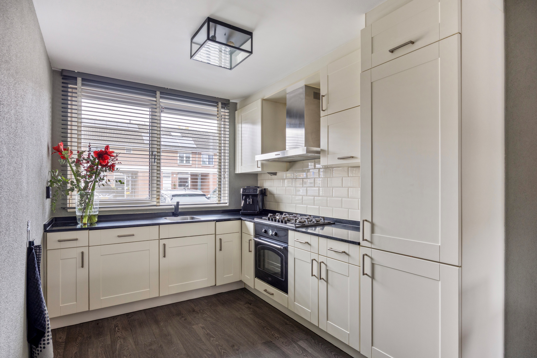 Keuken, een keukenblok in L-vormige opstelling aan de voorzijde van de woning, voorzien van een 5-pits gaskookplaat met afzuigkap, oven, koel/vriescombinatie en vaatwasser.