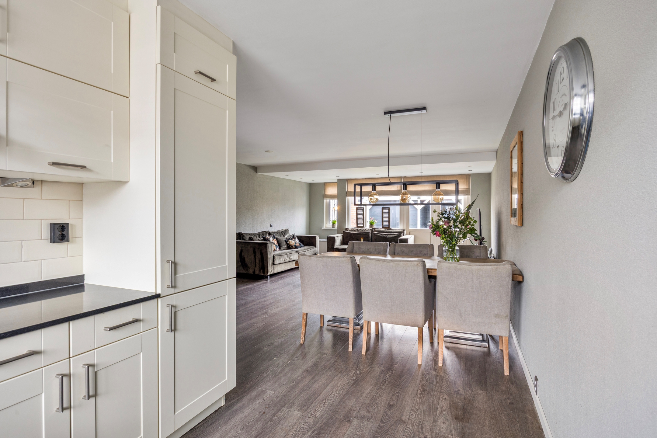 Woonkamer, een royale en uitgebouwde woonkamer met toegang tot de open keuken en de achtertuin middels openslaande deuren. Verder is de woonkamer voorzien van een kast onder de trap.