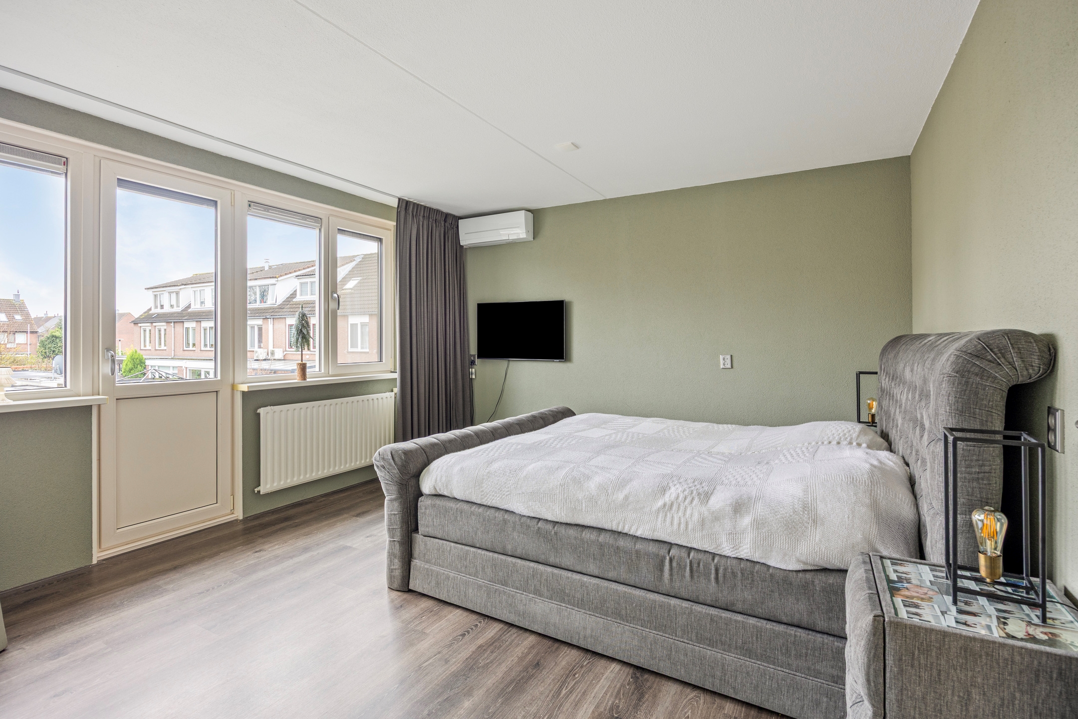 Slaapkamer 1, een royale slaapkamer (voorheen 2 kamers) gelegen aan de achterzijde, voorzien van een grote kast met schuifdeuren, airconditioning en een elektrisch rolluik.