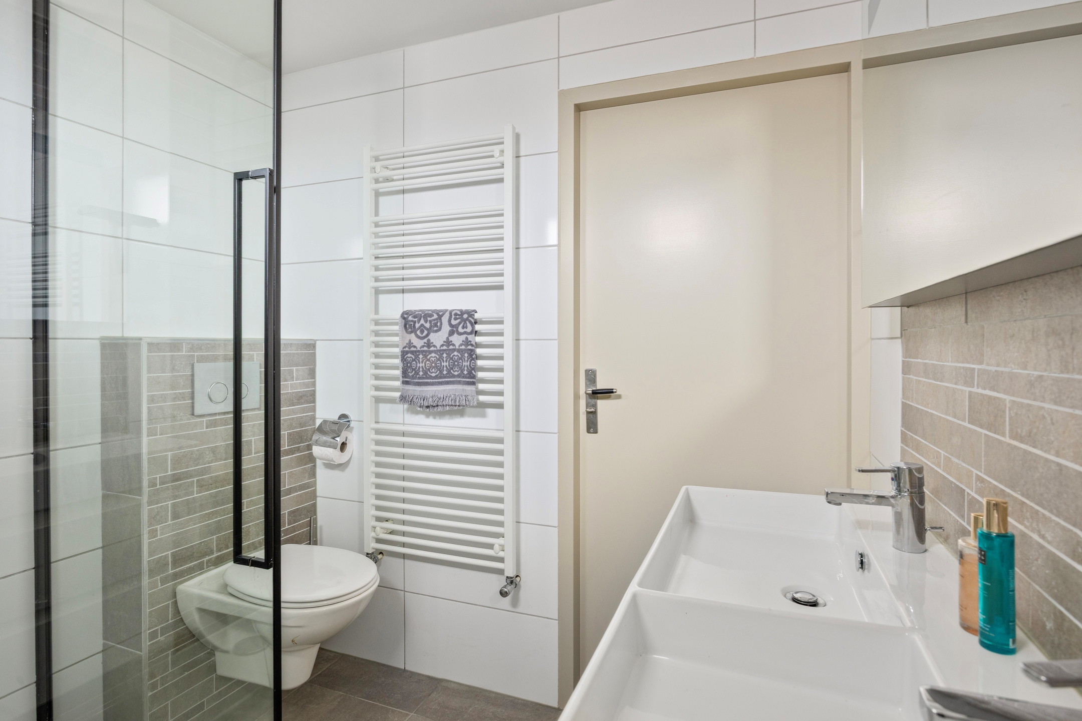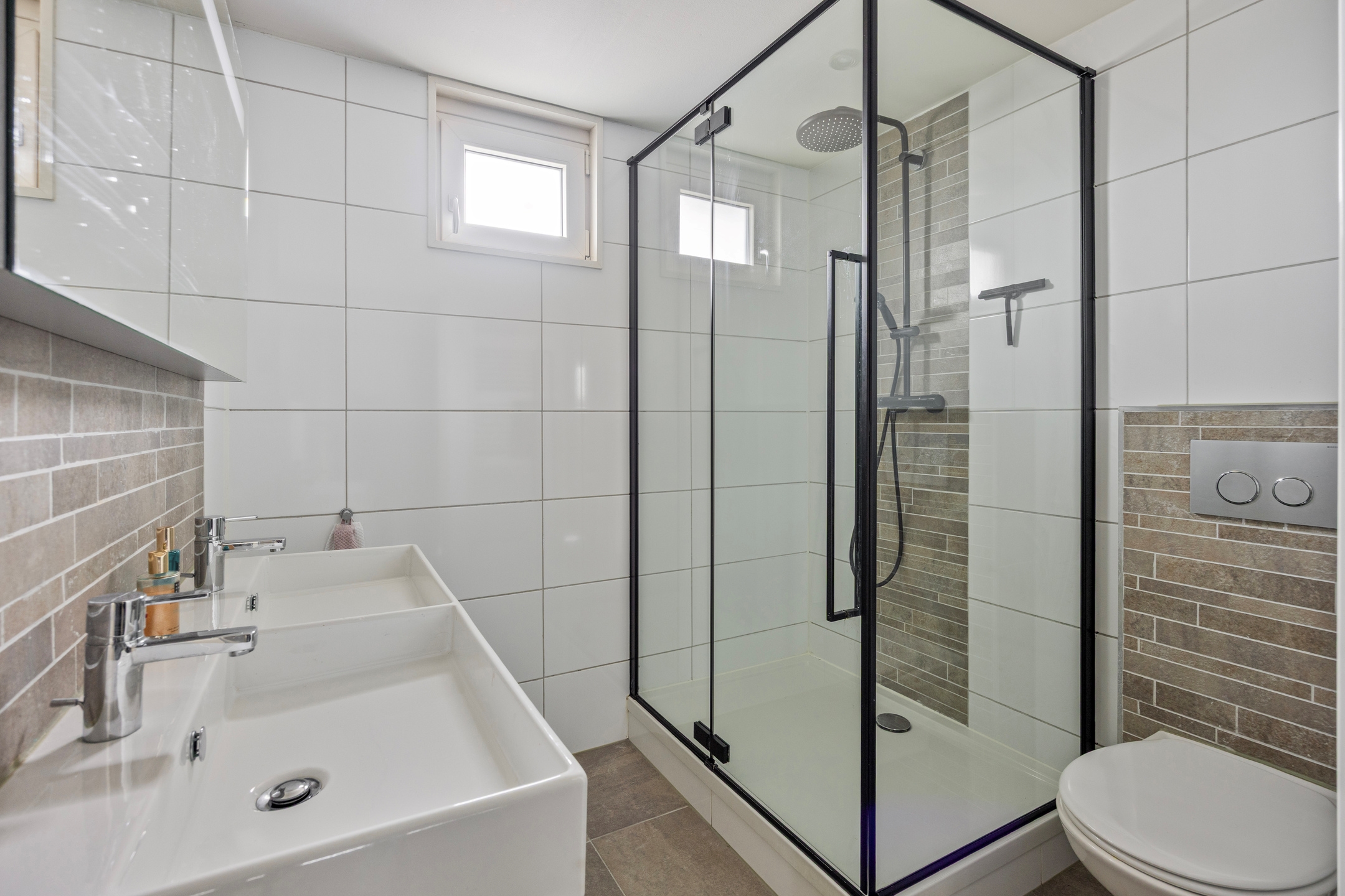 Badkamer, geheel betegeld, voorzien van een ruime douche met thermostaatkraan, rainshower en handdouche, 2 wastafels met onderladen en spiegel met verlichting, een tweede hangend closet, badkamerradiator en een te openen raam.