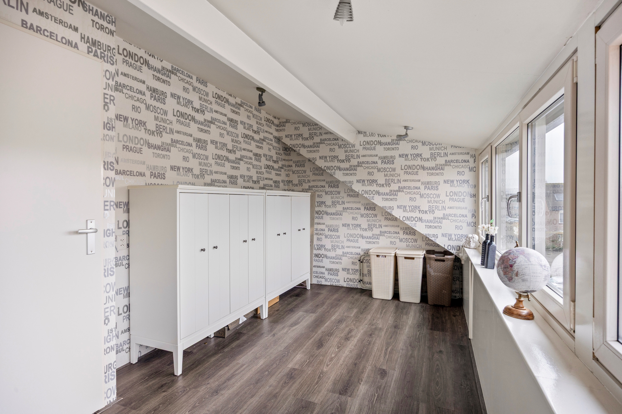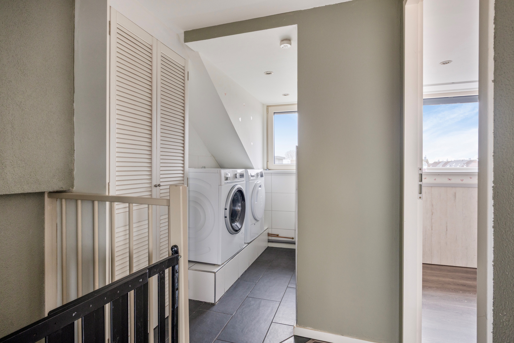 Overloop, met toegang tot 2 slaapkamers, de wasmachine- en drogeraansluiting en de kast met de opstelling van de cv-ketel.