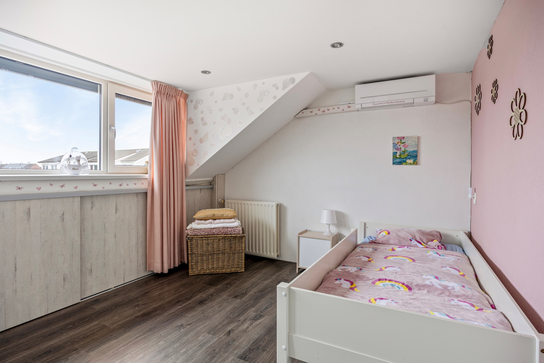 Slaapkamer 3, een ruime kamer voorzien van laminaat vloerafwerking, airconditioning en bergruimte achter de knieschotten.