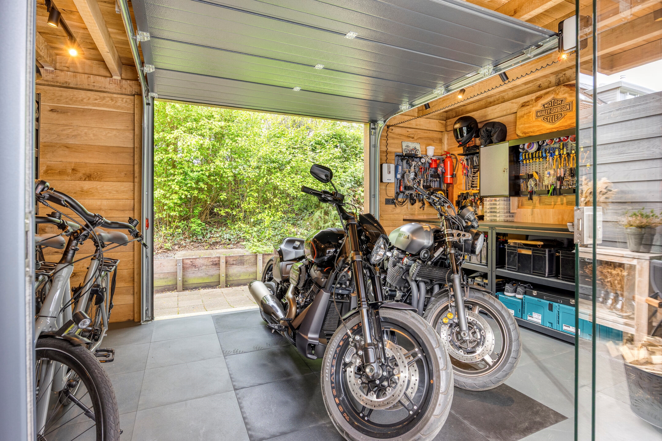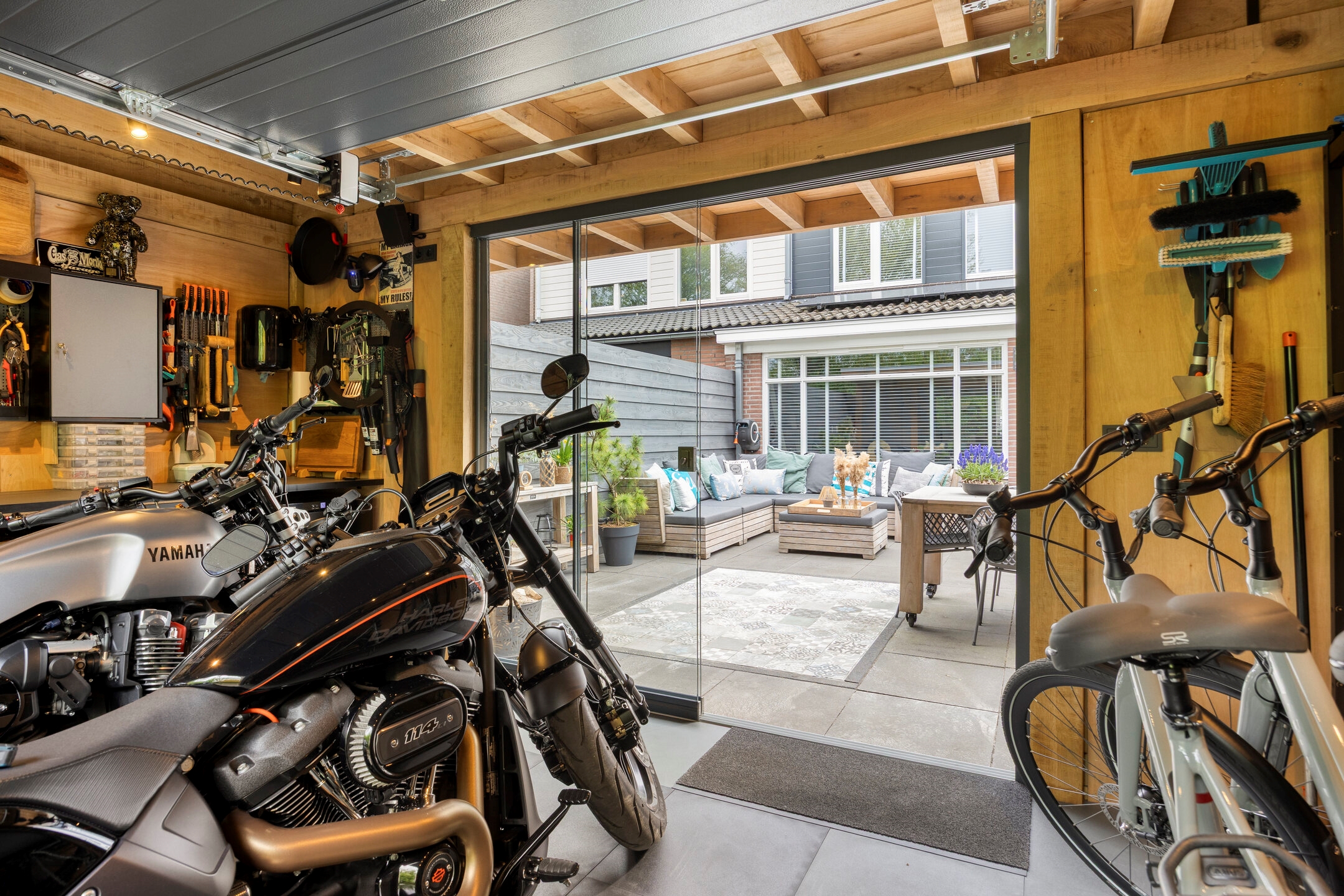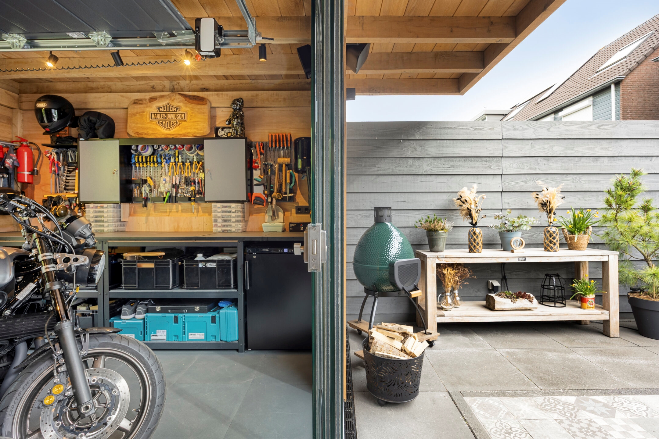 Achtertuin, een heerlijke en fraai aangelegde en zonnige achtertuin (westen), voorzien van sierbestrating, elektra en een buitenkraan. Verder is de tuin in 2021 voorzien van nieuwe schuttingen met hardhouten palen en rabatdelen. In 2023 is er een royale berging/hobbyruimte/veranda gebouwd op een onderheide betonvloer afgewerkt met pvc-tegels, voorzien van een elektrisch bedienbare garagedeur (Novoferm) naar het achterpad en chique glazen schuifdeuren richting de achtertuin.