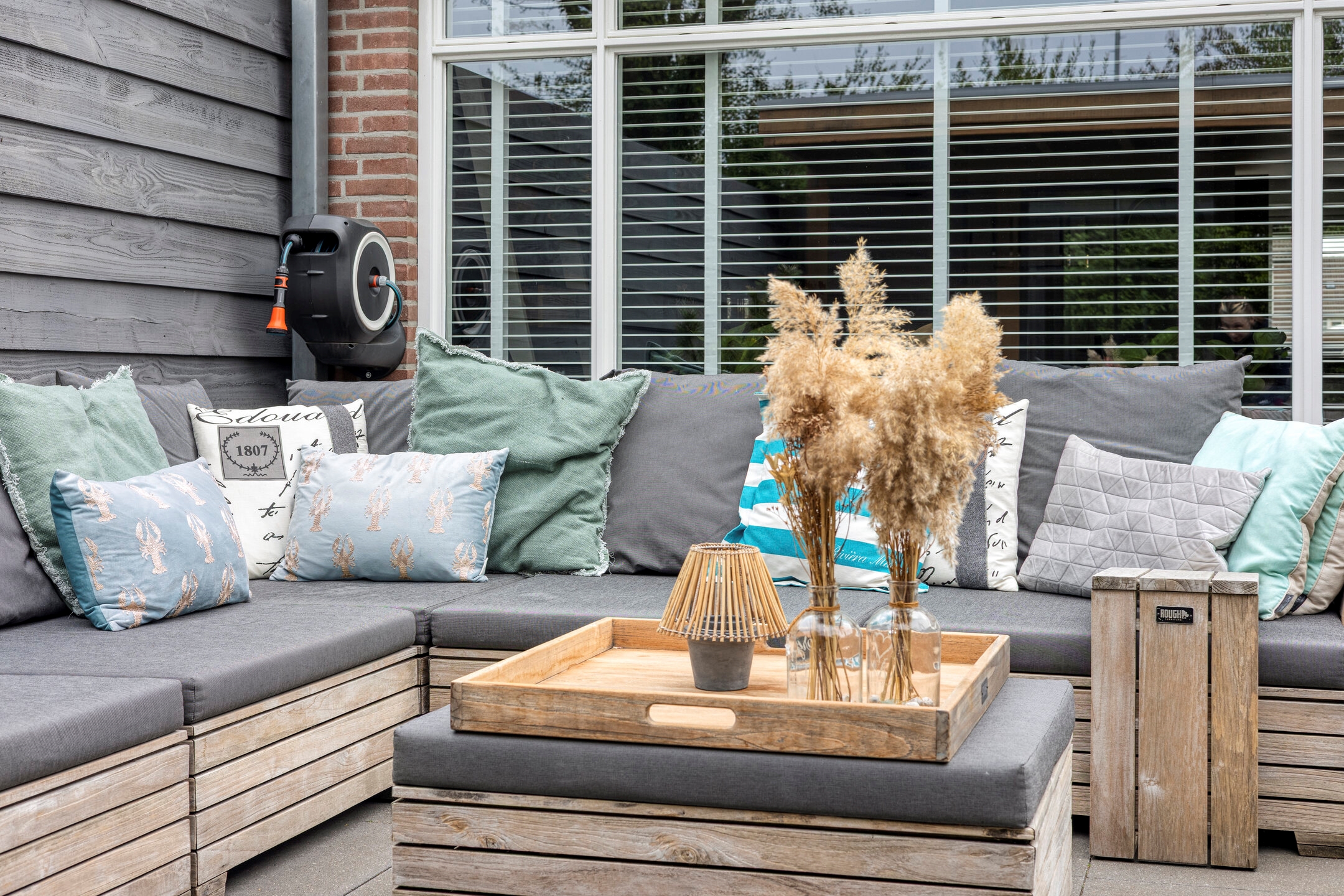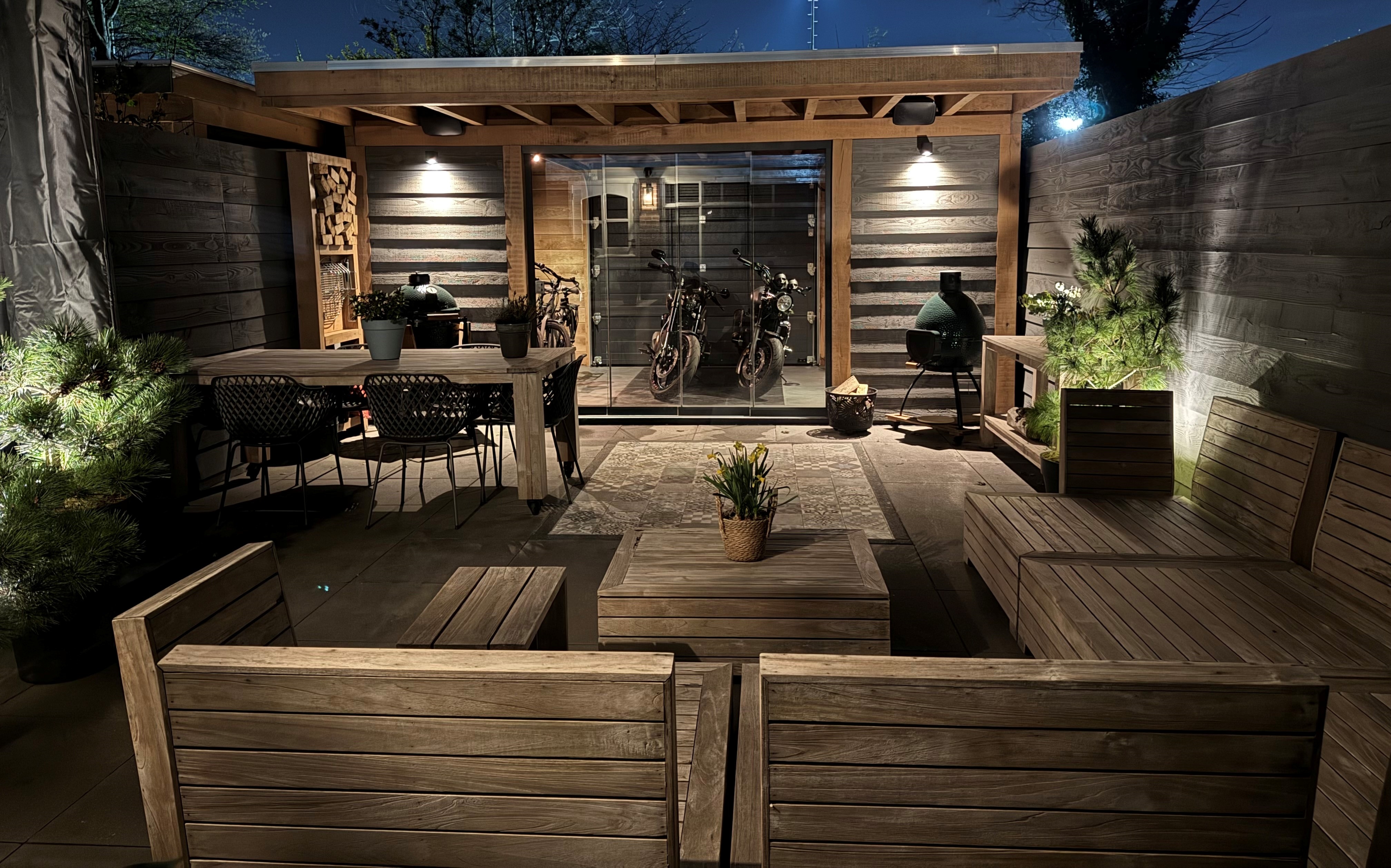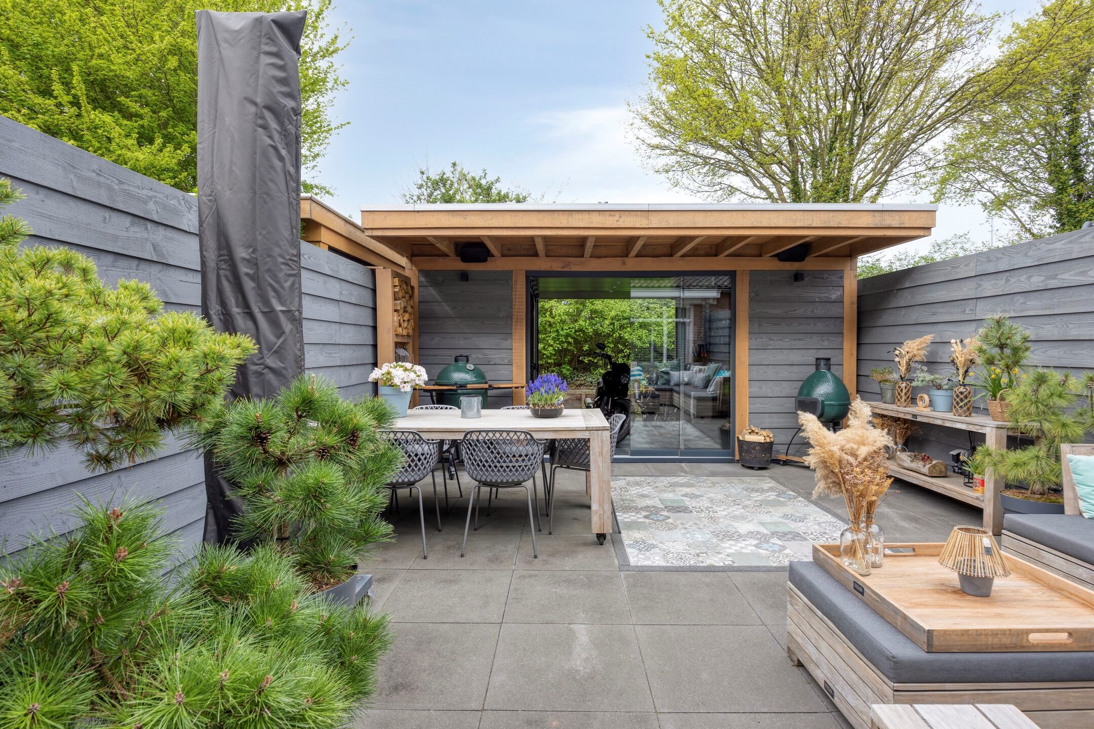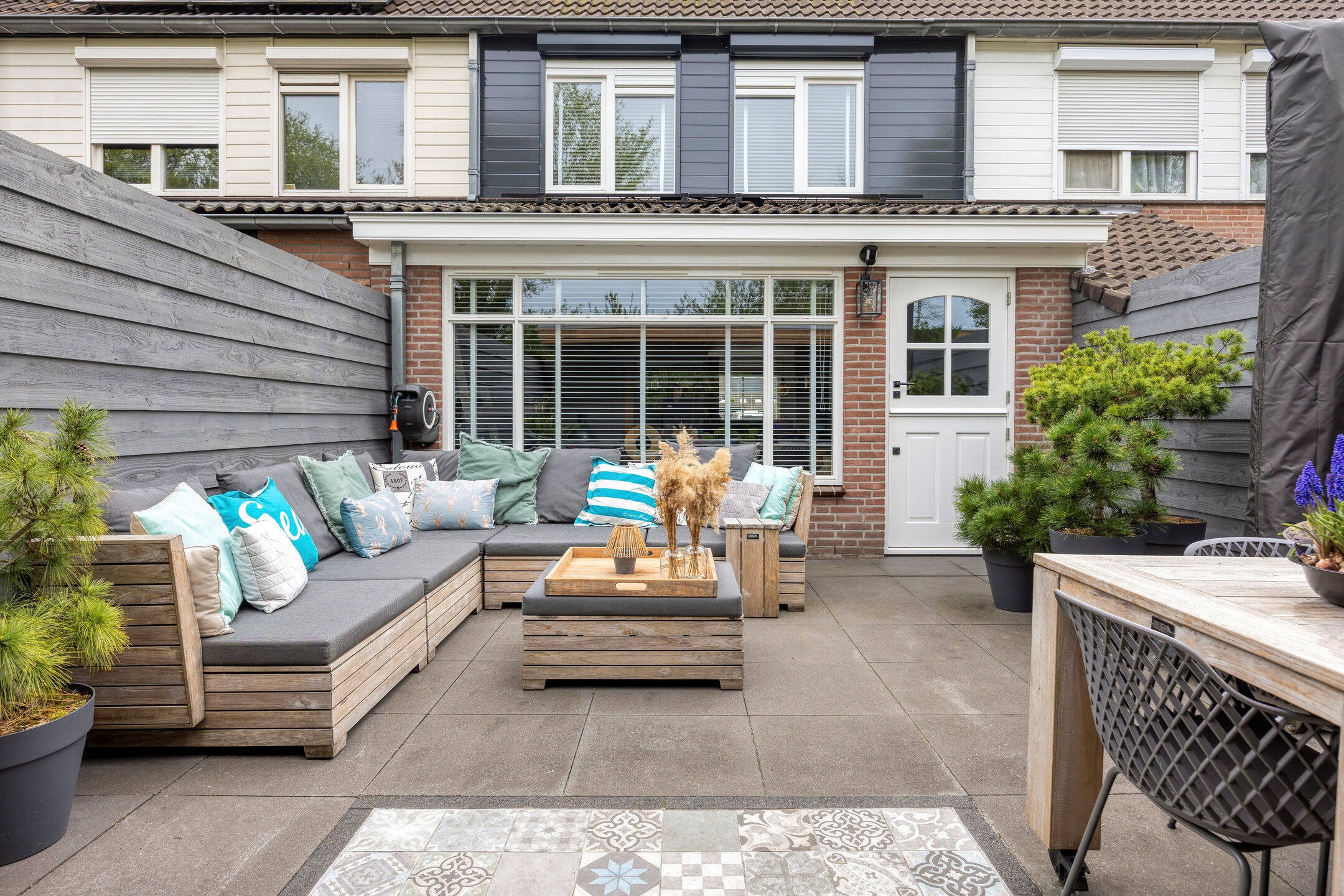 Achtertuin, een heerlijke en fraai aangelegde en zonnige achtertuin (westen), voorzien van sierbestrating, elektra en een buitenkraan. Verder is de tuin in 2021 voorzien van nieuwe schuttingen met hardhouten palen en rabatdelen. In 2023 is er een royale berging/hobbyruimte/veranda gebouwd op een onderheide betonvloer afgewerkt met pvc-tegels, voorzien van een elektrisch bedienbare garagedeur (Novoferm) naar het achterpad en chique glazen schuifdeuren richting de achtertuin.