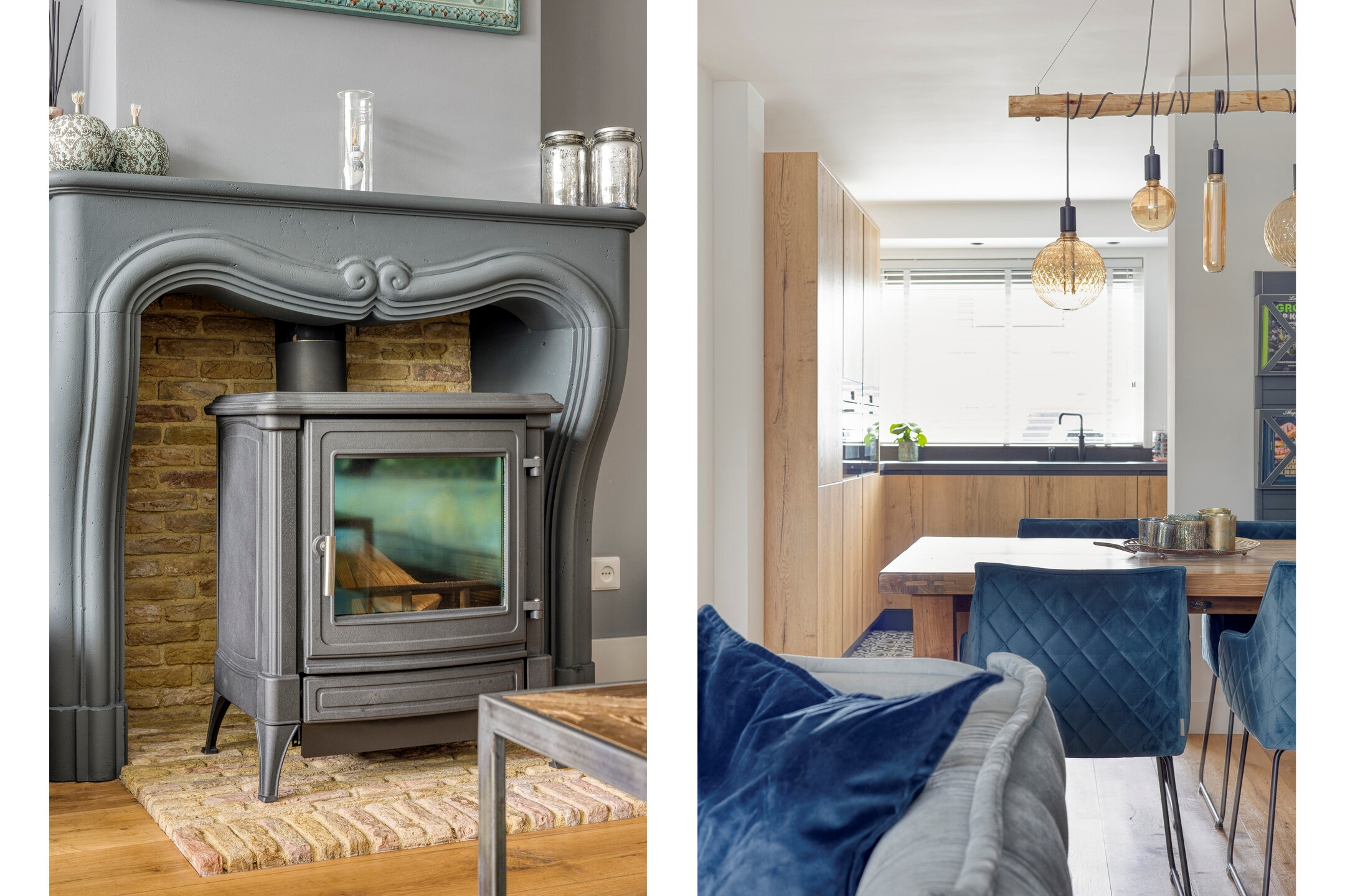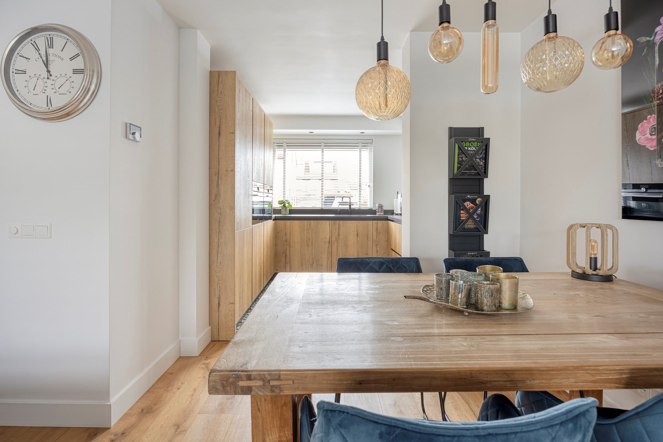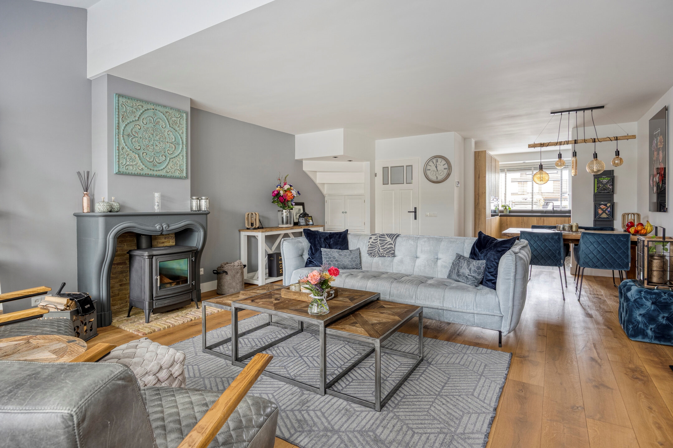 Woonkamer, een ruime en uitgebouwde woonkamer, voorzien van fraaie massief eiken vloerdelen, een gezellige houtkachel met schouw en een praktische bergkast onder de trap. Vanuit de woonkamer is er toegang tot de keuken en achtertuin.