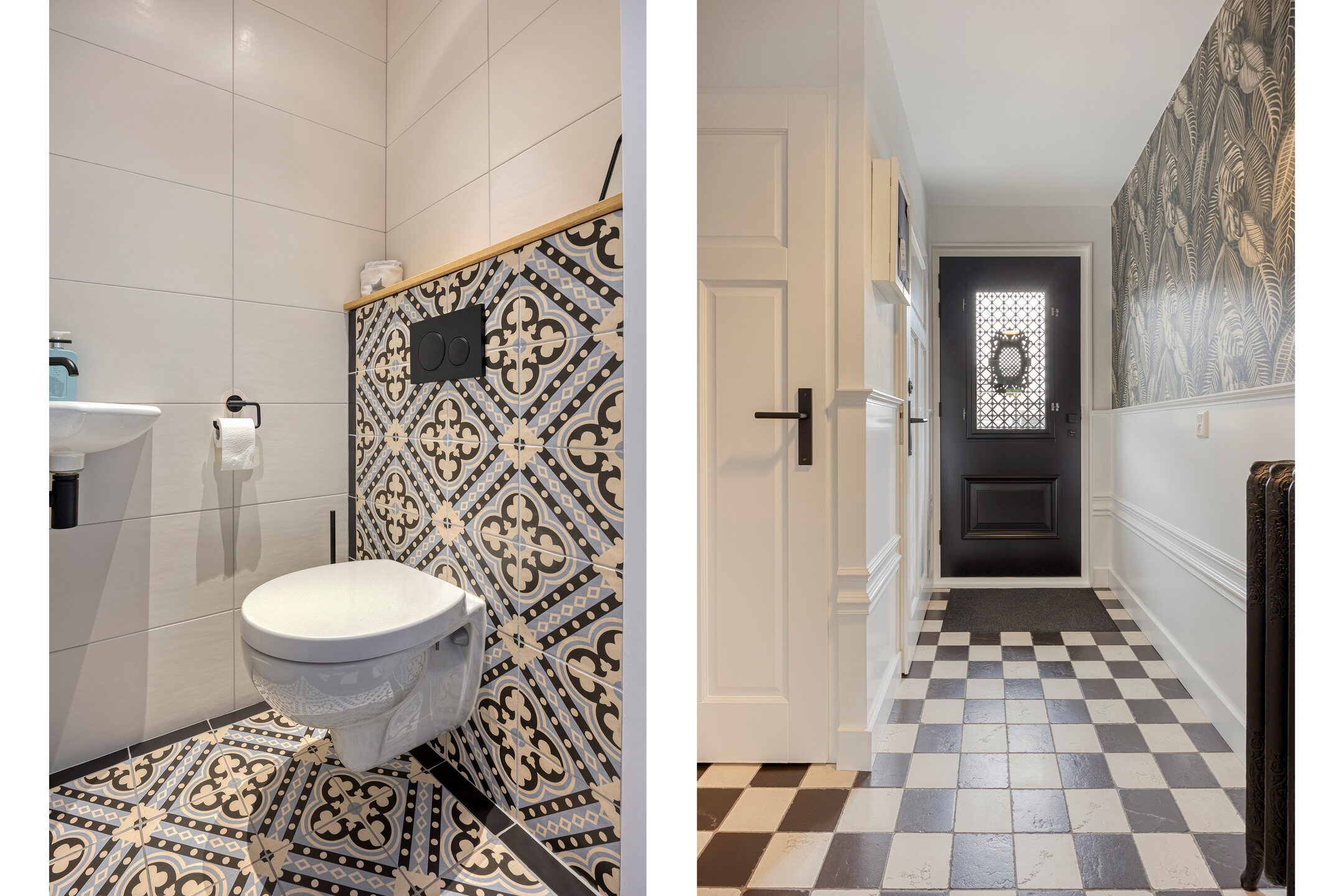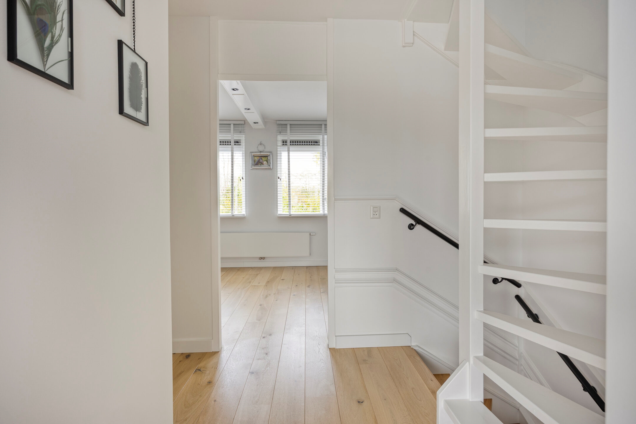 Entree/hal, voorzien van een frisse tegelvloer, gedeeltelijk lambrisering muurafwerking, een fraaie gietijzeren sierradiator en een maatwerk garderobekast. Vanuit de hal is er toegang tot de woonkamer, toilet, meterkast en de fraai afgewerkte trapopgang met eikenhout trapbekleding.