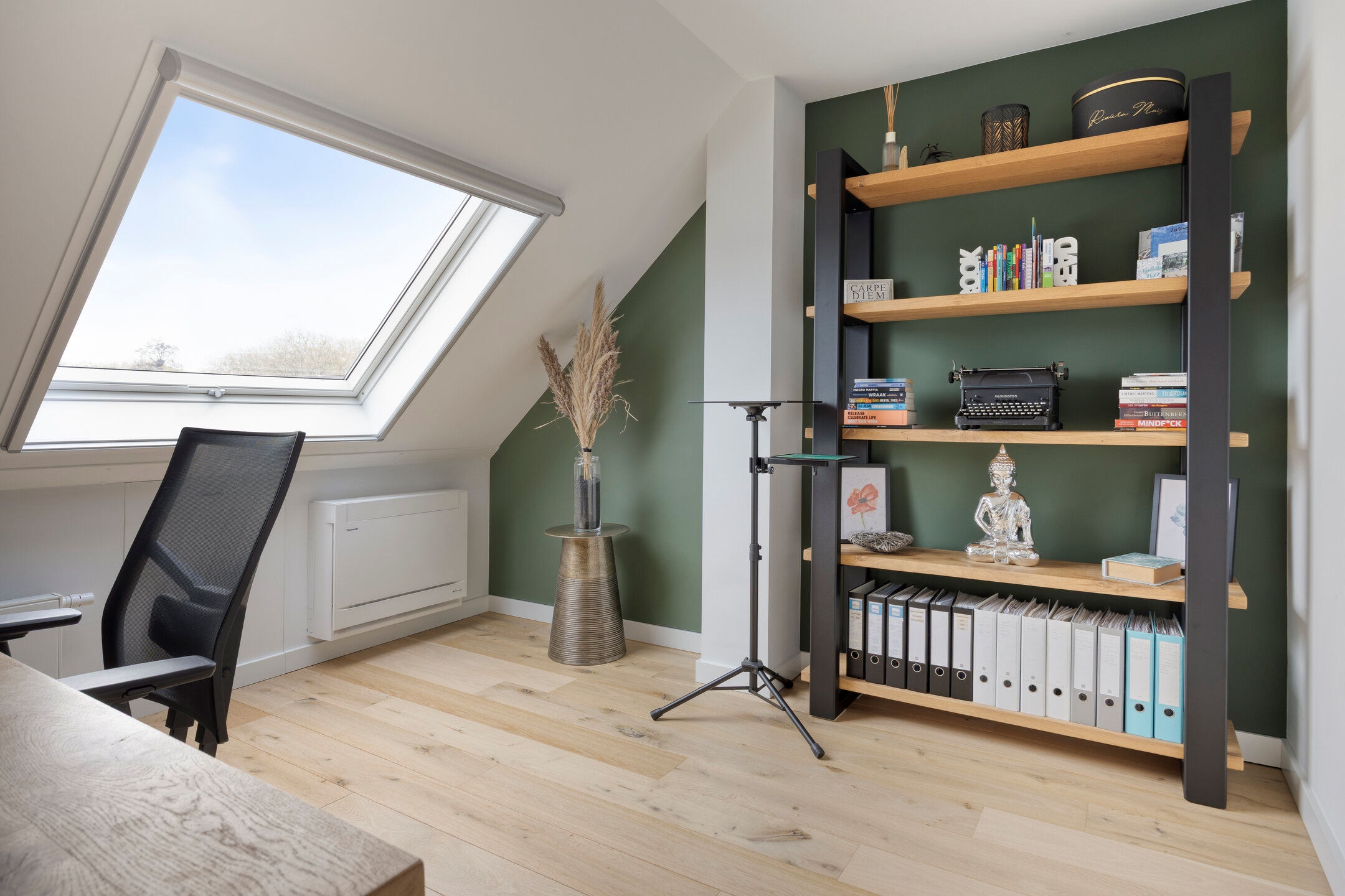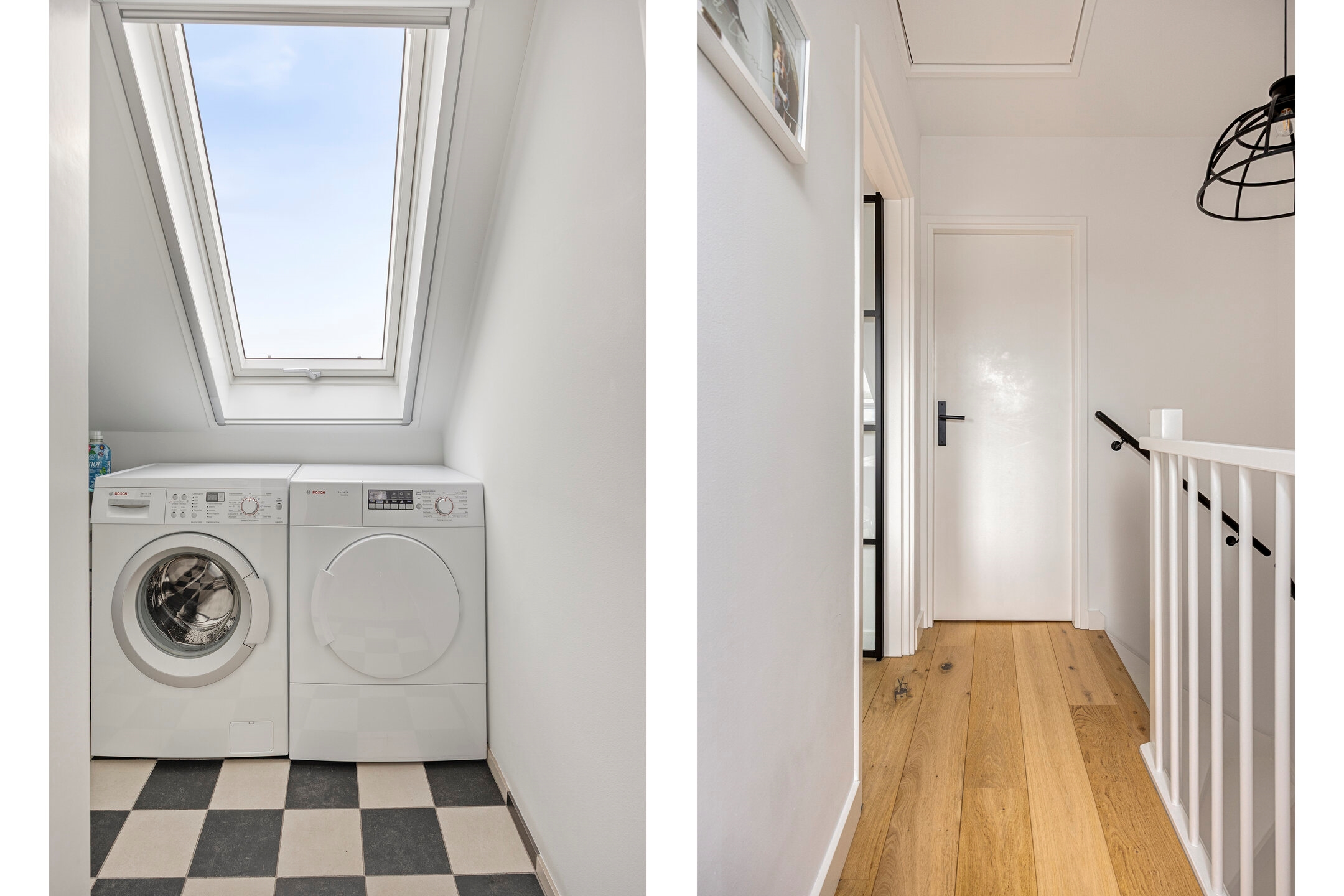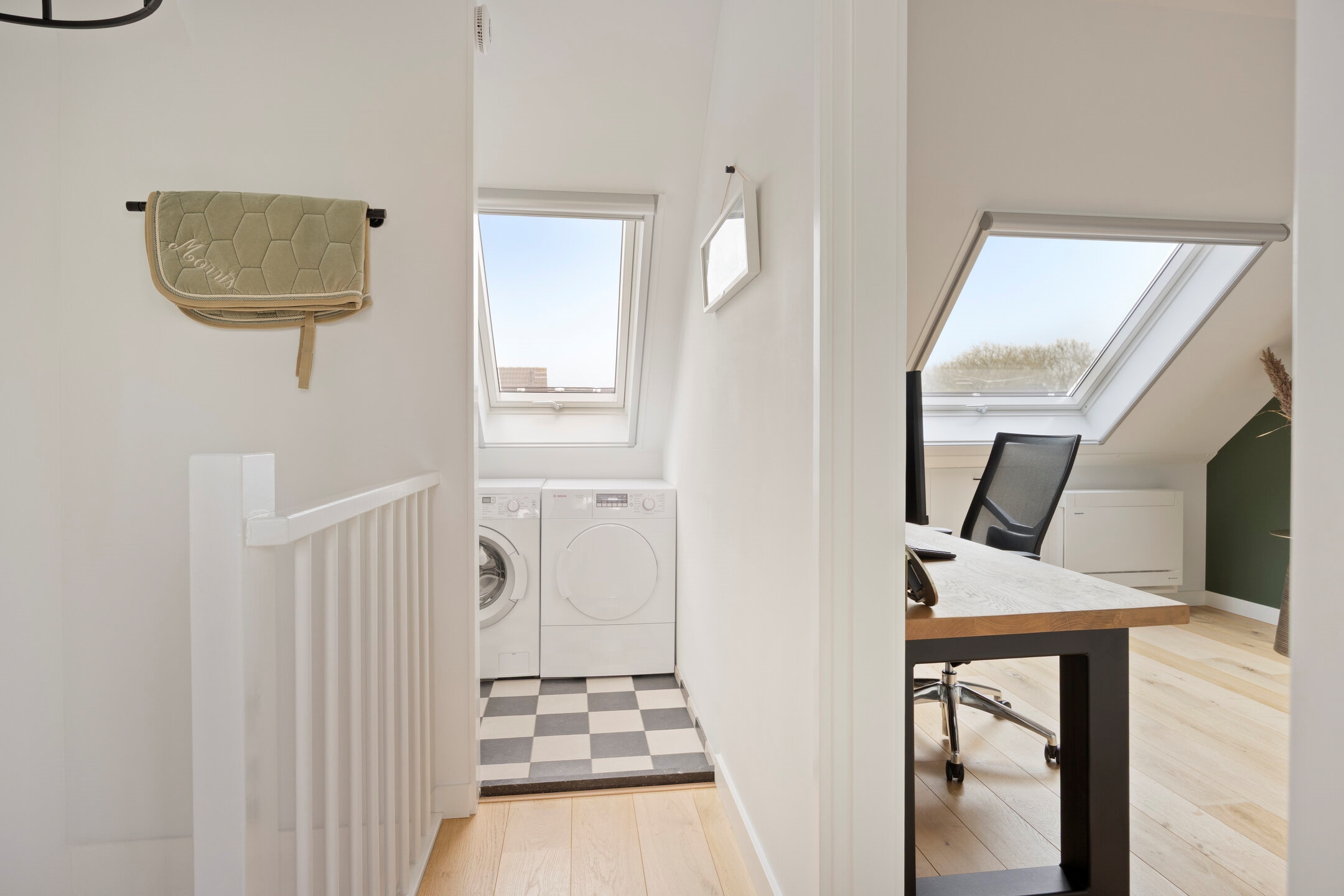 Overloop, voorzien van een Velux dakraam met zonwering en vliegenhor, een wasmachine- en drogeraansluiting en de opstelling van de cv-ketel en mechanische ventilatie-unit. Daarnaast biedt de overloop toegang tot twee slaapkamers en de bergvliering.