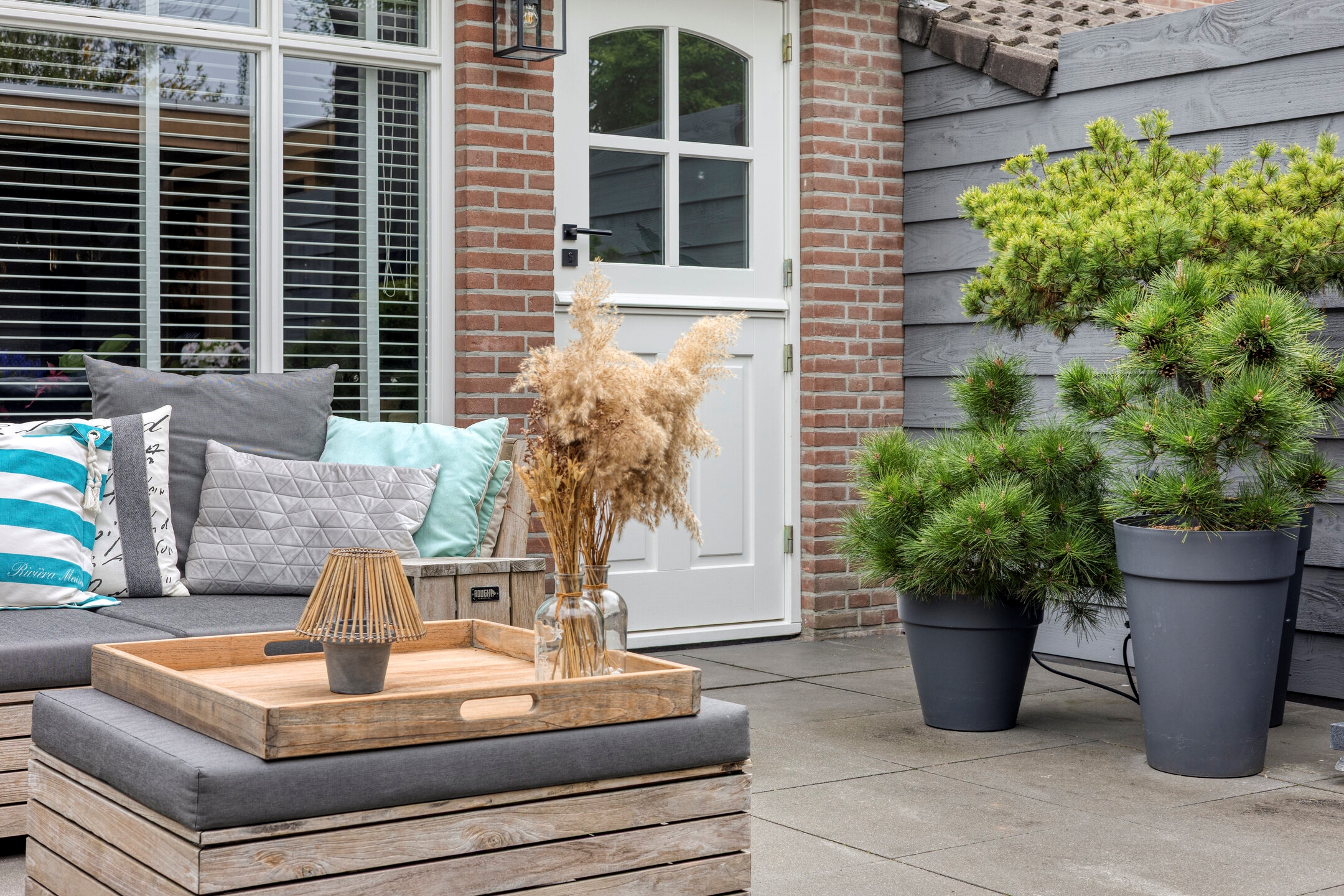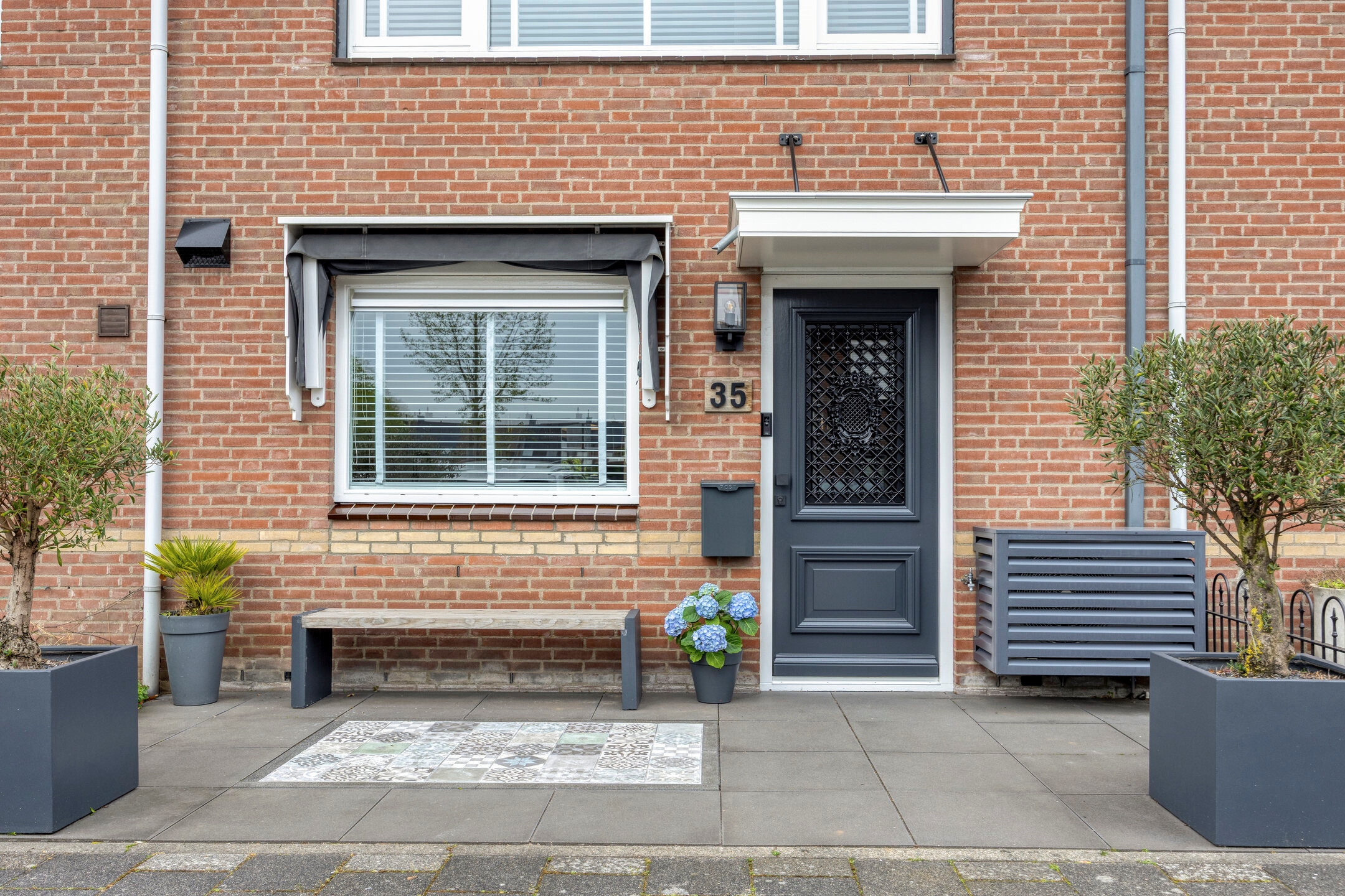 Voortuin, voorzien van sierbestrating, een buitenkraan, leuke Markies zonwering voor het keukenraam en luxe voordeur met sierraster (2024) en deurluifel (2024).