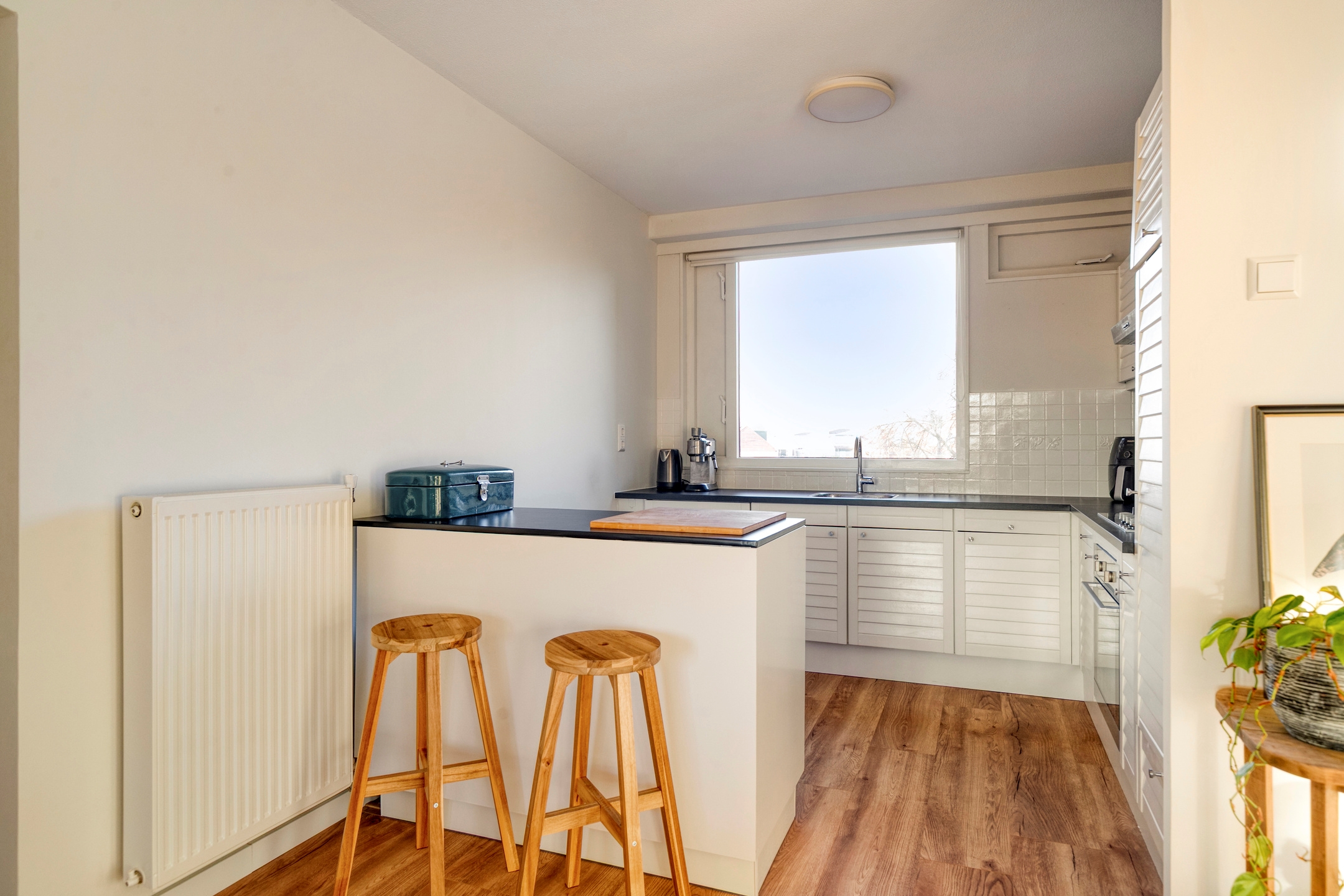 Keuken, een open keuken gelegen aan de voorzijde van het appartement met heerlijk vrij uitzicht. Voorzien van een L-vormige keukenopstelling met gaskookplaat en afzuigkap, oven, koelkast met vriesvak en een vaatwasser. Verder is de keuken voorzien van een schiereiland kasten/ladeblok.