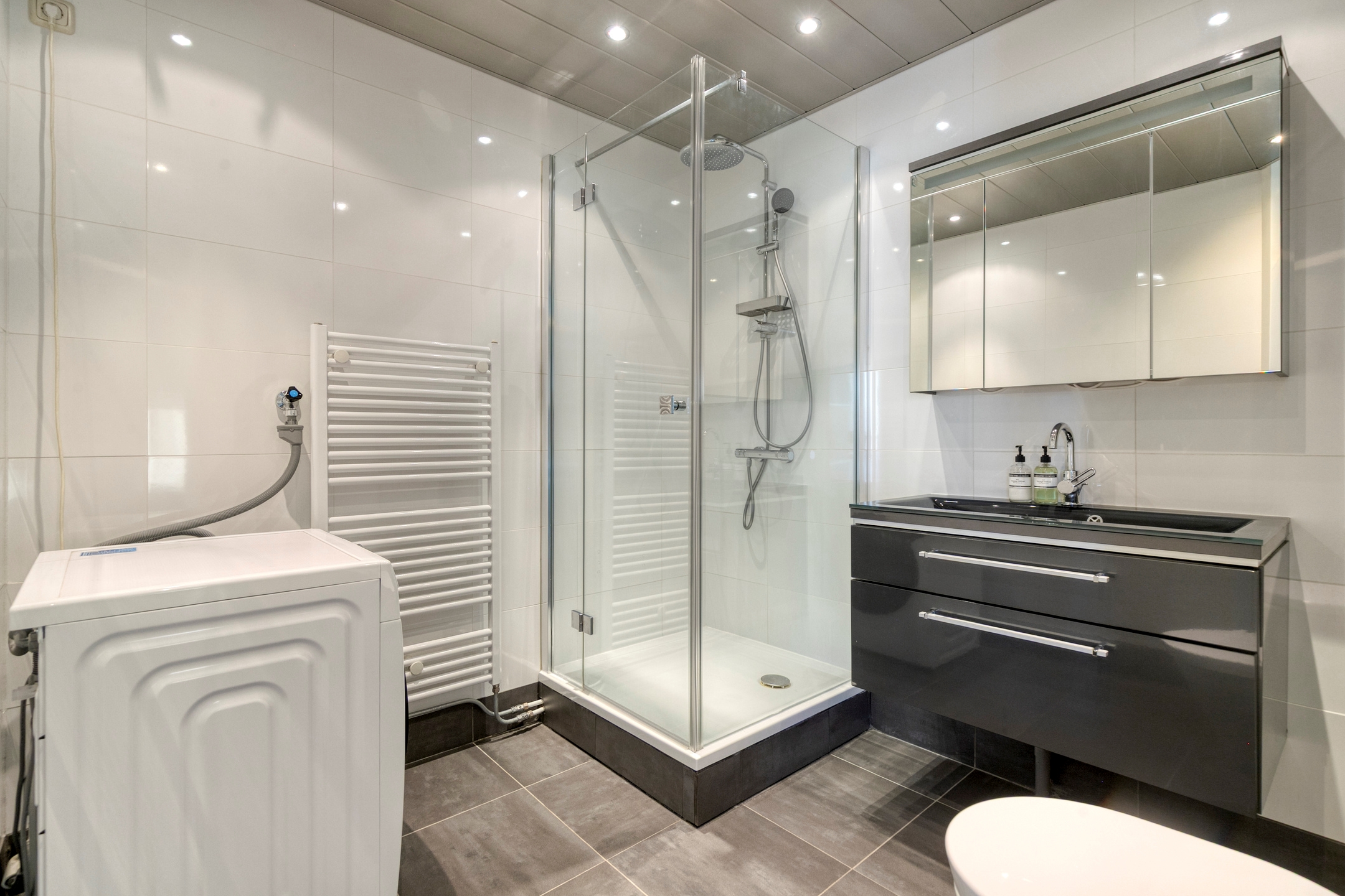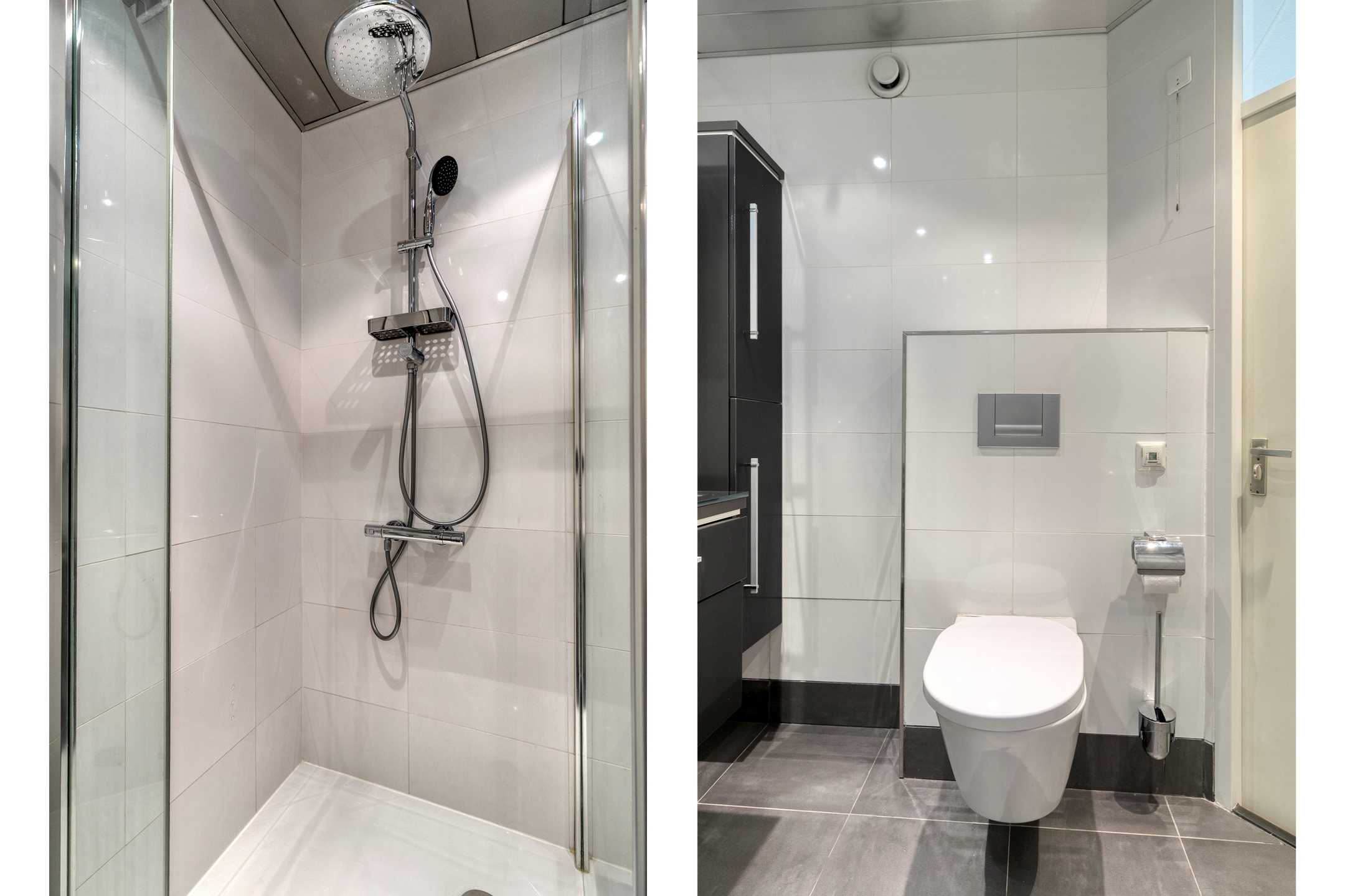 Badkamer, een opvallend ruime en geheel betegelde ruimte voorzien van een douchecabine met thermostaatkraan, rainshower en handdouche, wastafel met onderladen, spiegelkast, kolomkast, mechanische ventilatie en een tweede toilet (hangend closet).