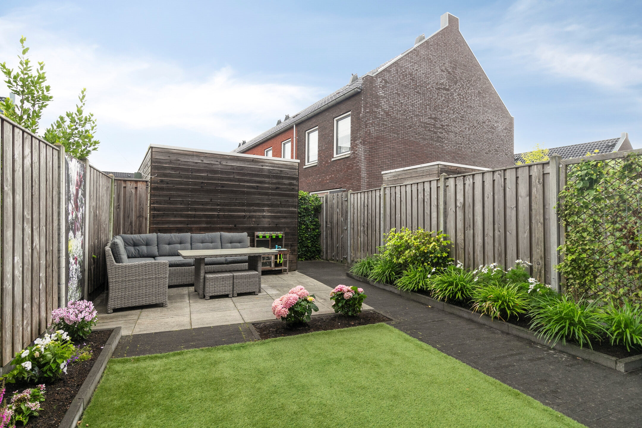 Achtertuin, een heerlijke achtertuin op het noordoosten, voorzien van zowel sierbestrating als kunstgras en groene borders. Verder is de tuin uitgerust met een houten berging (met elektra en verlichting), een buitenkraan en een achterom.