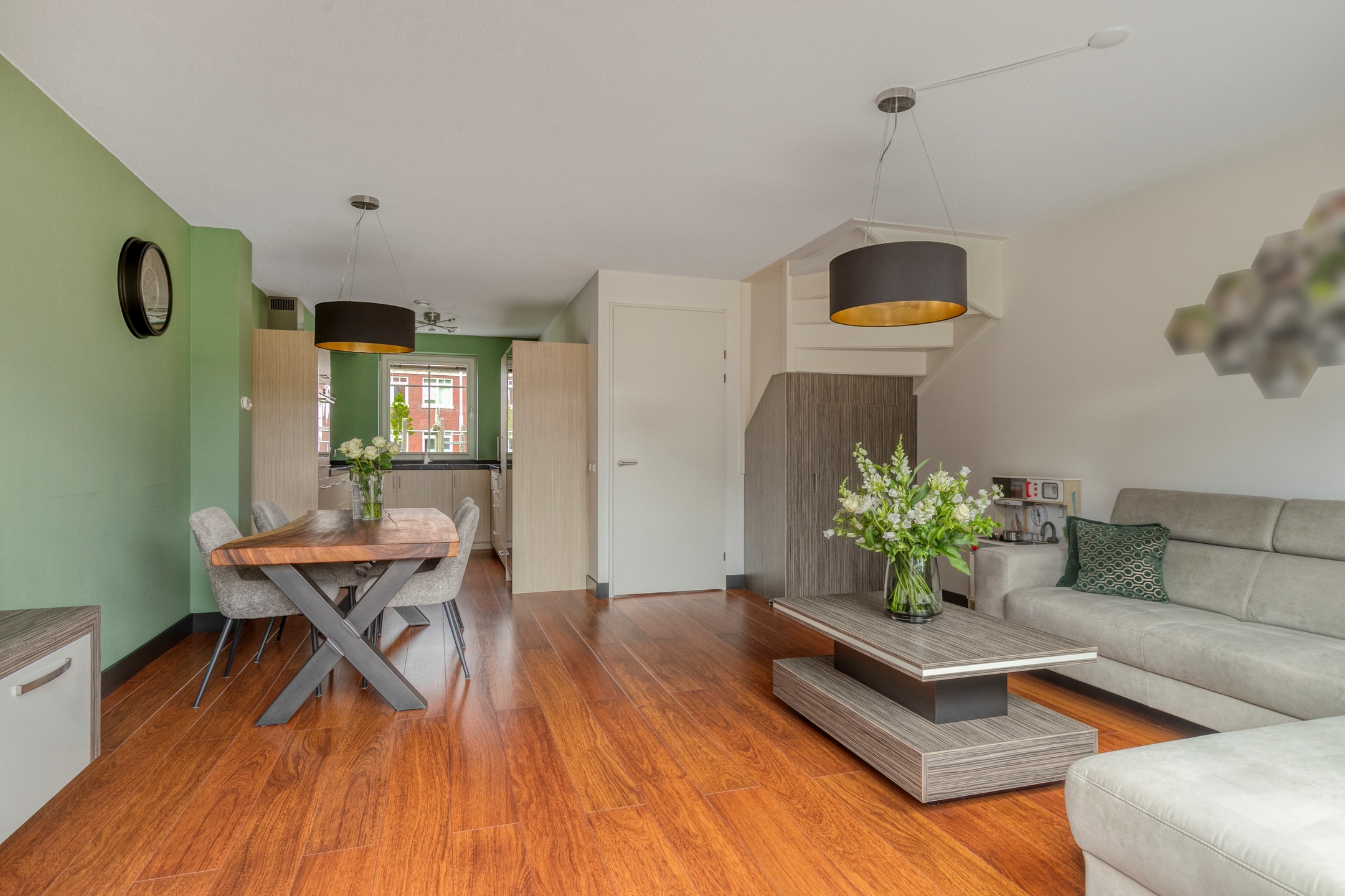 Woonkamer, een ruime en lichte woonkamer, voorzien van maatwerk wandmeubel en een praktische kast onder de trap van hetzelfde materiaal als het wandmeubel. Vanuit de woonkamer is er toegang tot de keuken en achtertuin.
