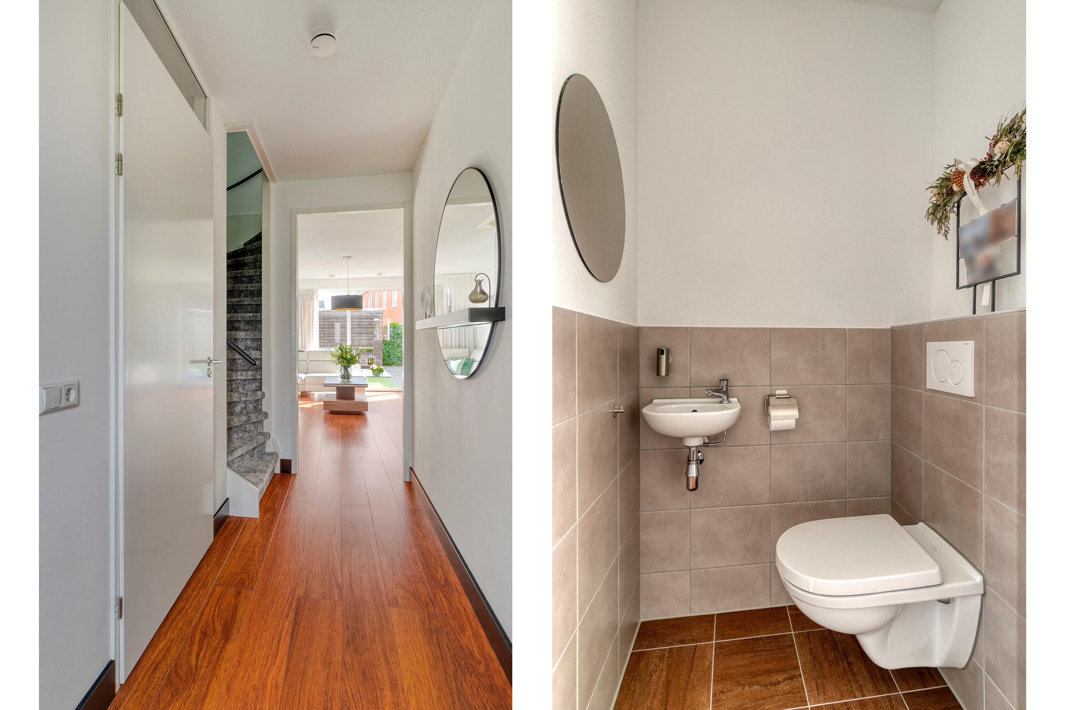 Toilet, grotendeels betegeld (matchend met de laminaat vloer), voorzien van een hangend closet, fonteintje en mechanische ventilatie.