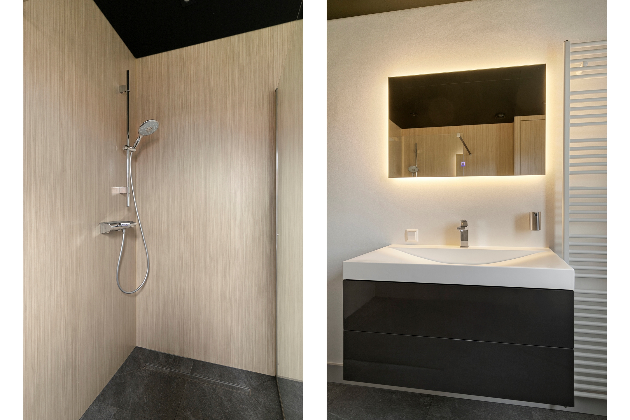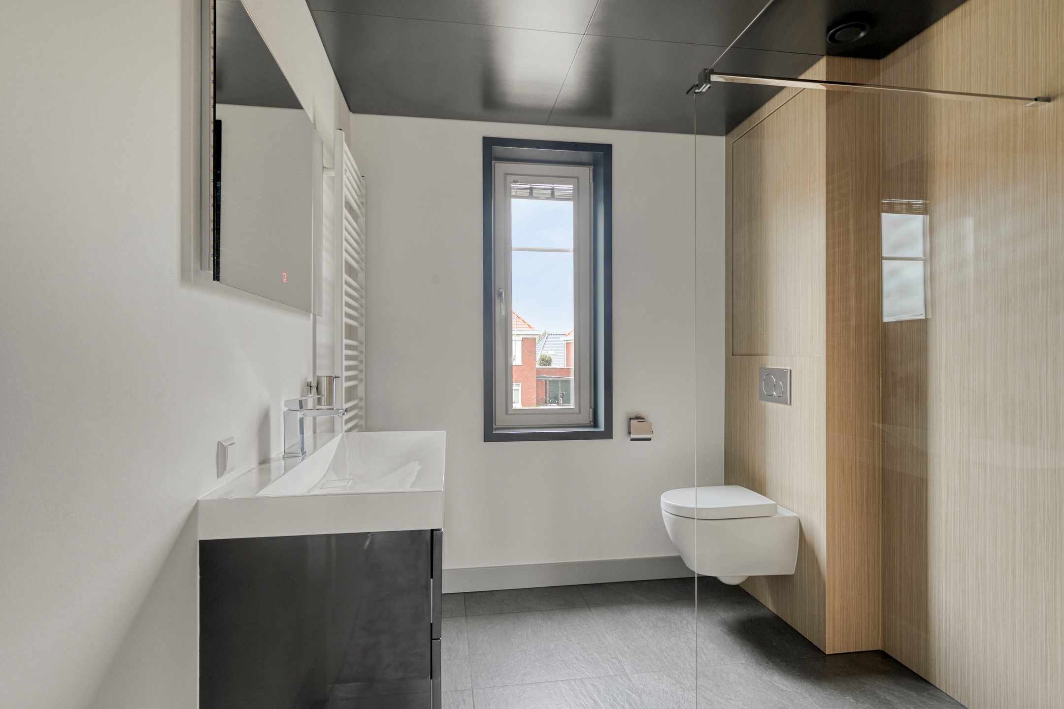 Badkamer (2017), een ruime en zeer nette badkamer, voorzien van een royale inloopdouche met thermostaatkraan, een brede wastafel met onderladen, spiegel met verlichting, een tweede toilet (hangend closet inclusief ingebouwde opbergkast) en een badkamerradiator. Verder is de badkamer afgewerkt met een tegelvloer met elektrische vloerverwarming, fraaie plafondpanelen met sterrenhemel (verlichting), mechanische ventilatie en een te openen raam.