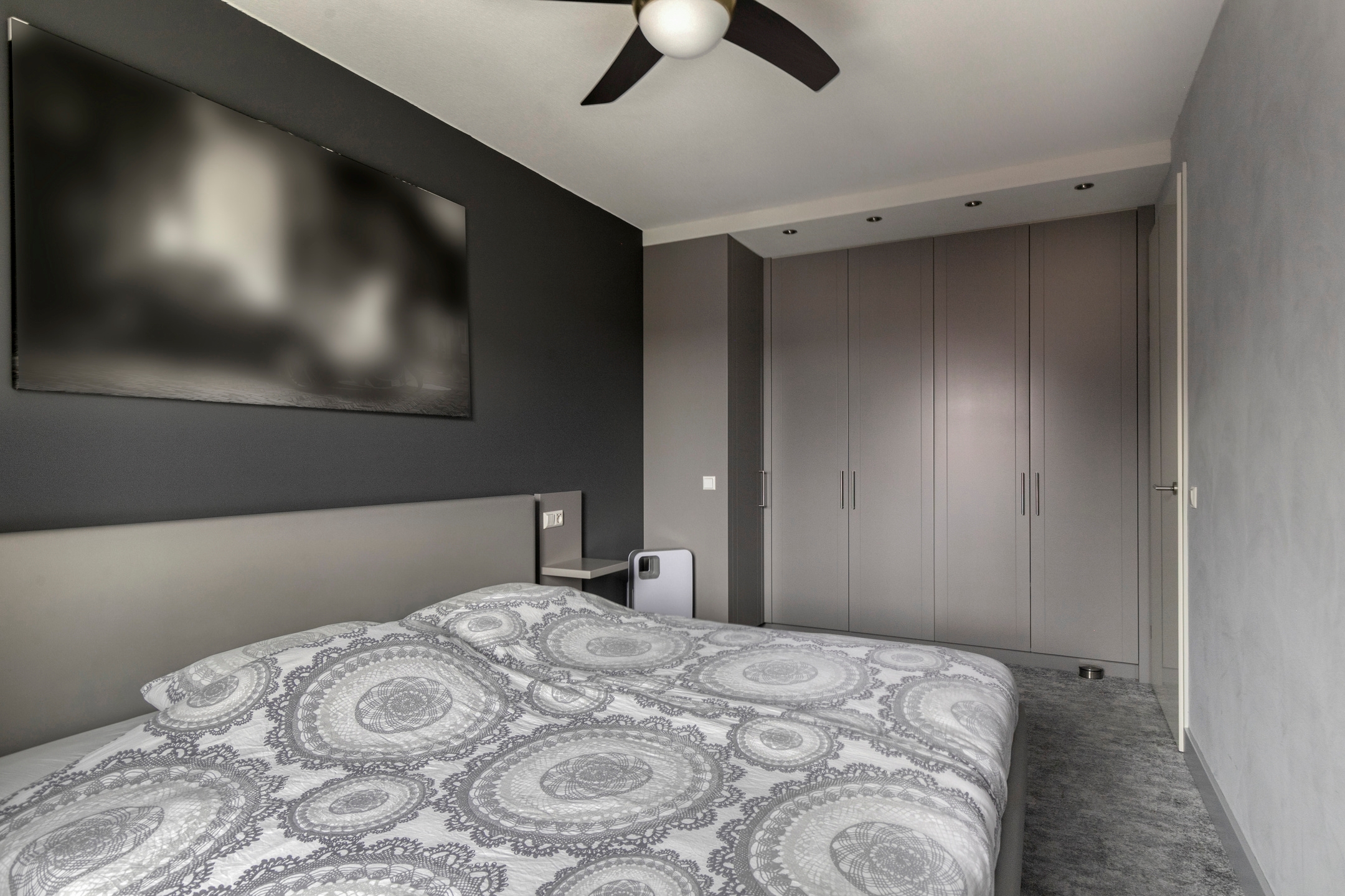 Slaapkamer 1, een ruime kamer, gelegen aan de achterzijde, voorzien van een maatwerk kastenwand met verlichting, ingedeeld met hanggedeelte en laden.